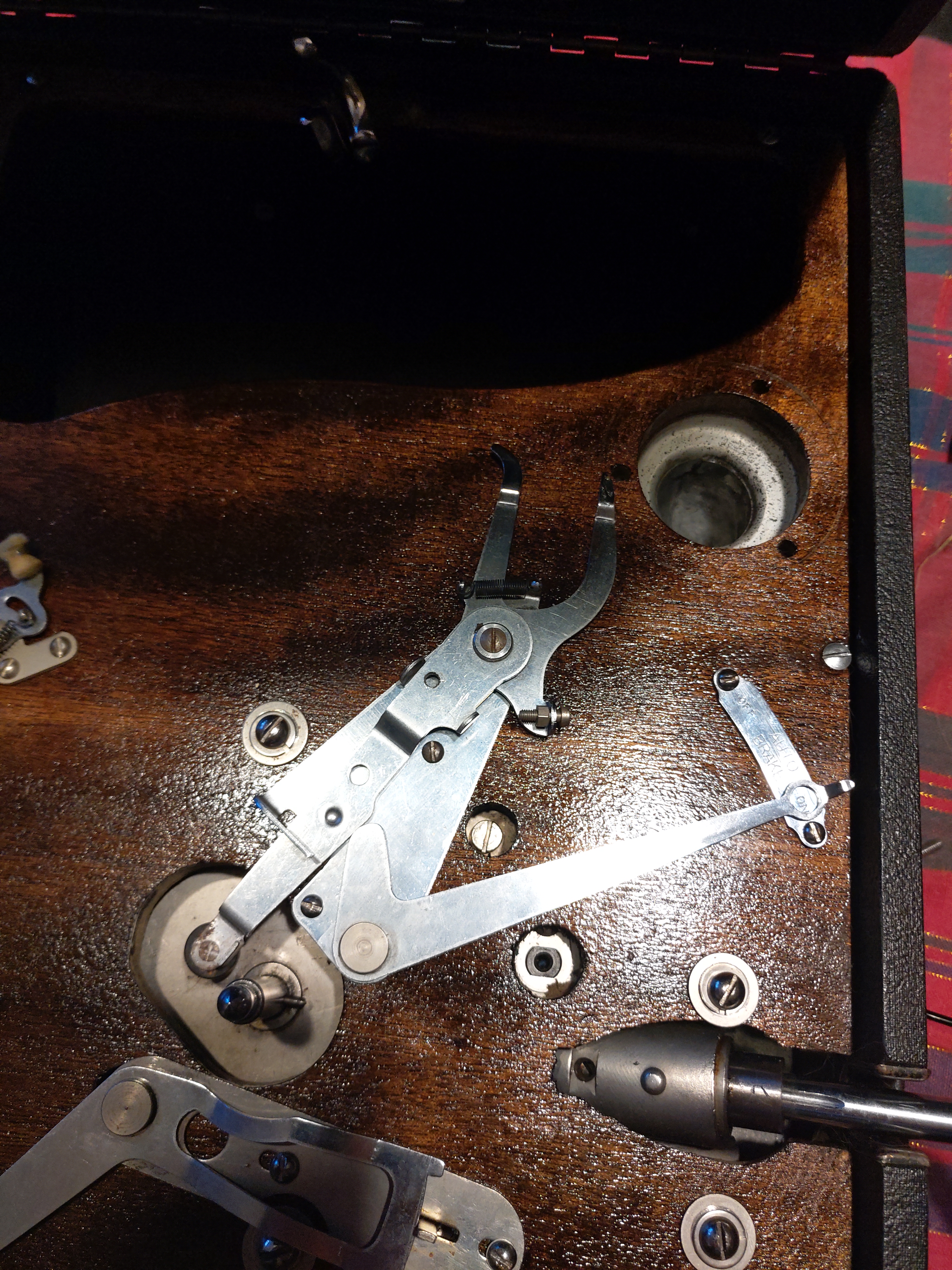 Here are photos of my own example, one far to the right (the soundbox falls out of the case) and to the left. You see the positions. The tonearm has also a fork, not a single finger, TWO fingers: one short (the right one) and one long (the left one). The short finger always falls at the right of the fork, and it is the long finger which must be between the brake fork legs.
