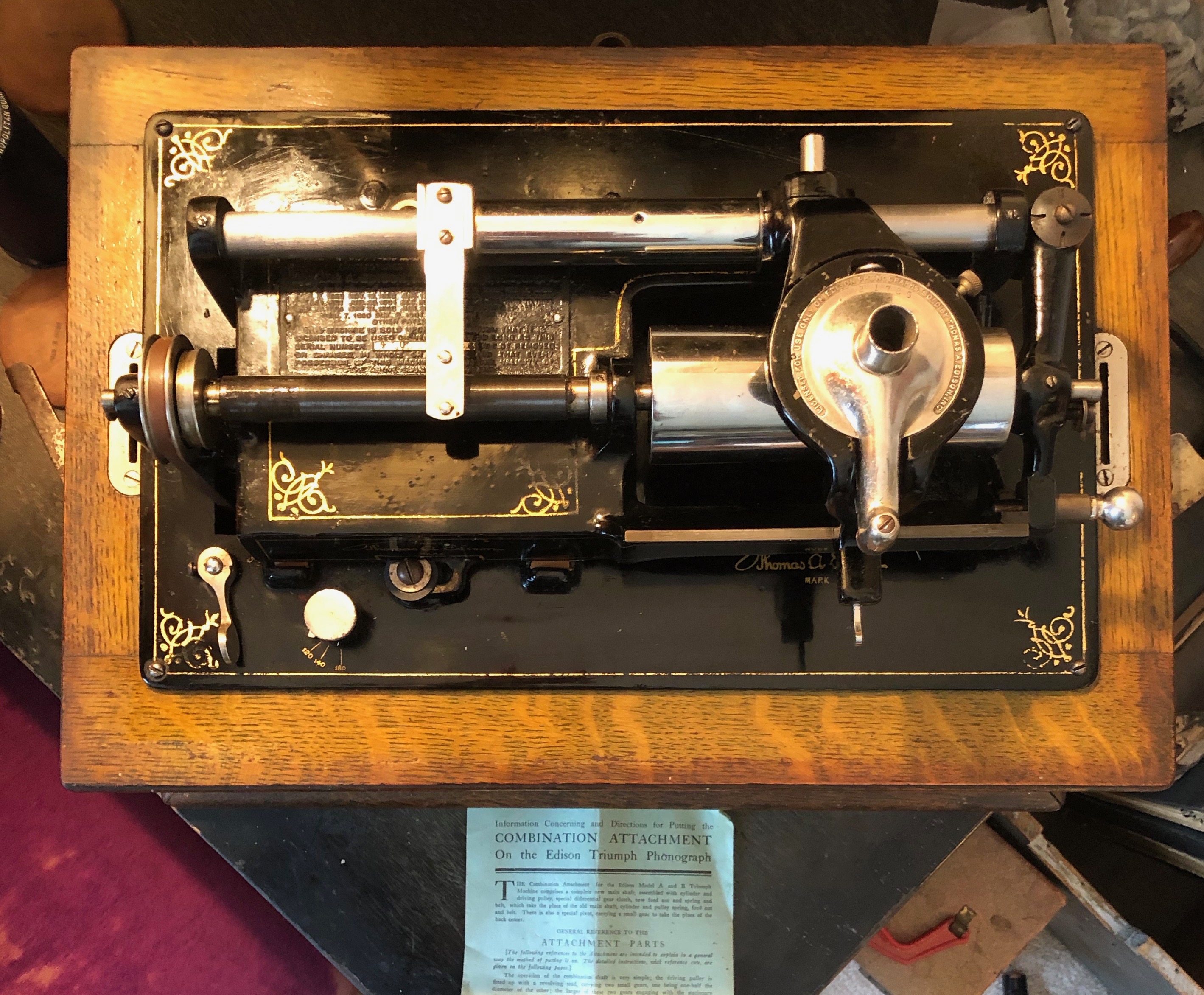 What was more interesting was that it had also had a motor upgrade. If you look back through the Edison Phonograph Monthly issues, you will find an announcement about upgrading the early Triumphs to include a 4-ball governor. The Triumphs did not come with a 4-ball governor until Model D. This particular phonograph has that upgrade. It wasn't as simple as replacing the 3-ball governor with a 4-ball one. It also required replacing the the motor frame. Obviously, this was a pretty serious upgrade. One wonders how many were actually done. Below are some pictures.