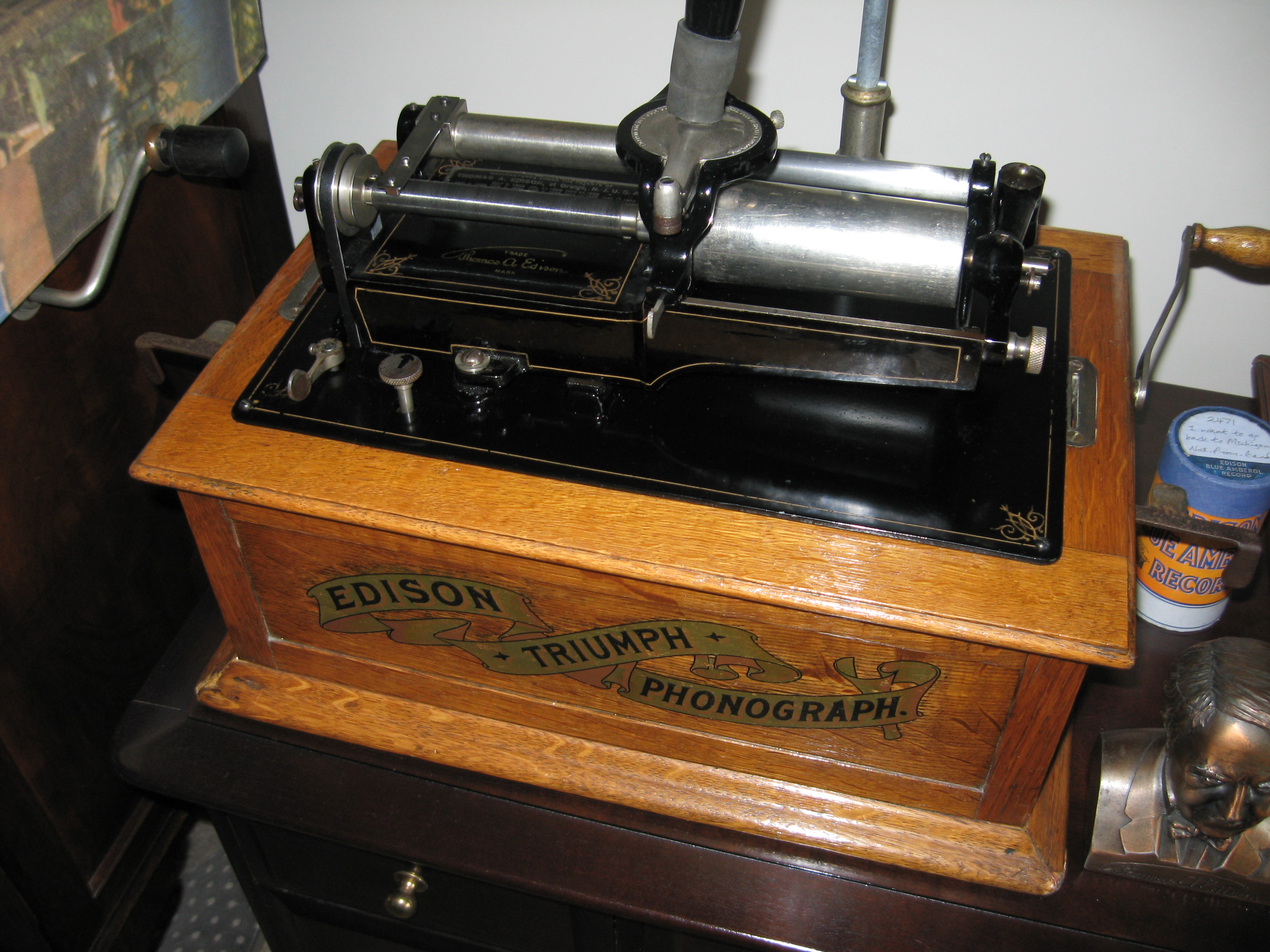 I have Triumph Model A, serial number 30136. A while back, when George Paul was collecting information on Triumphs, we discovered that mine was the earliest known Triumph Model A. I don't know if an older one has been found since then. I traded a banjo neck for this Triumph back in the 70's. It was converted to play 2/4 minute records when I got it and had a Model O reproducer.