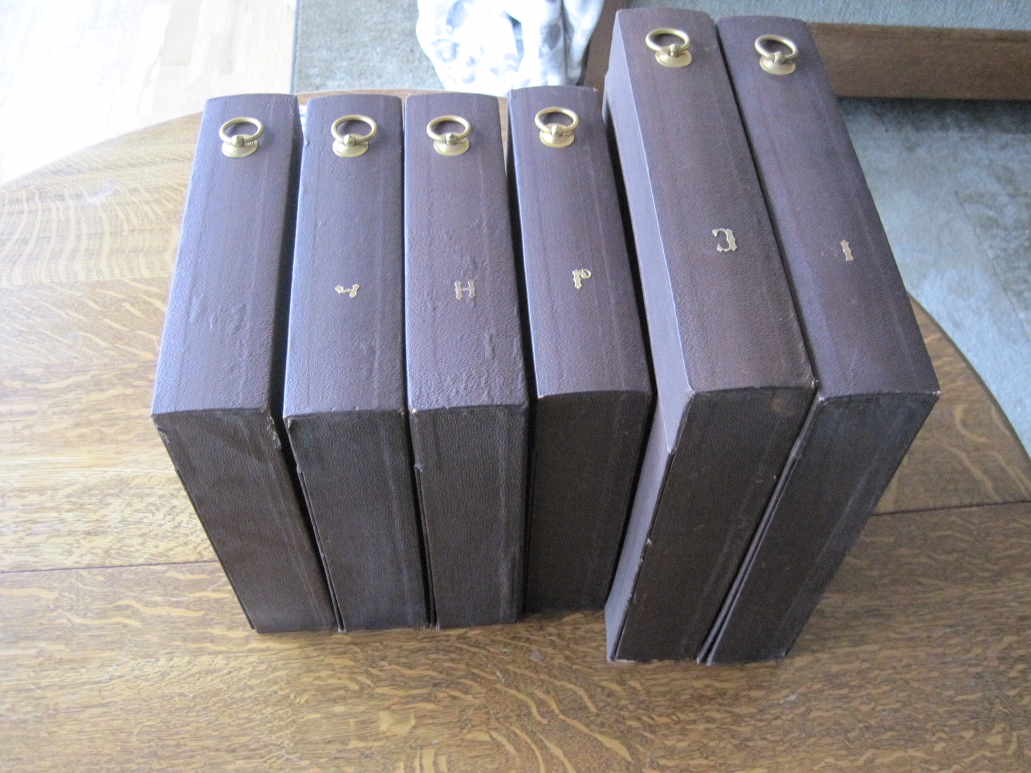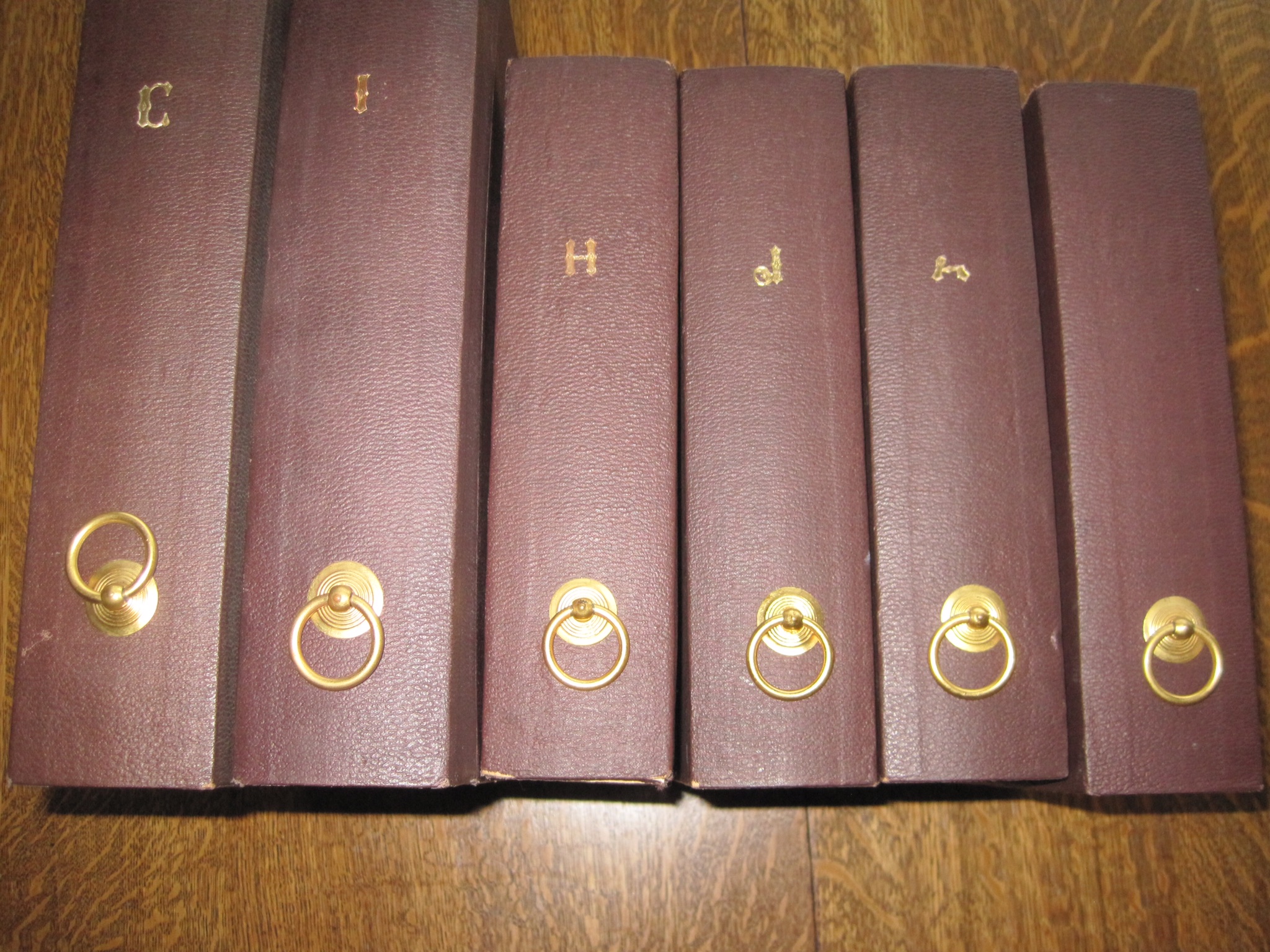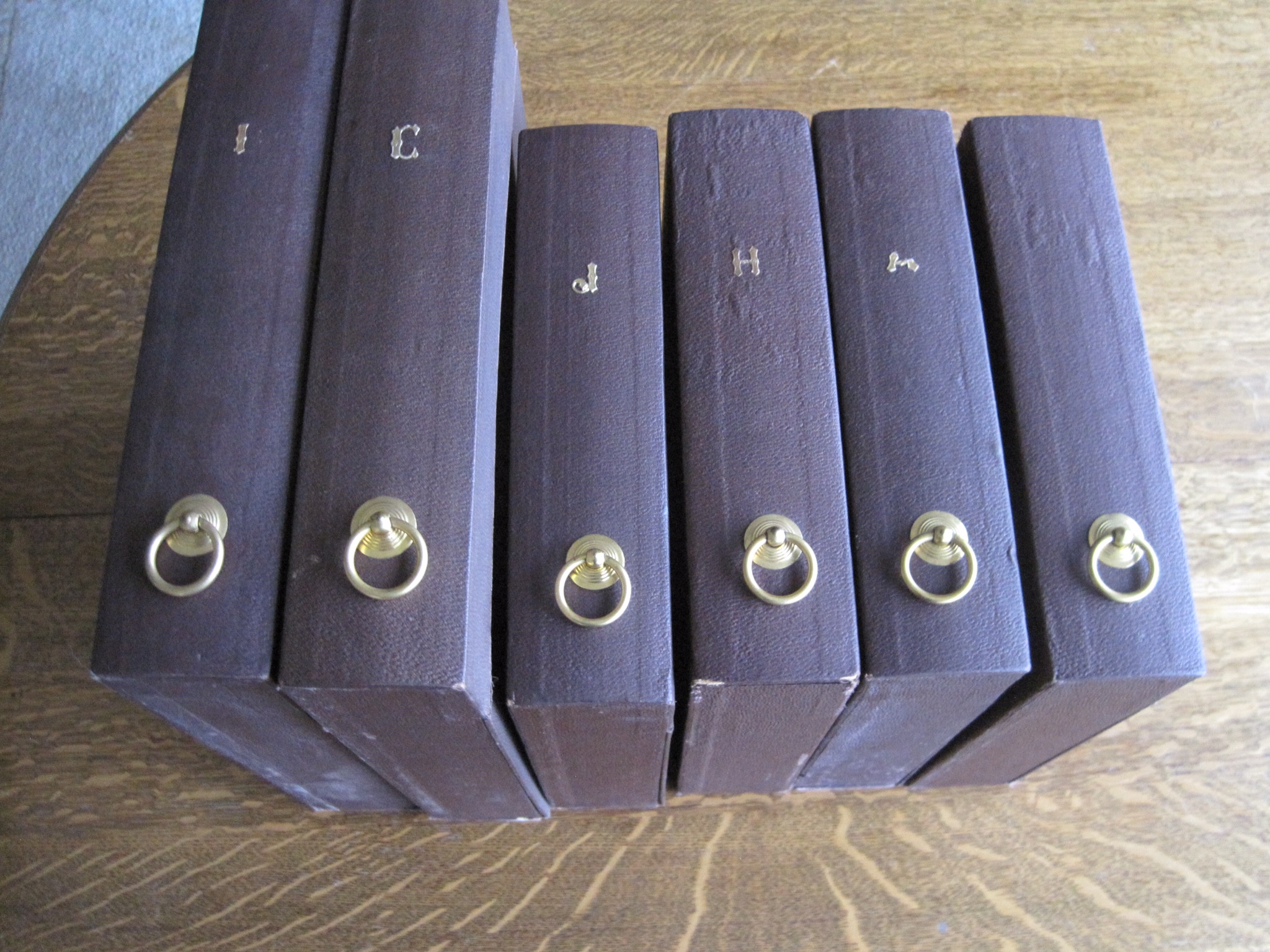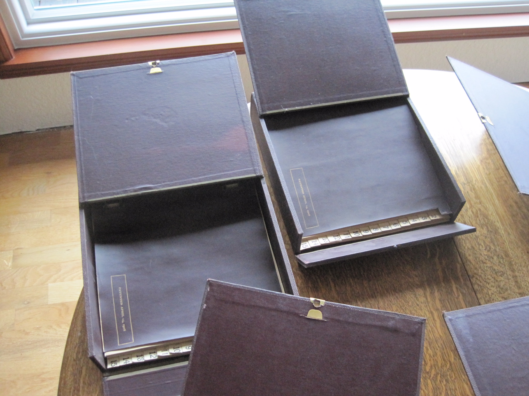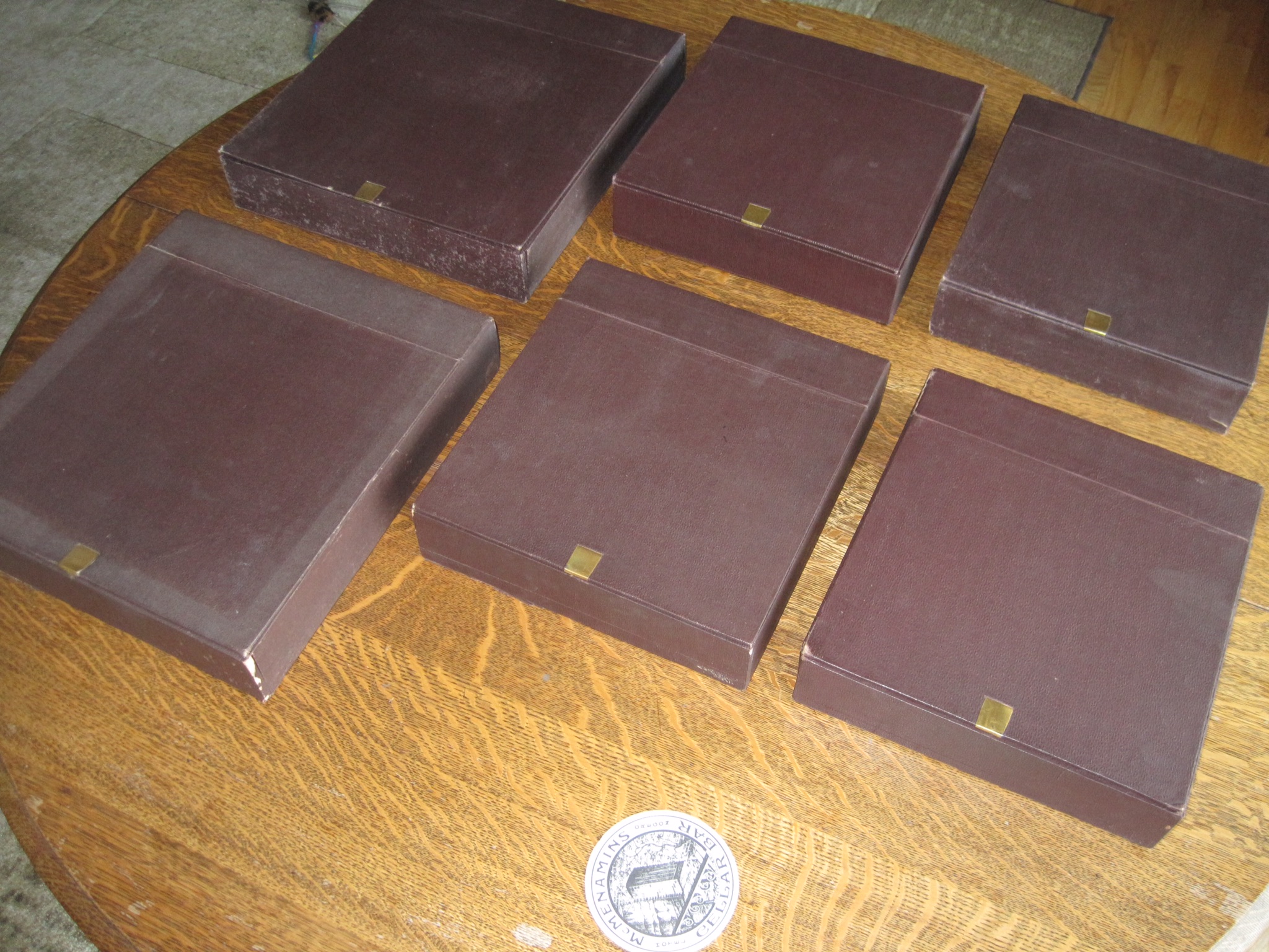 The J and H boxes are in the best condition. The two other ten inch boxes are a close second with one missing the letter designation and the A box letter only partial. The 12 inch C and I boxes are in good condition but do show they have been handled more often with the clasp on the C box not catching as strong as the others. Overall a good incomplete set that presents well. The J and H boxes are 40.00 each. The rest are 35.00 each. The whole set 200.00 plus shipping.