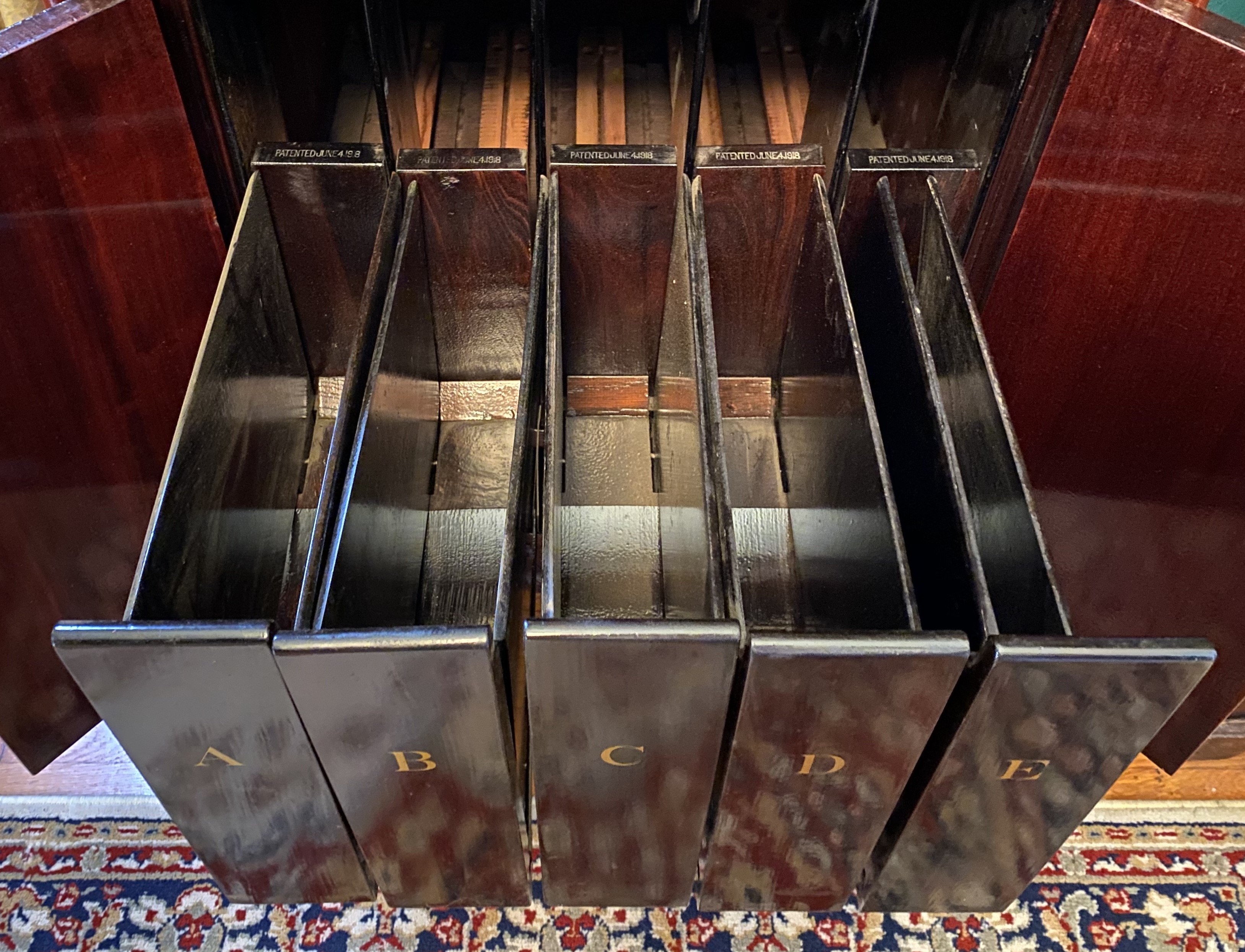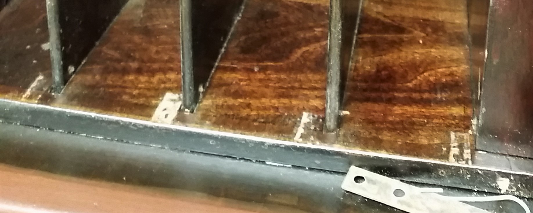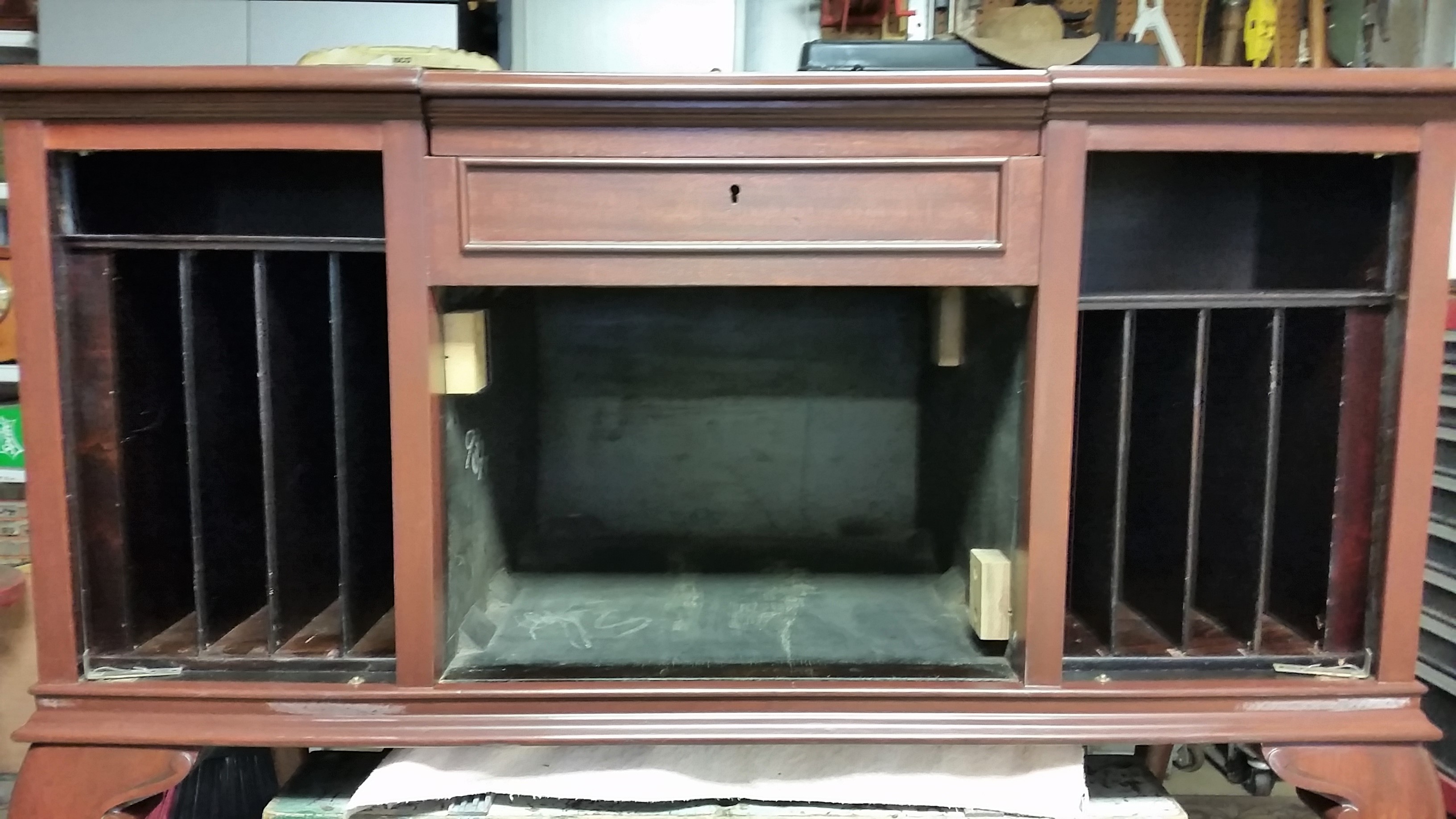 My current project is restoring a Stratford console. I have been working on the machine for about 2 months now mainly on the cabinet woodwork. I have been trying to research the disc storage system which my machine is missing. Everything so far that I have found has not been for the Stratford model and consists of wooden drawers for various models. I am puzzled at this point wondering what my machine used. I have observed some witness marks from what I have but wonder if what I have found pertains to what I have found in my research. Here is what I have. The right side of storage consists of four slots for 10" disc's based on height of the slots and a back stop mounted to the floor of the cabinet, the left side supports 4 slots, 12" height but the back stop has 2 slots for 10" and 2 slots for 12". The only witness marks are small 1" wear marks on the front right hand side of each slot. No holes for mounting anything anywhere in the body.