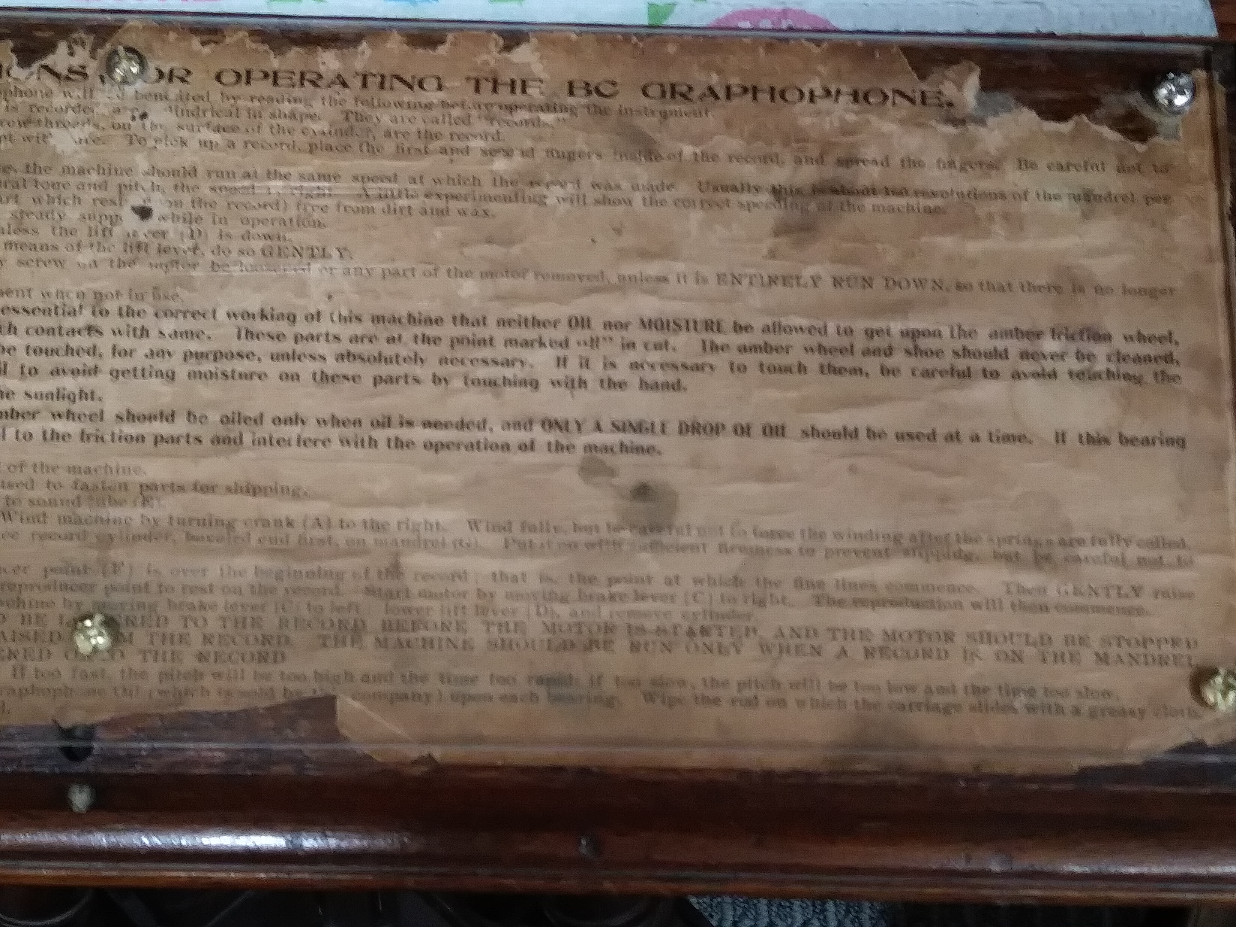 Hello all, made another attempt. I took the protective plate off of the drop-down door on the BC Graphophone. I tried to take a better photo. I don't have a real camera. Maybe someone can properly crop this photo. The label is in poor shape at best. This is about all I can do. Best, Lee