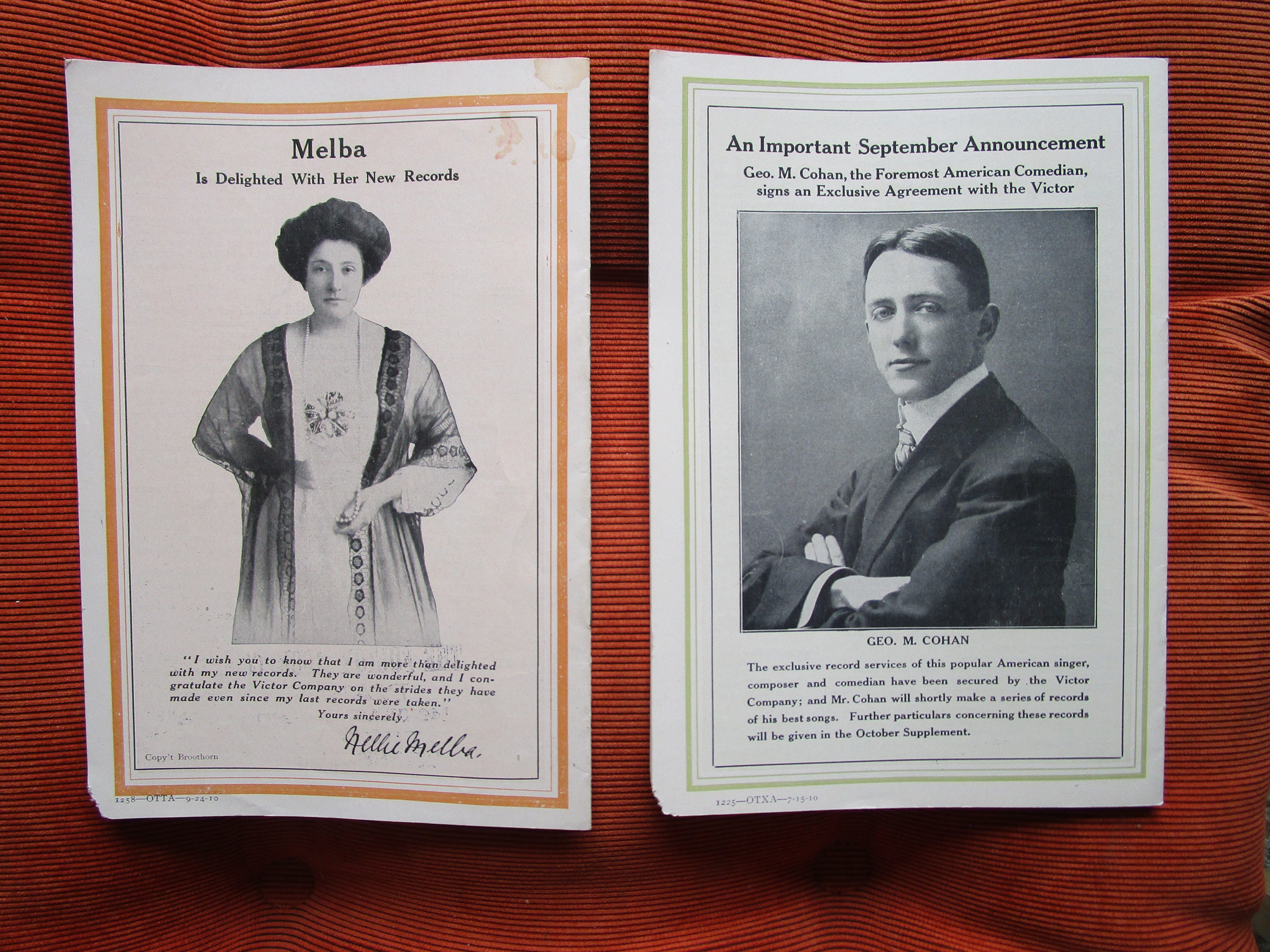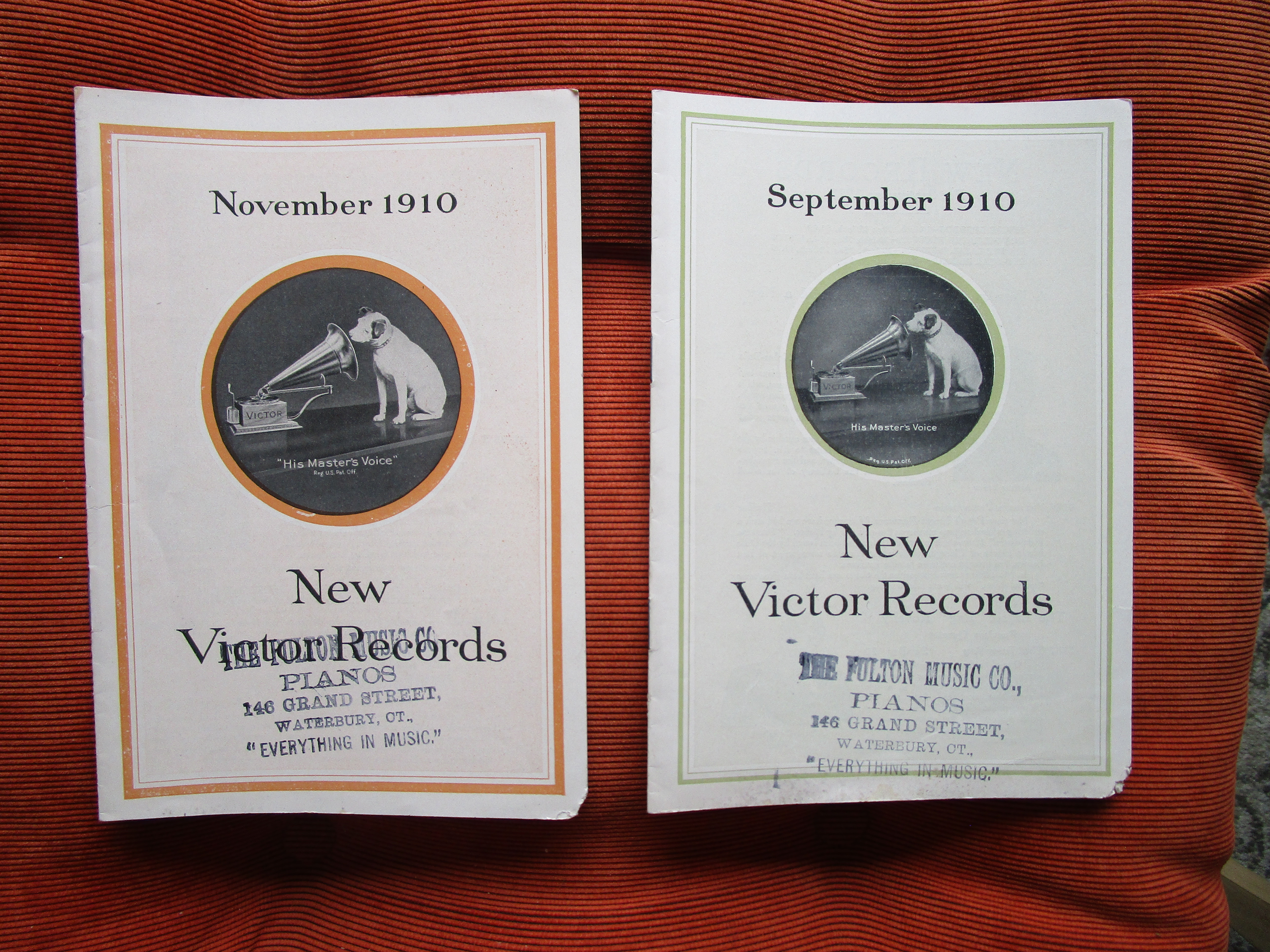 7. Original 1910 New Victor Records monthly with original Victor dealer stamps 'The Fulton Music Company' Waterbury, CT. $20 for both