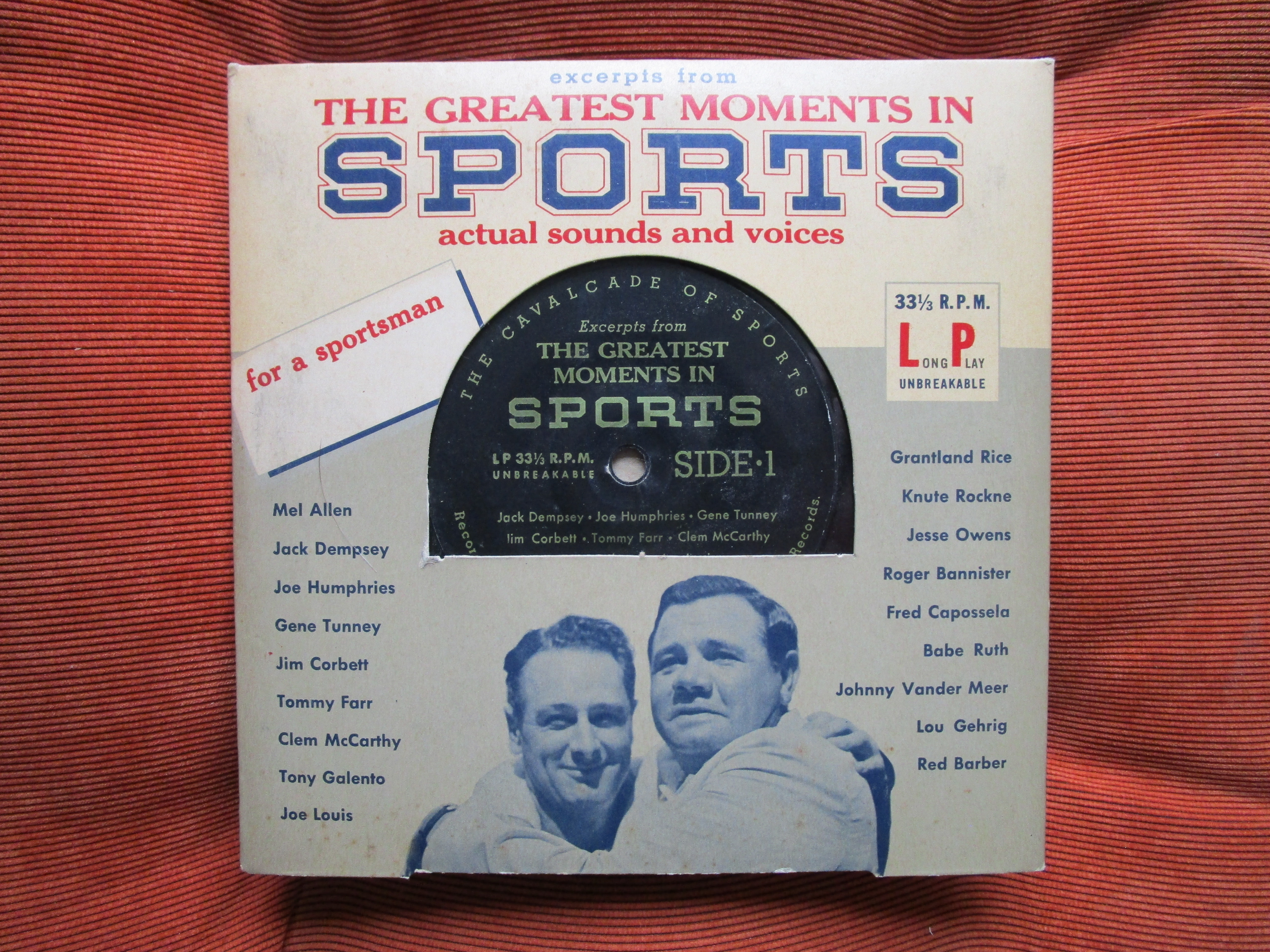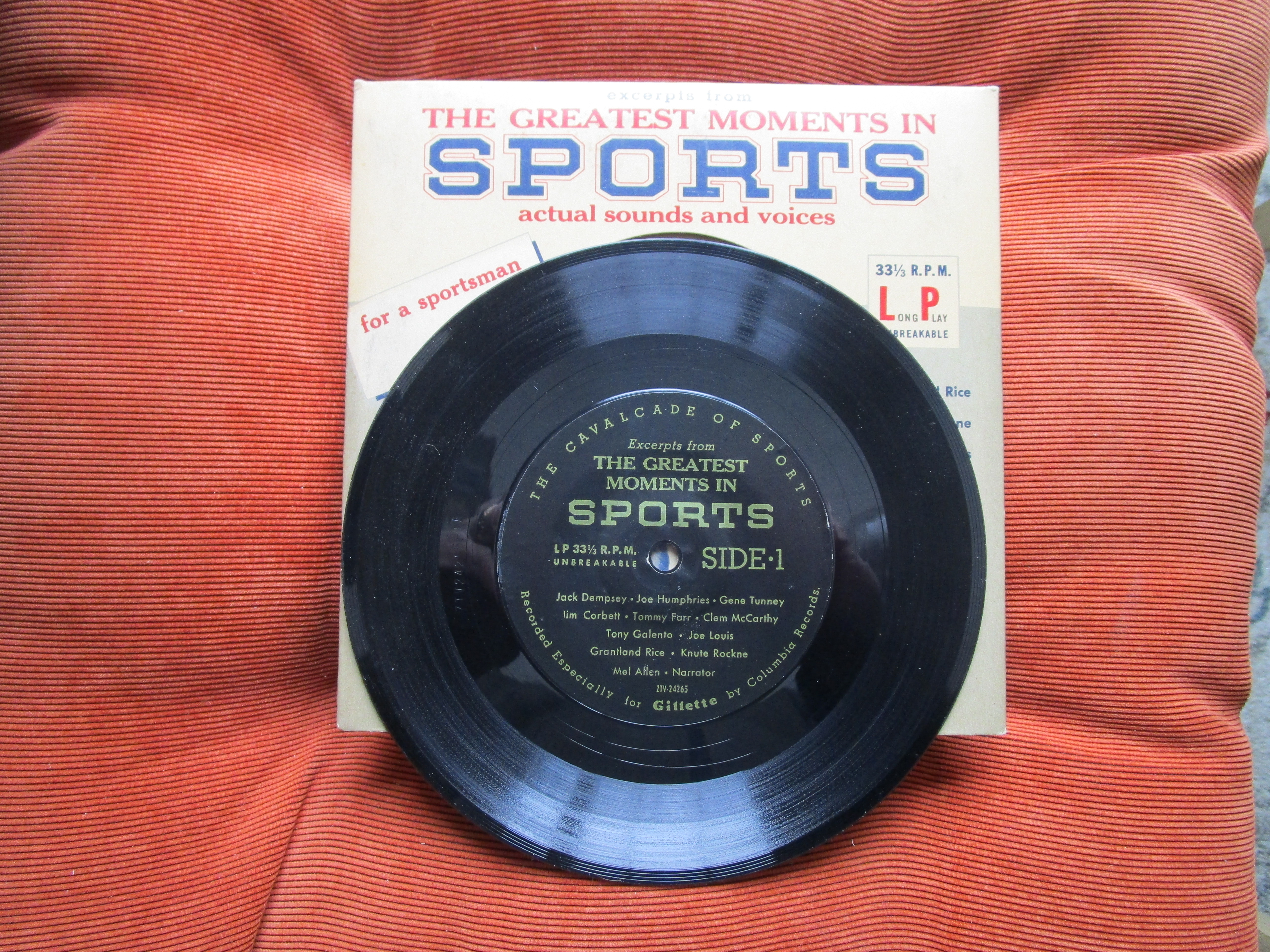 4. Greatest Moments in SPORTS 7" LP (voices of Babe, Lou Gehrig, Jack Dempsey, Knute Rockne, Gene Tunney, etc.) - $15