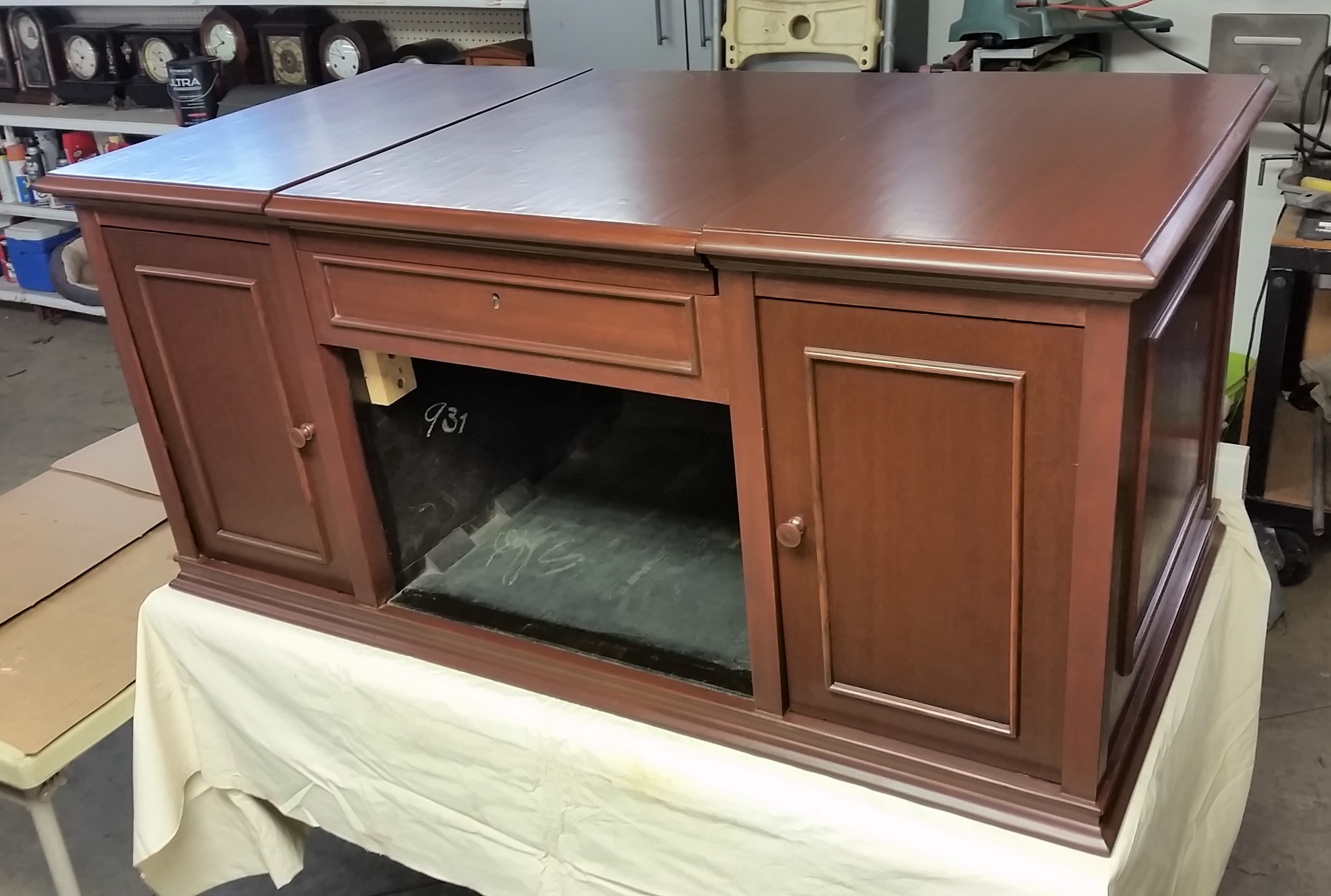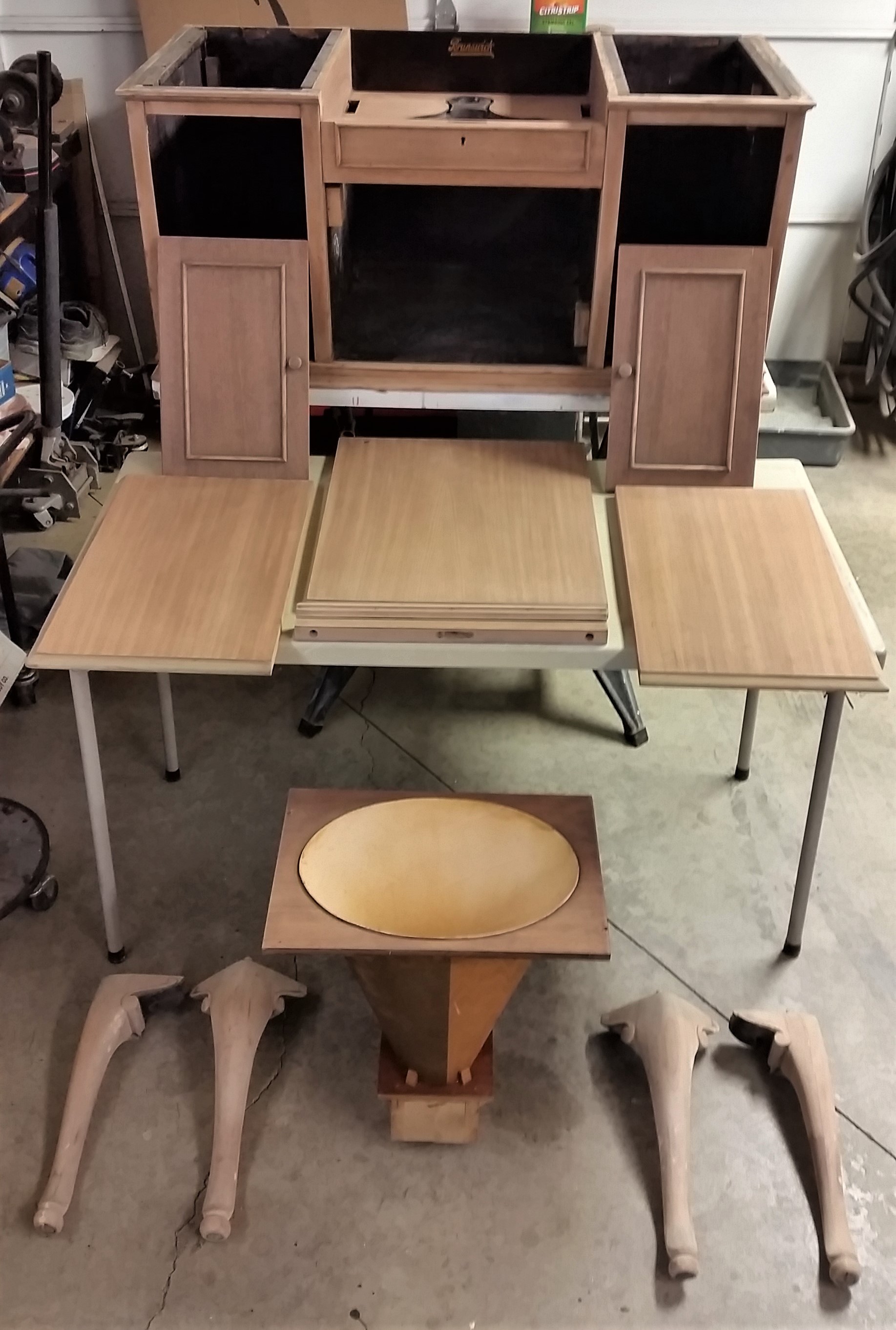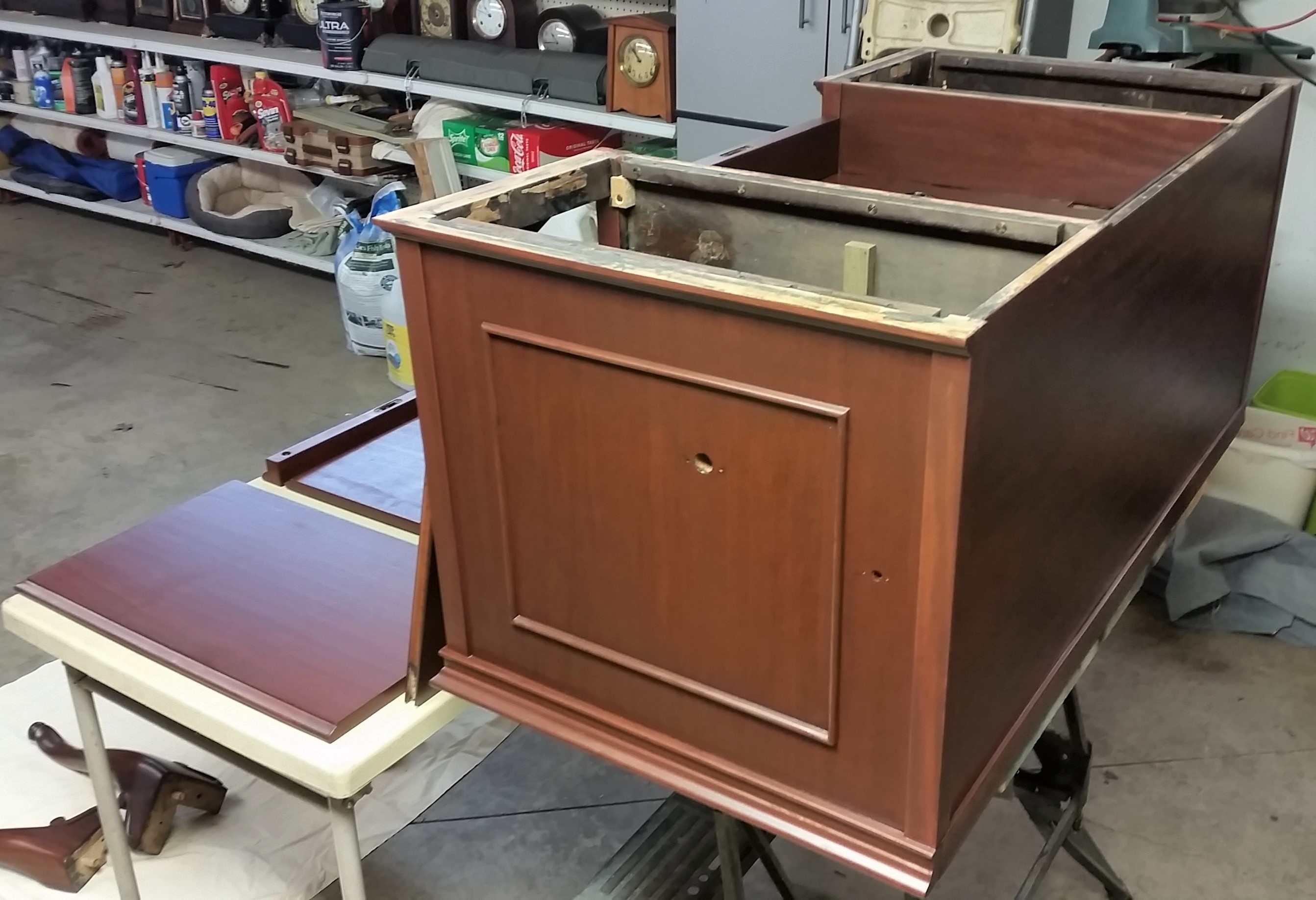 Well I have been working on my Stratford for 2 ½ months. The majority of that time on the console cabinet. The machine was complete except for the center of the horn grill and the disc folders were missing. Someone had attempted to refinish the outside of the console but probably got in over their head sometime in the past, only working on the front, sides and top. It had striper runs down the back and a couple runs down the inside of the play area.