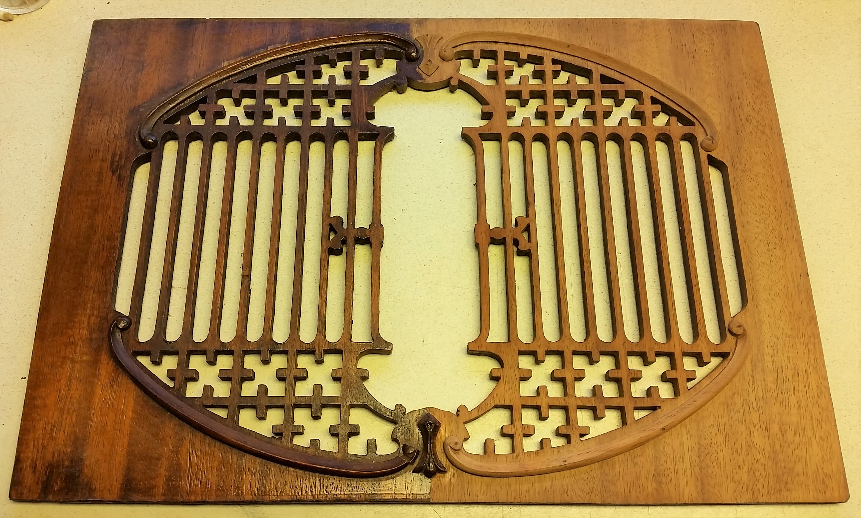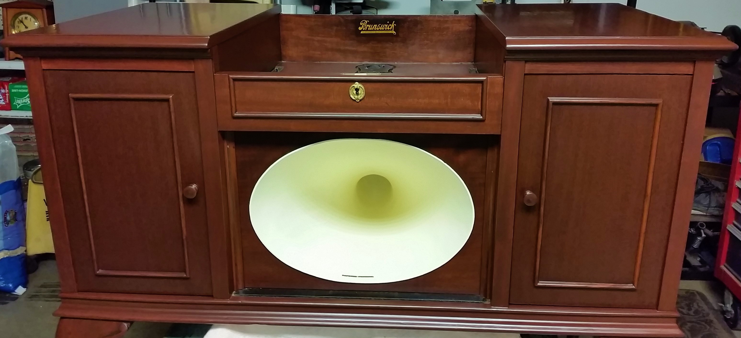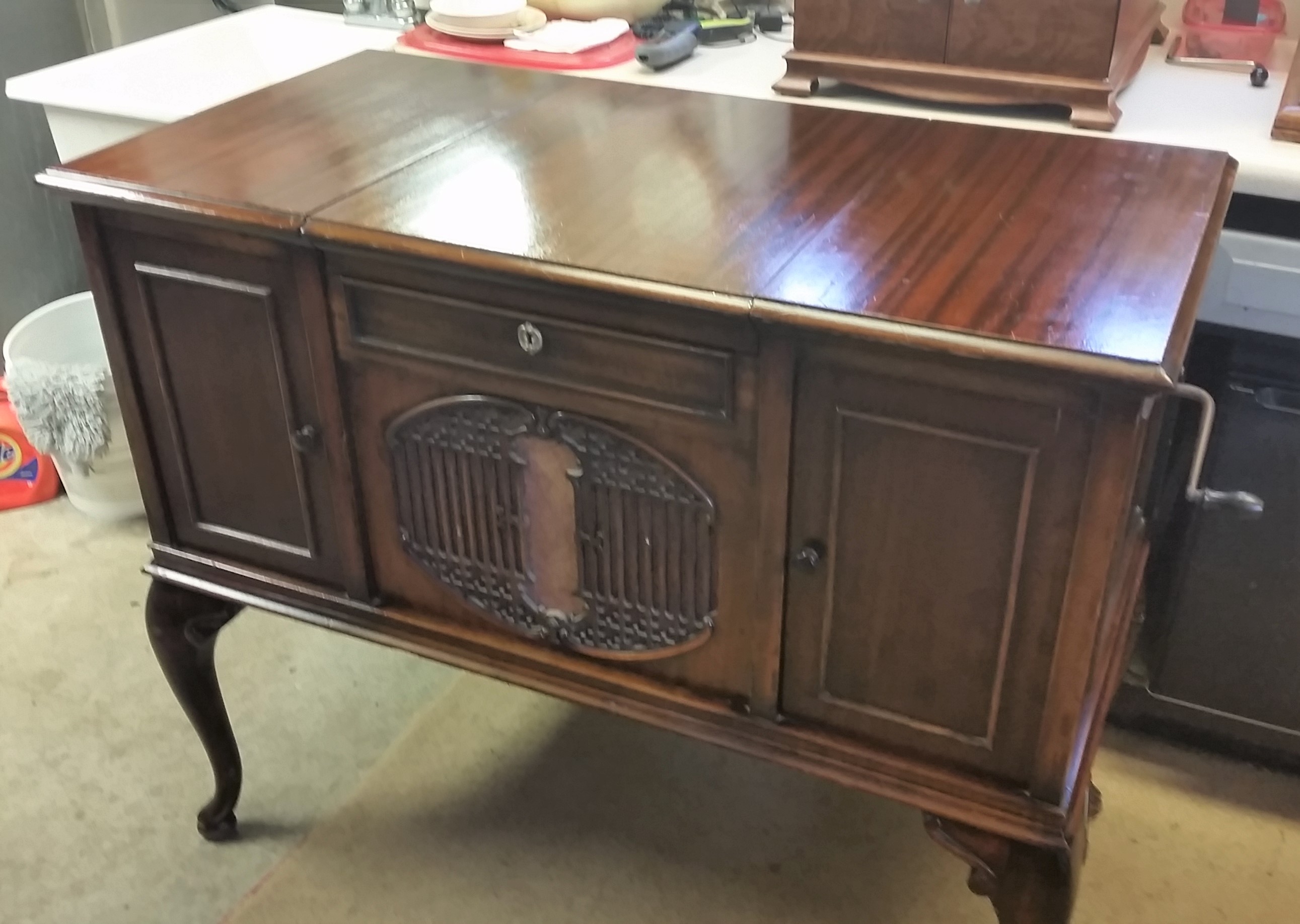 Well I have been working on my Stratford for 2 ½ months. The majority of that time on the console cabinet. The machine was complete except for the center of the horn grill and the disc folders were missing. Someone had attempted to refinish the outside of the console but probably got in over their head sometime in the past, only working on the front, sides and top. It had striper runs down the back and a couple runs down the inside of the play area.
