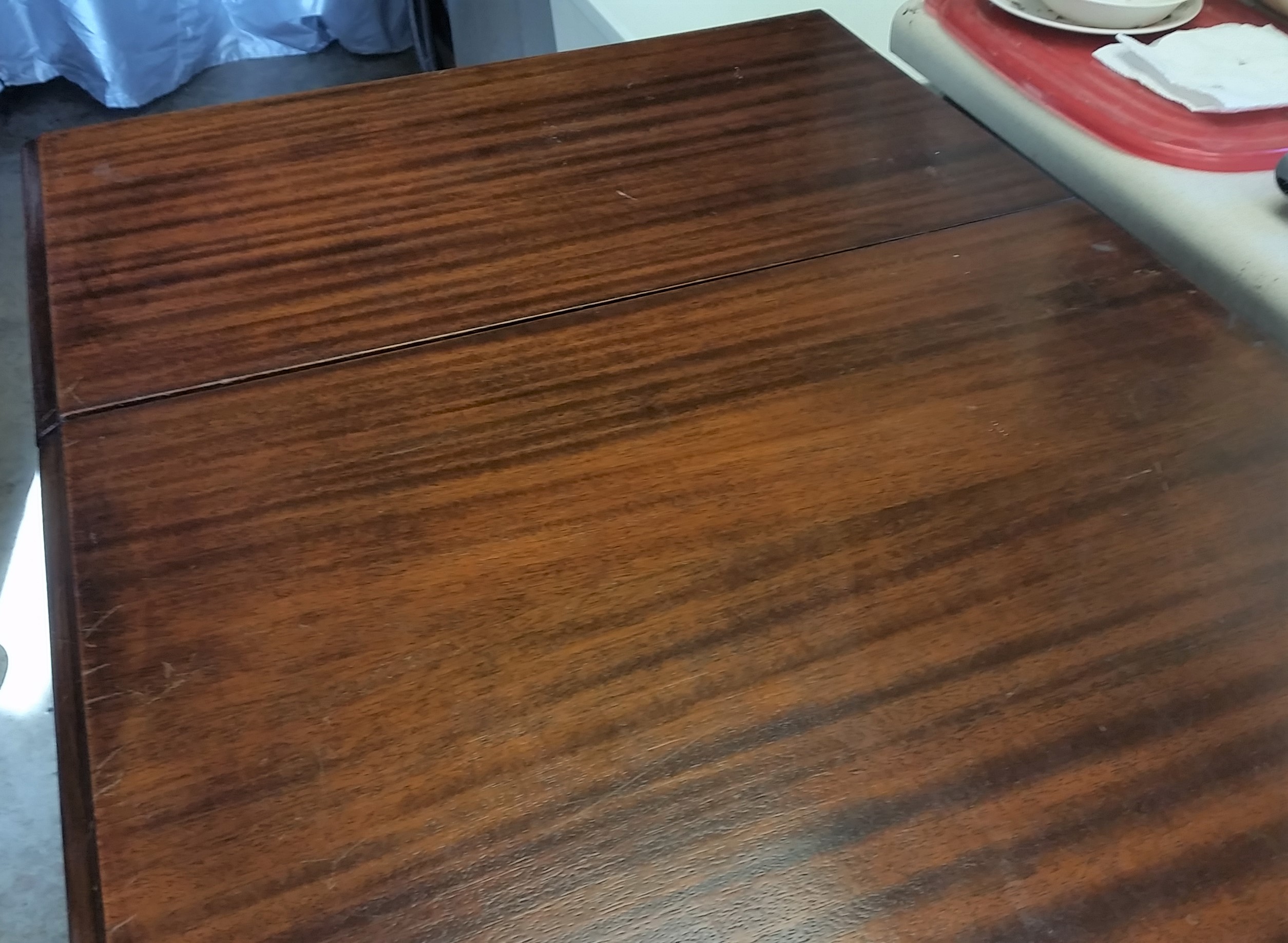 The rest of the panels were pretty straight forward but I did see the need to replace 3 small areas of veneer in the lid and left side were dents had gone through the veneer. Not having any mahogany veneer on hand and only needing about 1 inch square of material I removed veneer off of one corner of the inside back of the horn panel. It has aged along with the rest of the machine and should give me a close match as compared to new veneer. All of the pieces I hand sanded because the veneer was paper thin from the prior refinish.