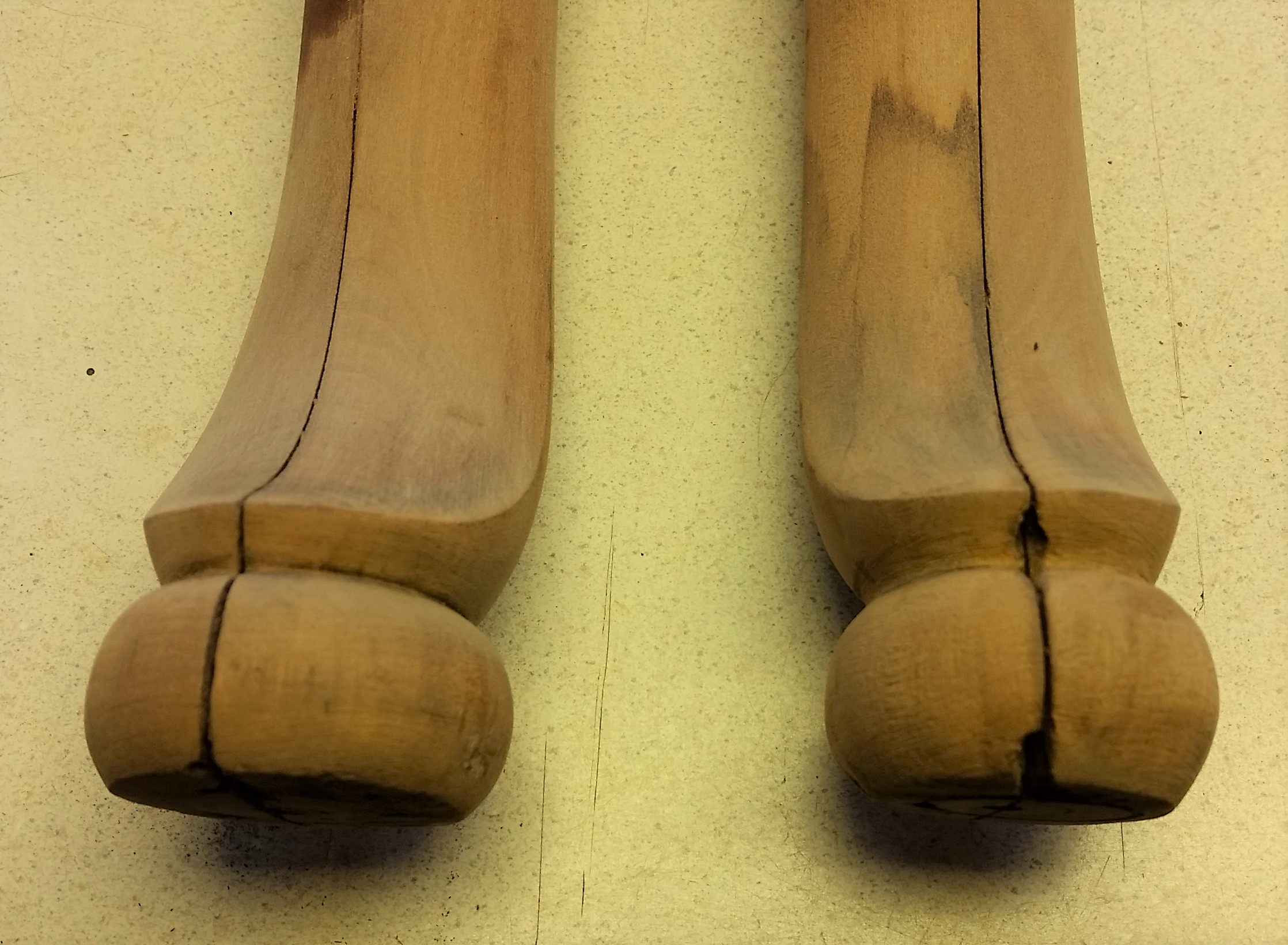Now the fun begins. After sanding I see that there are many more flaws in the wood than at first glance. First 2 of the legs have splits in the feet and chew marks on the inside of the legs, like someone's dog laid under it and used it as a chew toy.