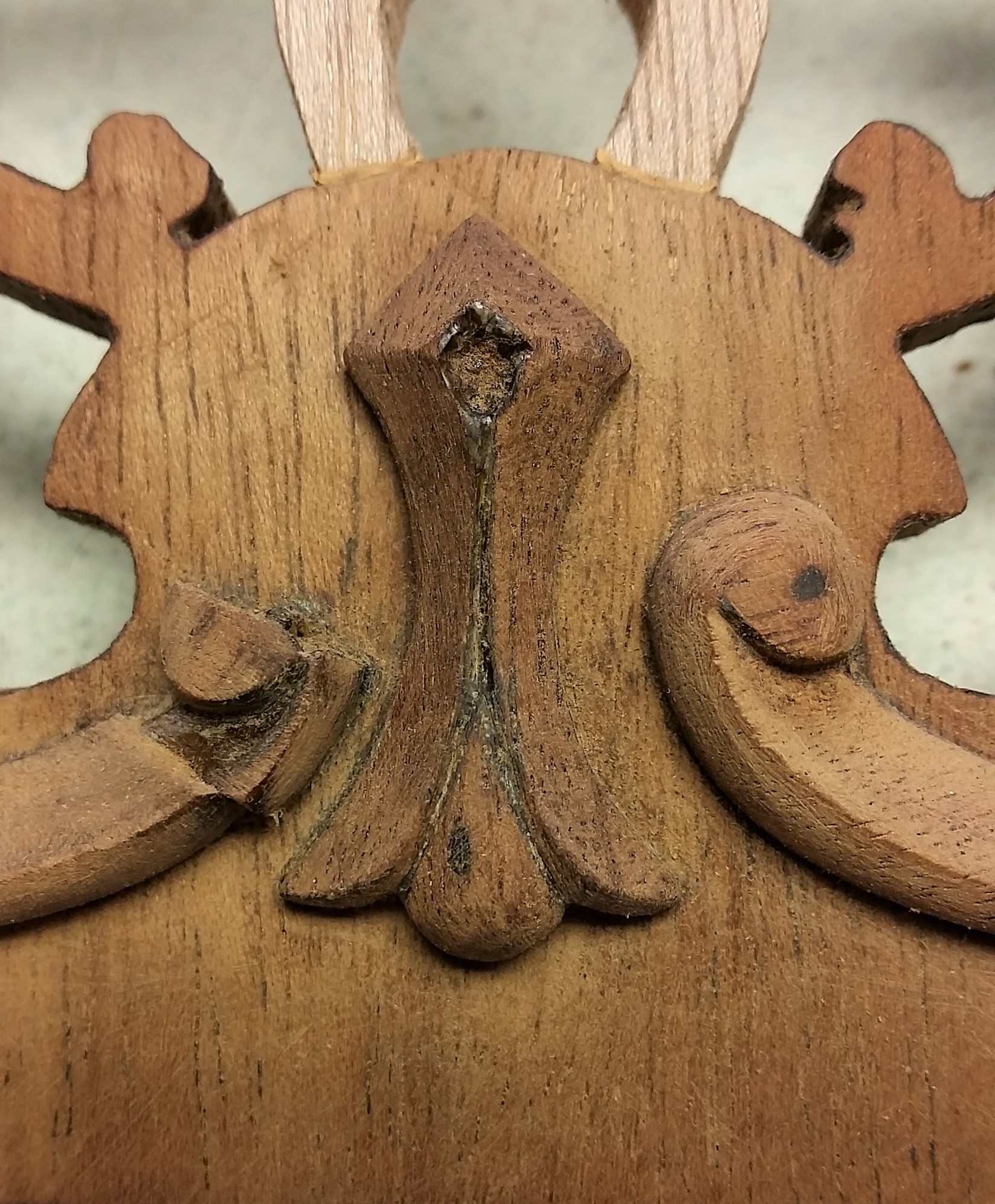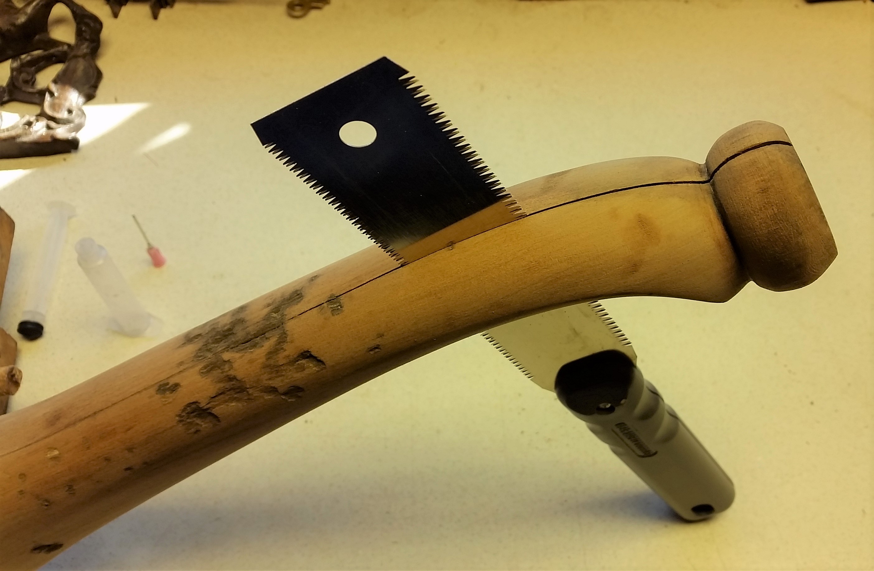 First I had to re-glue the splits which were in the jointing layers of the wood. I used my veneer saw to clean out any old glue and dirt from the split. Then worked new glue into split with a glue syringe and pallet knife and clamped them to dry.