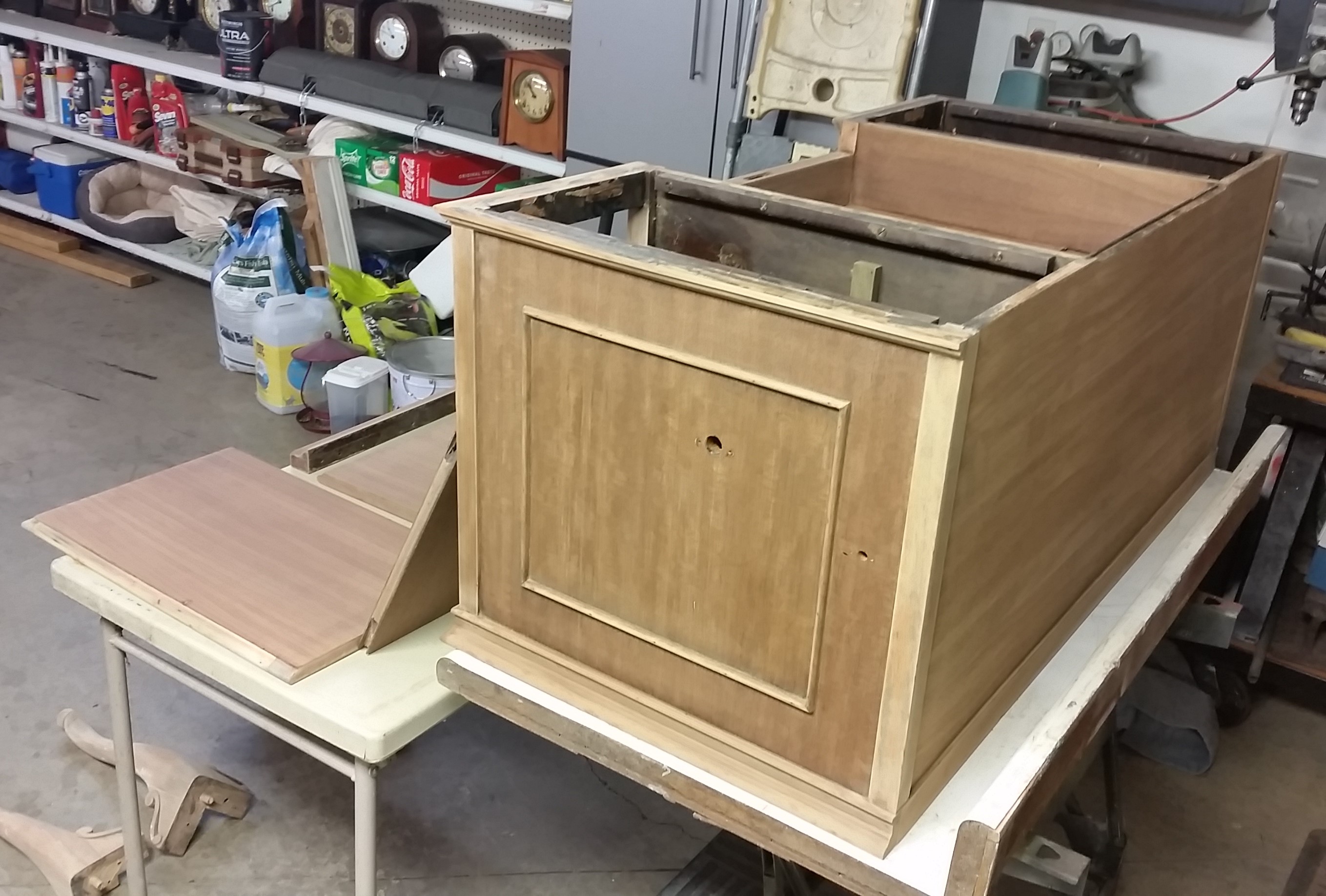 There were many dents, dinks and scratches all over the place but the veneer was all there and tight. I can see that the best course of action was to break the cabinet down and work on it a piece at a time. It took about a month to strip each piece and sand them down to be ready for stain.