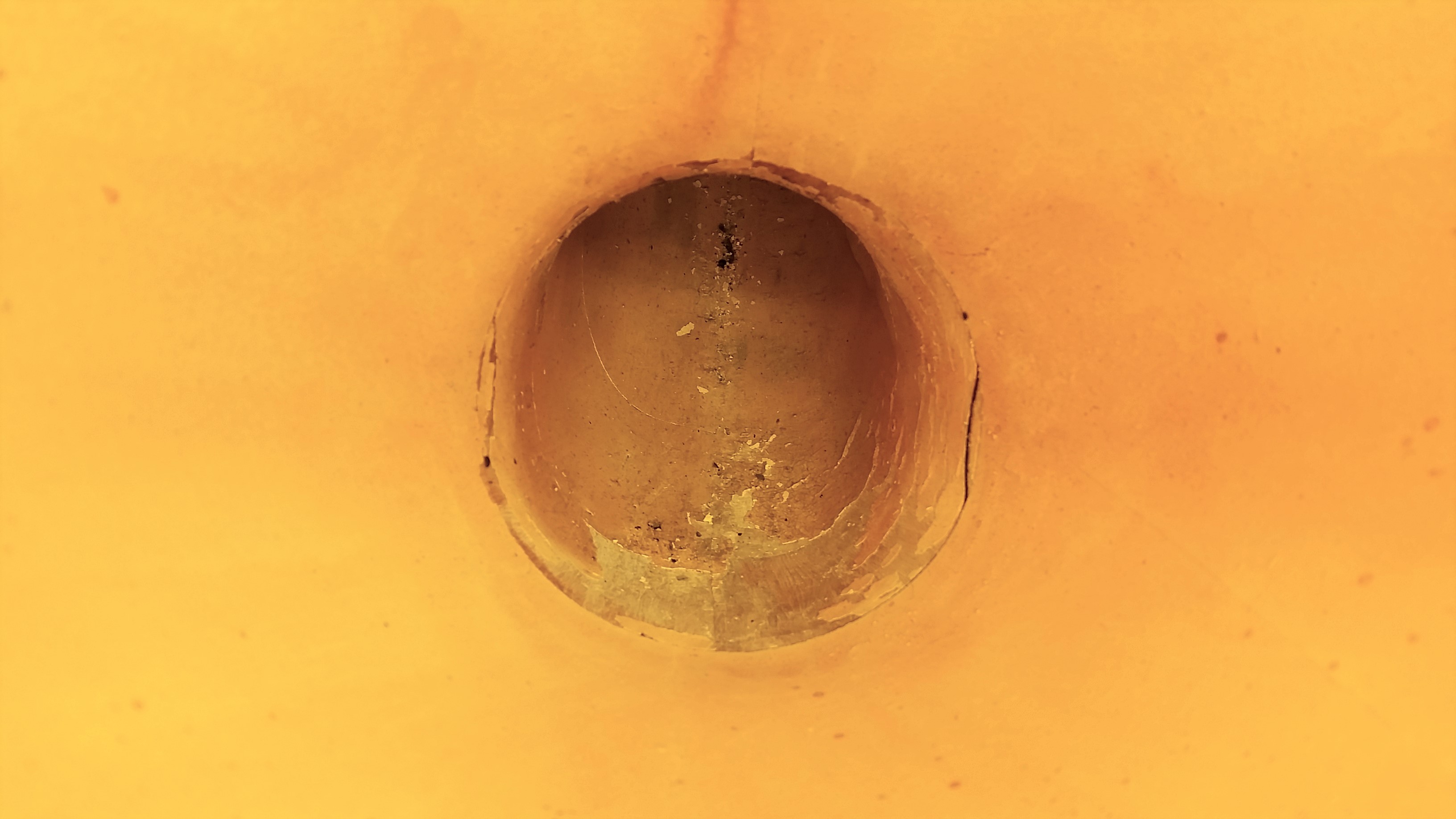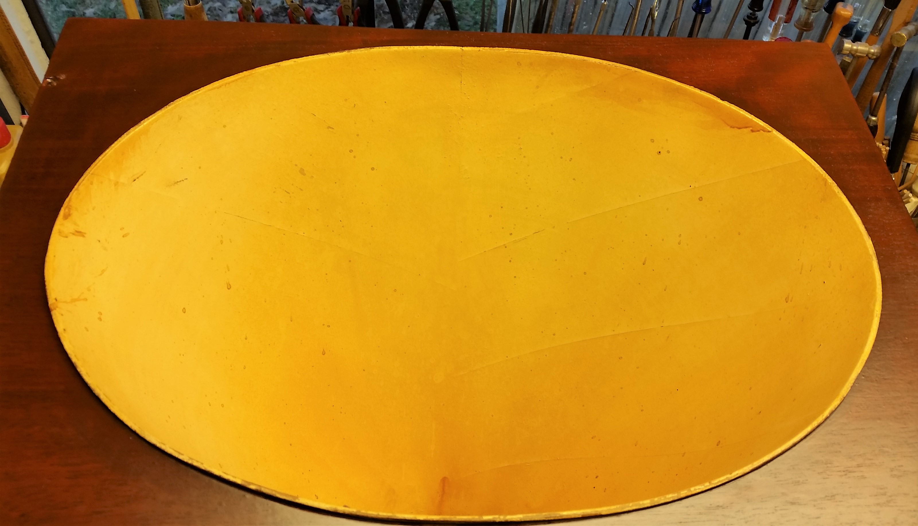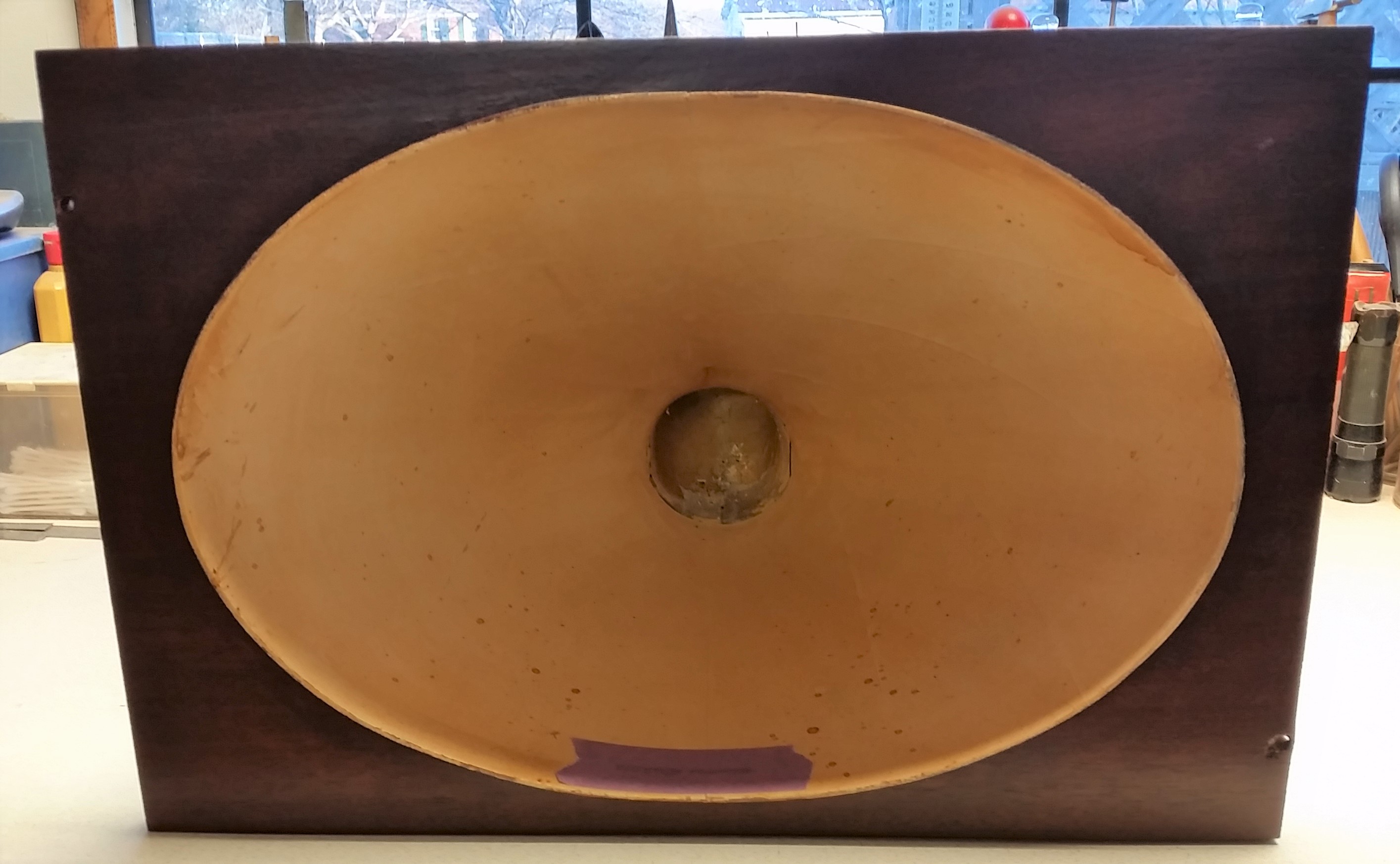 While continuing to give the cabinet additional coats of lacquer I started on the horn area. The horn had splash marks of shellac or varnish on the inside and a few paint splits in the seams of the throat and horn. I sanded the stains and varnish off to get down to the true color of the paint. Then I took a piece of paper and sprayed it with 3M adhesive. While finishing the sanding I took the paint dust and coated the paper with it. This will be the paint swatch I will use to match a satin finish paint to restore the horn to as close of the color as I can. It is about a cream color and was easy to get a swatch at the paint store.