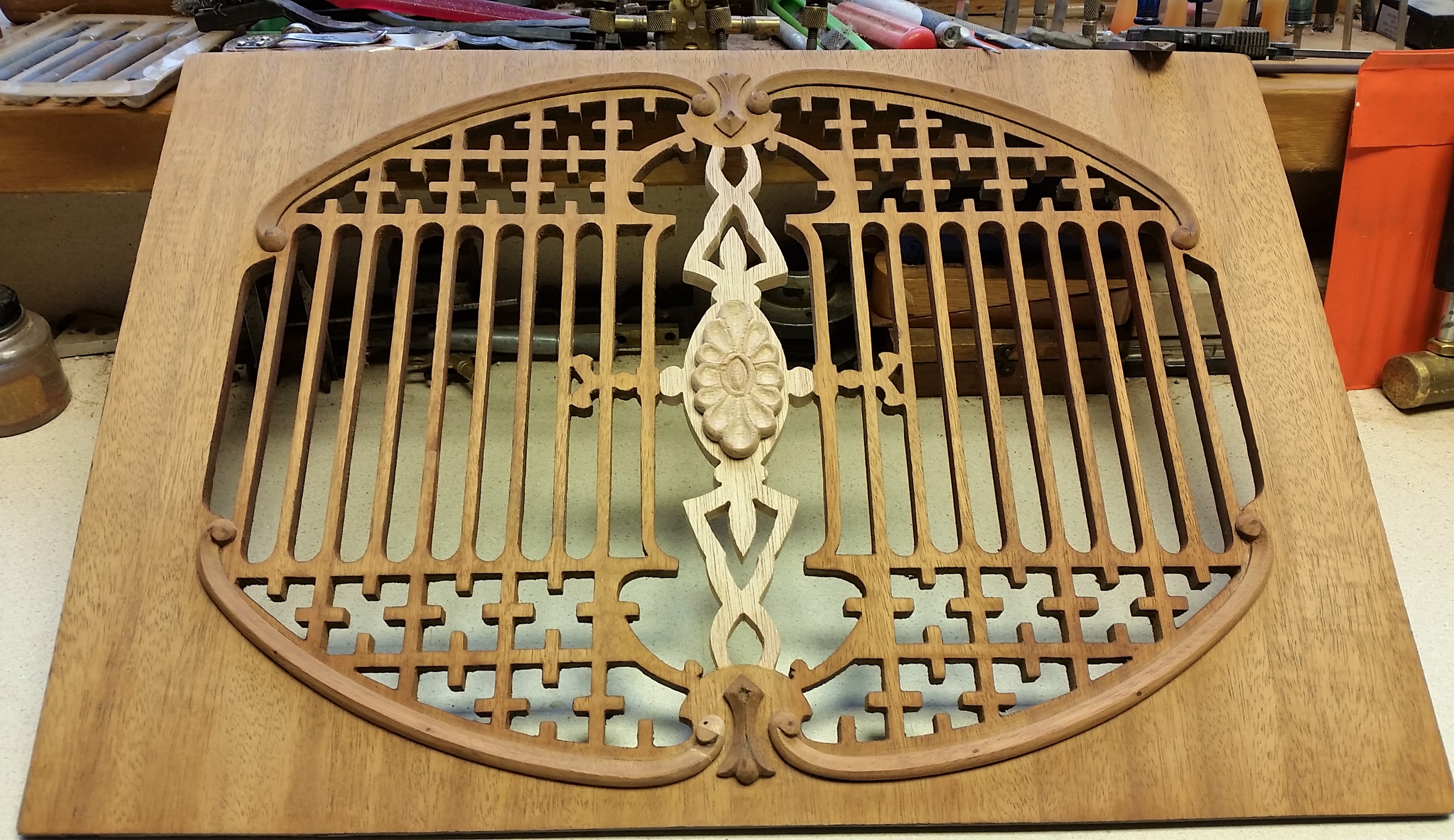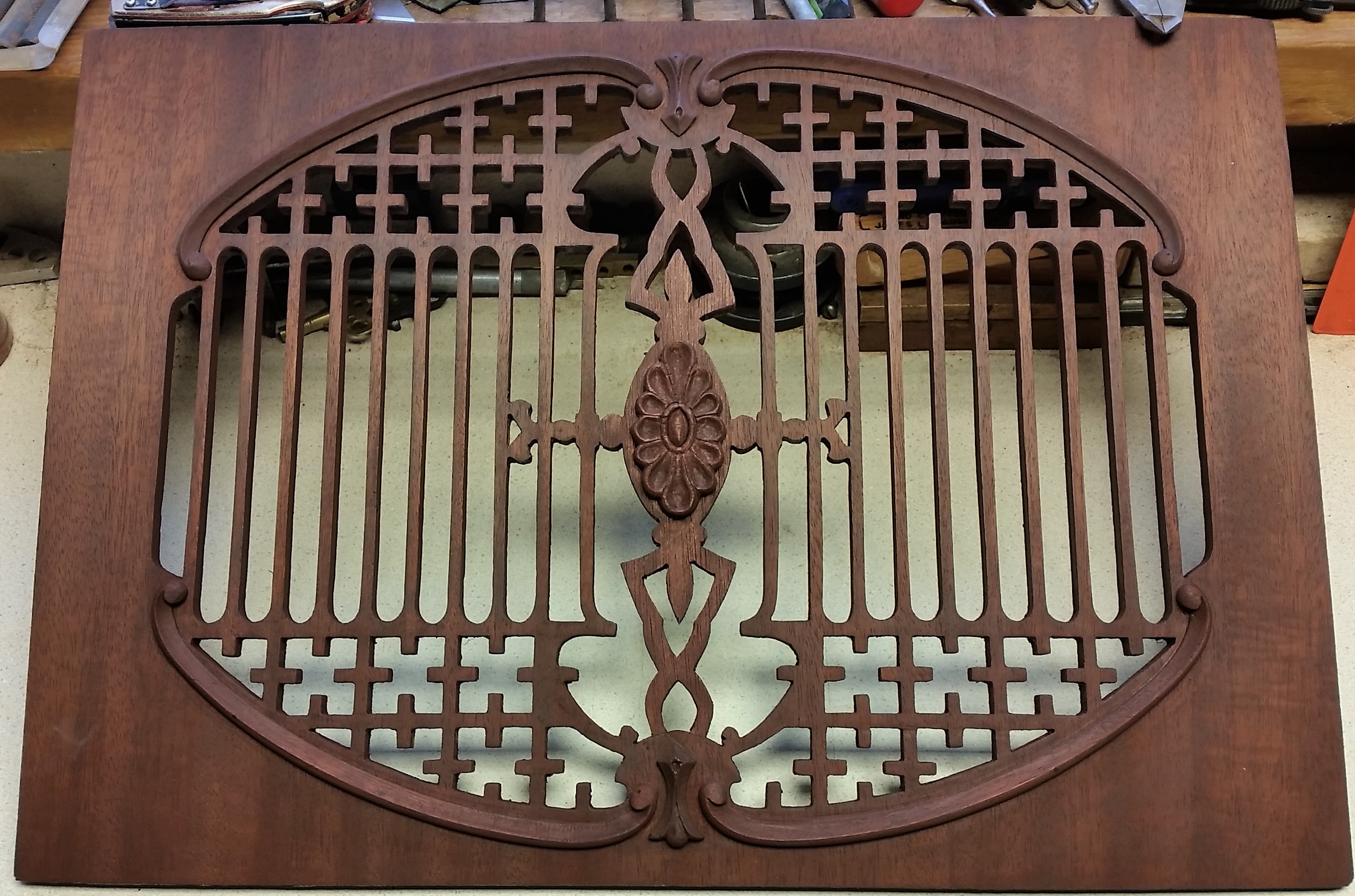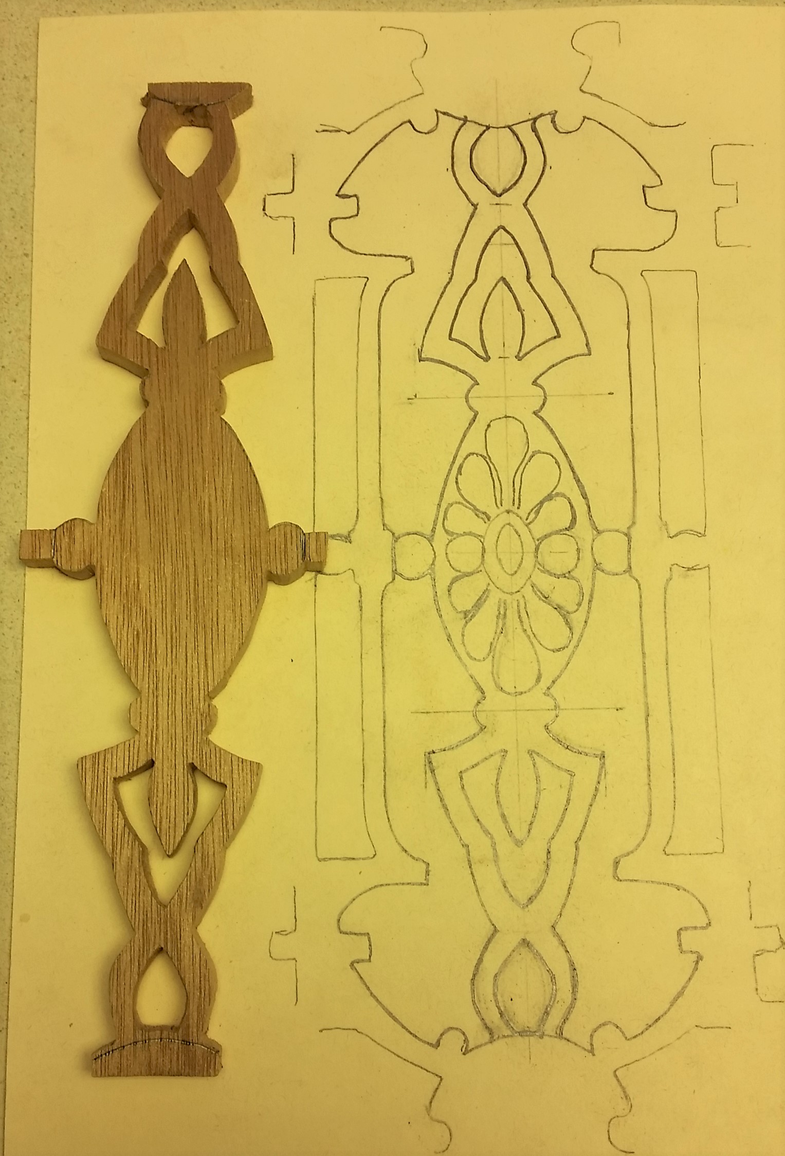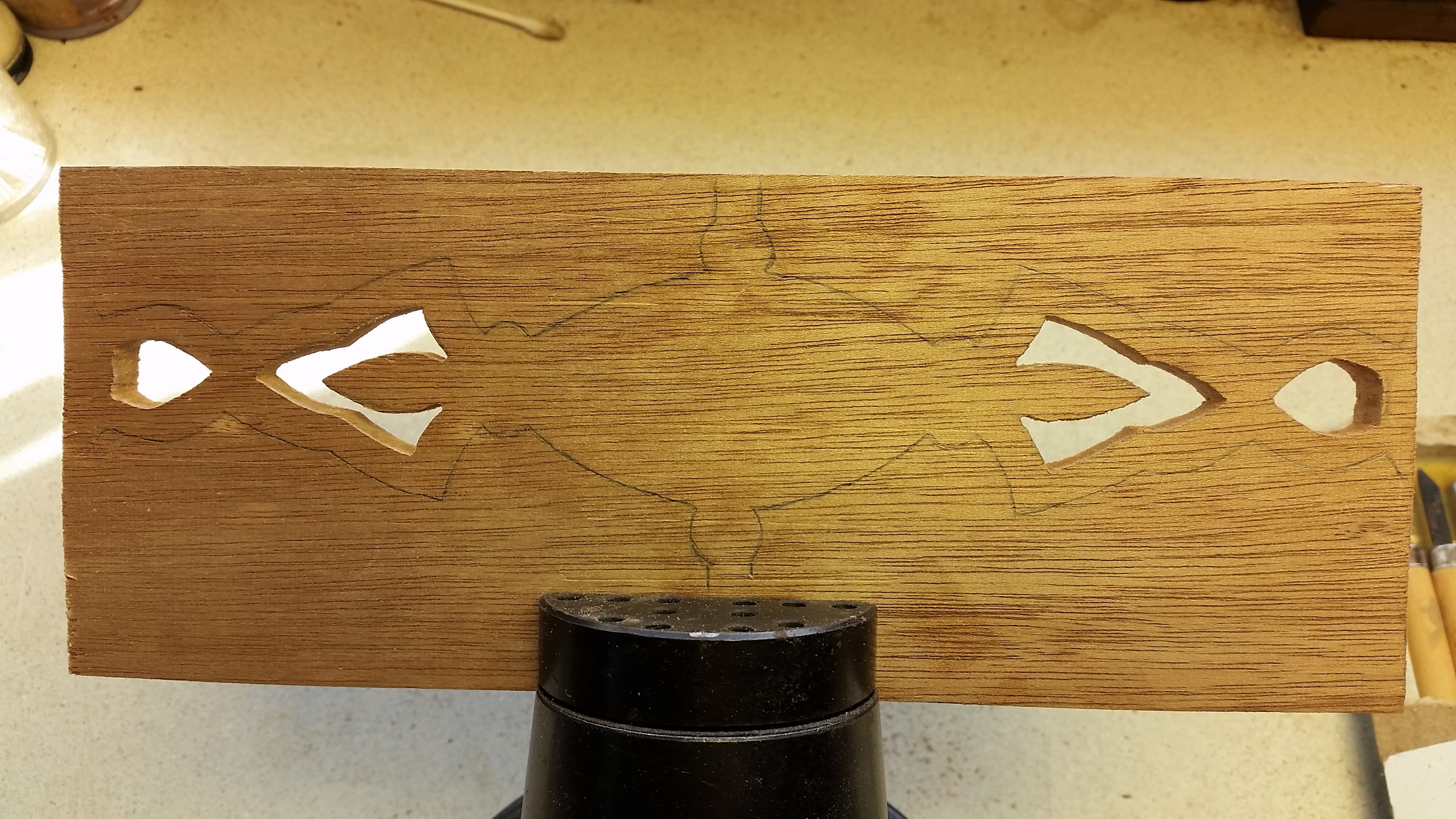 Next I planed down a piece of ¾" mahogany down to just under ⅜" to match the grill thickness and made a pattern to transfer of the profile.