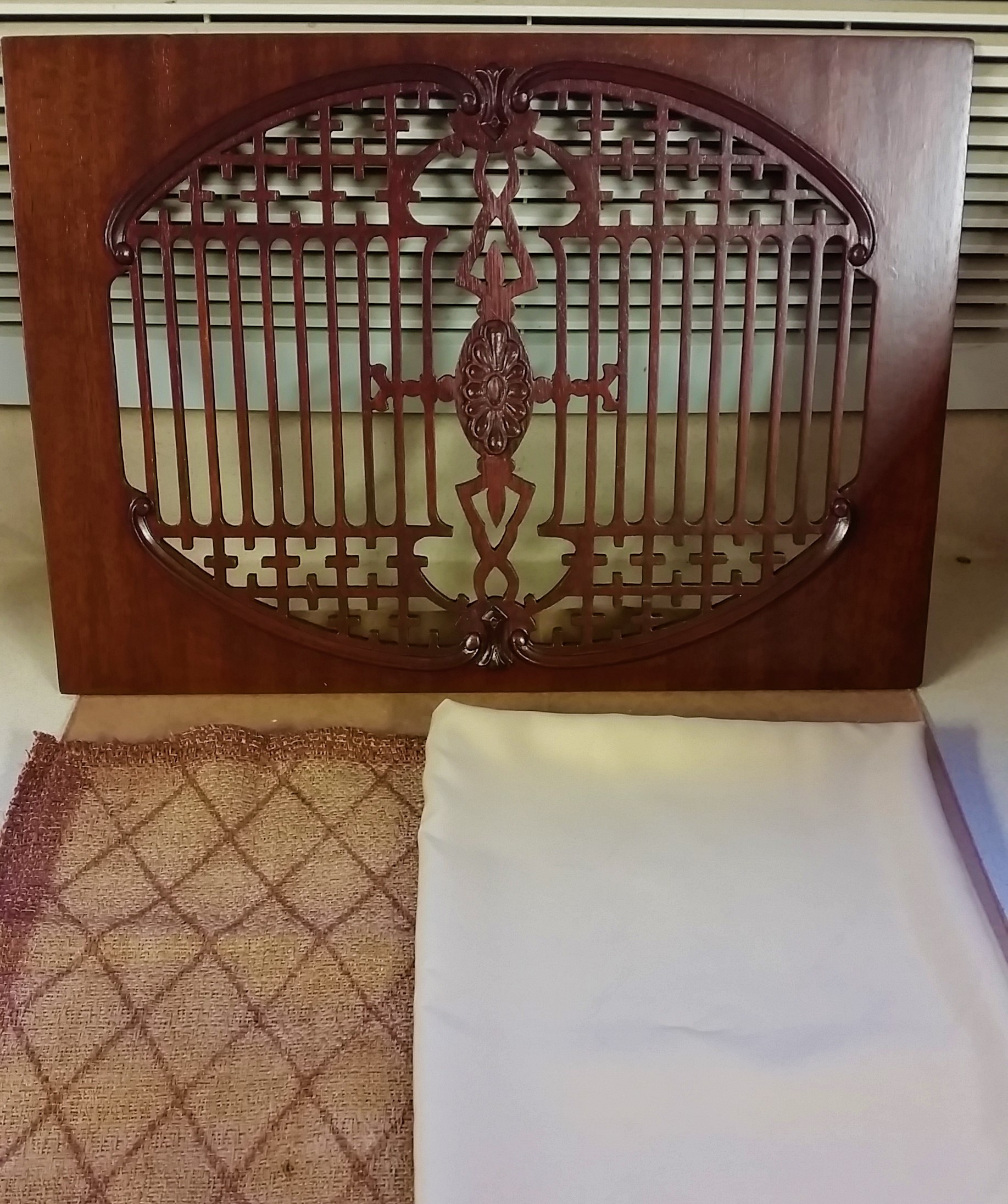 I don't like the grill cloth that someone had glued to the grill, very heavy and not like original. Based on what I found left glued to the inside I got new cloth at Jo Ann's that is shear and a light tan color.