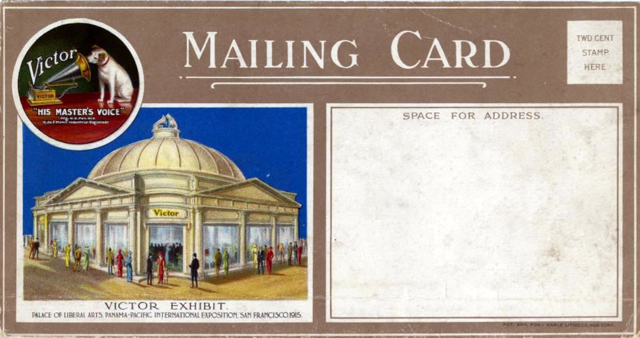 For the 1915 Panama-Pacific International Exhibition (world's fair) in San Francisco, the Victor Talking Machine Co. constructed a unique domed building to house exhibits and demonstration halls. Despite promotional pictures that implied it was a stand-alone building, in reality it was built inside the massive Liberal Arts Building (see photo below).