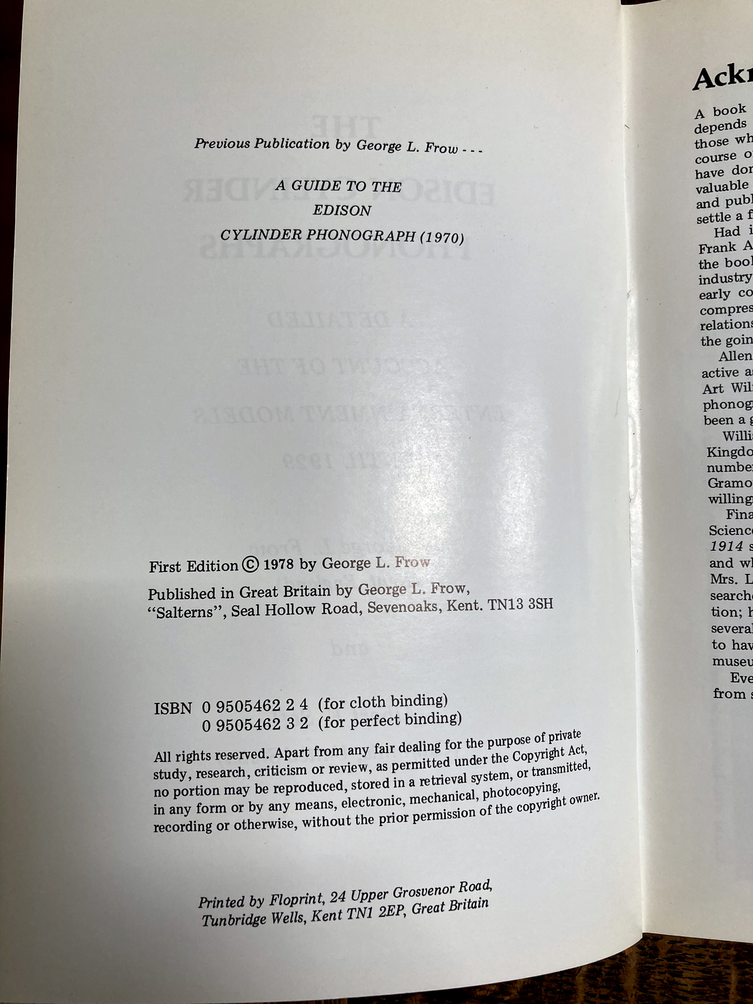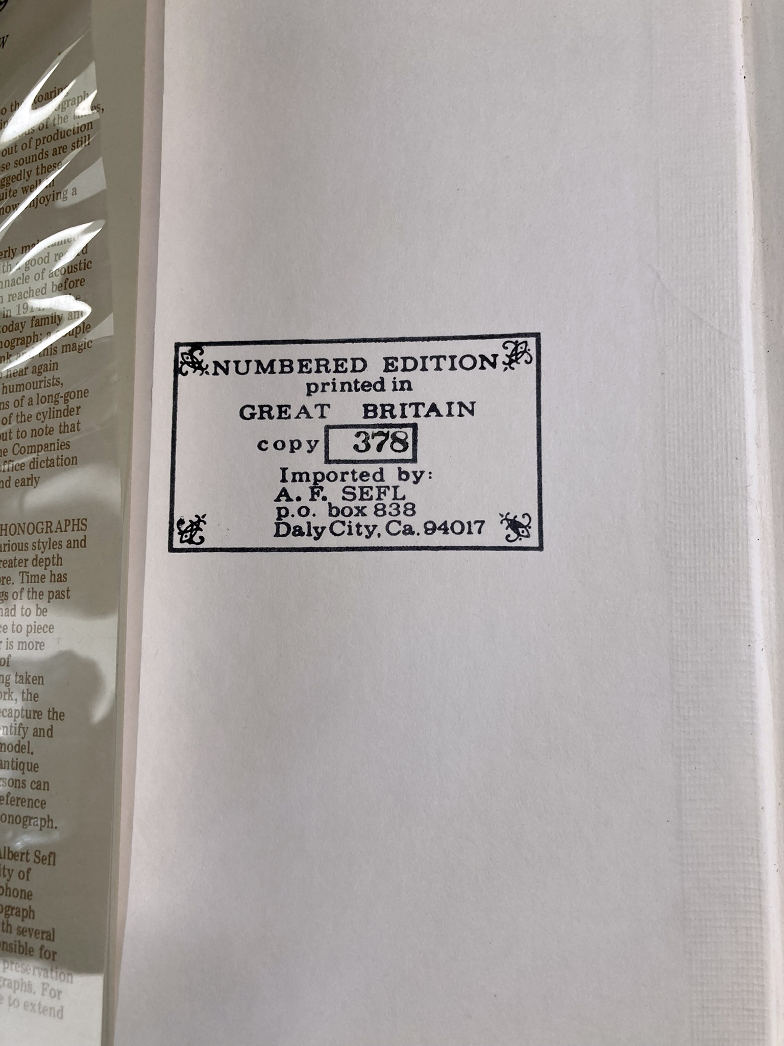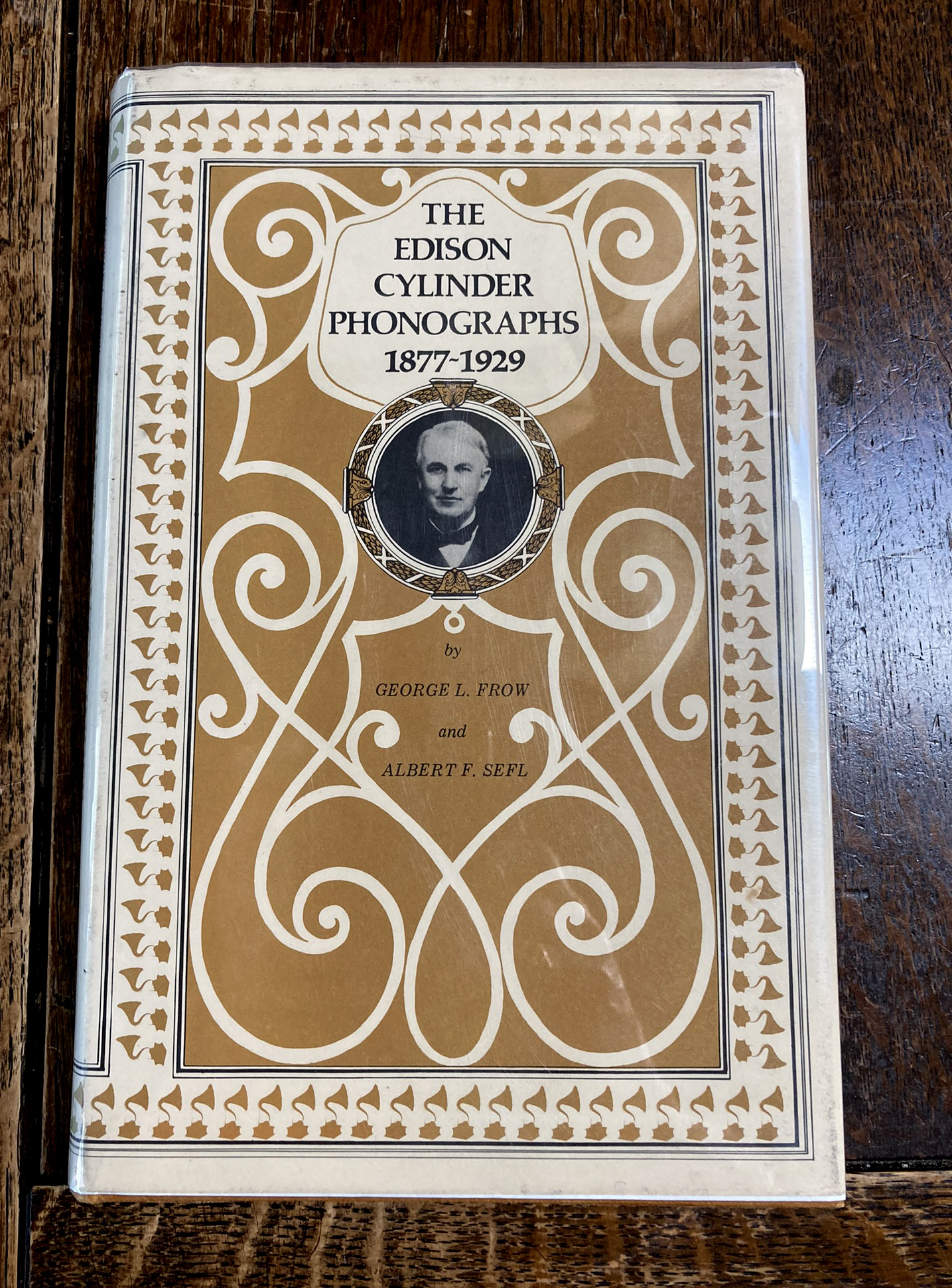 SOLD - This is the 1978 edition of "The Edison Cylinder Phonographs" by George Frow & Al Sefl. It has the original dust jacket in perfect condition, protected by a plastic sleeve. There is very light age toning at the edges of the pages but it is otherwise near-mint. The big advantage of this first edition over those which came later is the clarity of the photographs, which are overall brighter than later editions.