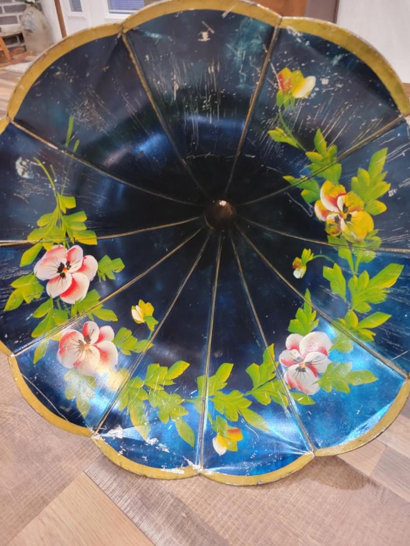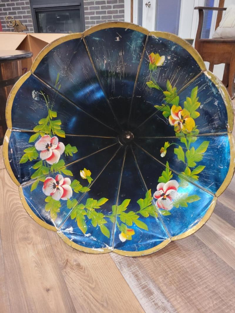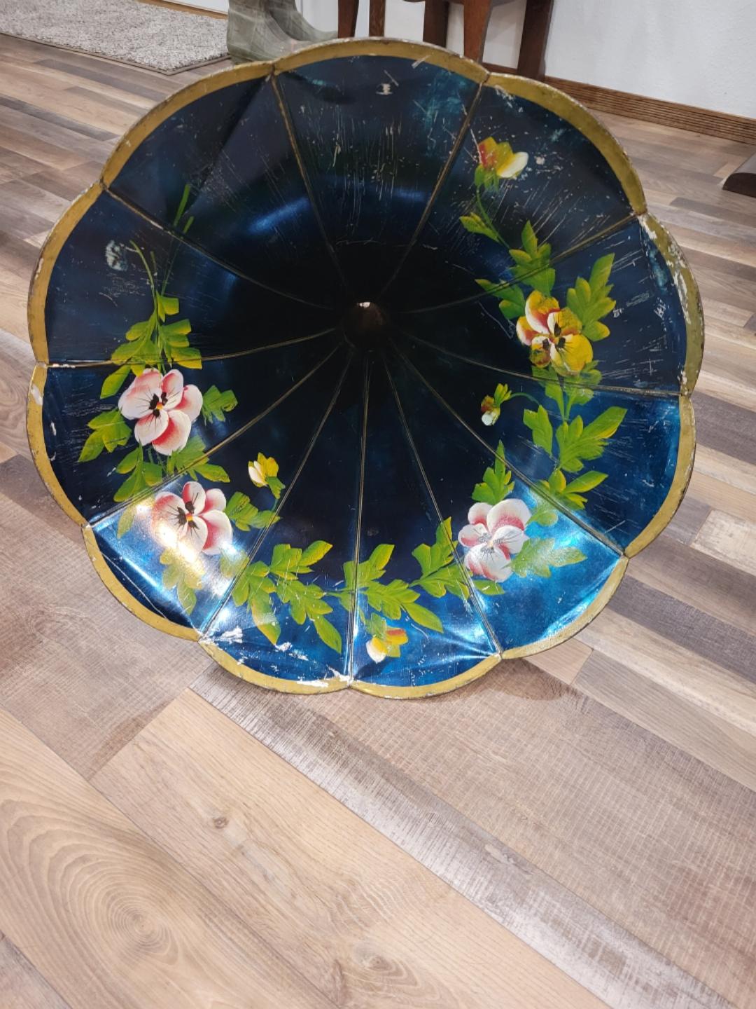 Here is a nice shape blue morning glory horn for a cylinder machine. It is in decent shape and retains most of the original paint. This is a large item and I would rather deliver to the Chicago show or I will ship at the buyers expense. The small end is somewhat not straight. Nothing the rubber won't cover. I would not know what that is until I pack it when it is sold. 200.00 + actual shipping. It measures 23" x 32". First to PM SOLD get it.