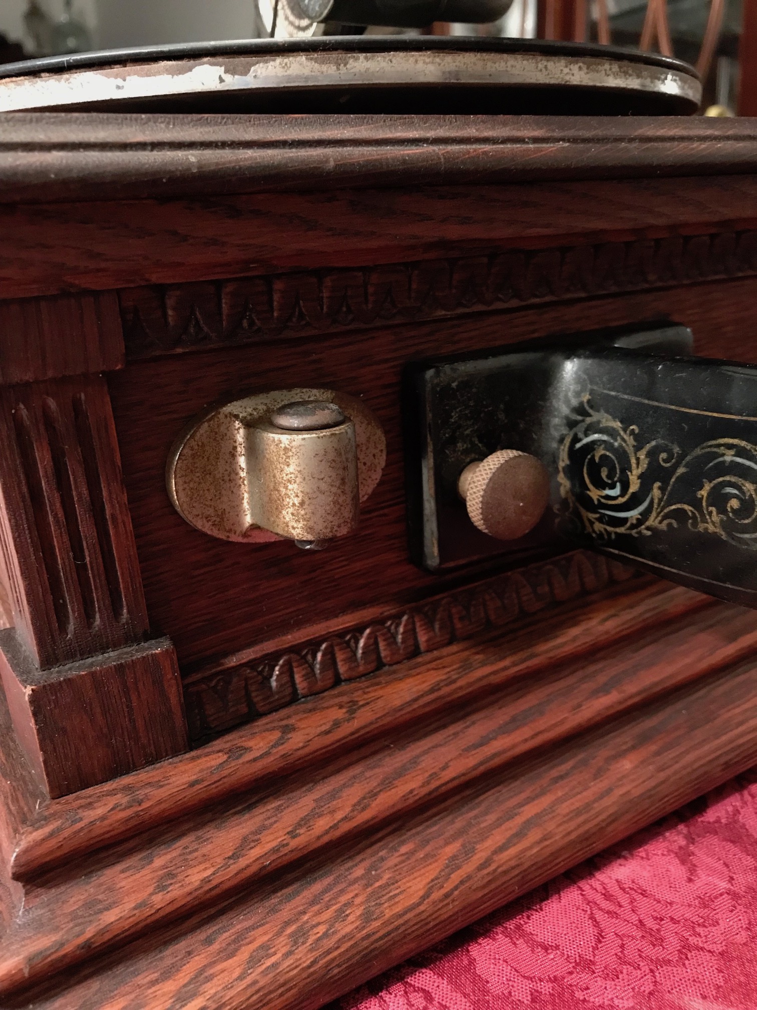 Here's a "stab" at what happened: The case was intended originally for a front-mount machine. That never happened as technological advances (travelling arm --> rigid arm--> tapered tone arm) occurred rapidly in the first five years of the 20th C. It originally sold as a rigid-arm machine with this "knuckle", then was upgraded shortly thereafter to a tapered arm talking machine.