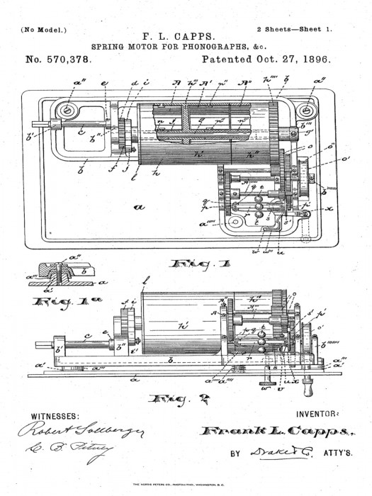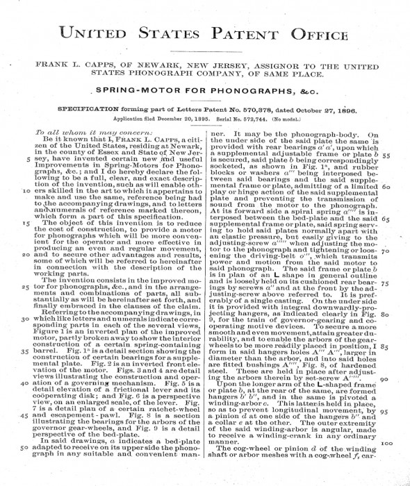 What is interesting about the very first "Spring-Motor" Phonographs (early 1896) is that the handles (cranks) have a riveted ID plate (nickeled) stating "U.S. Phonograph Co." on the haft. The patent of course was granted to Frank Capps (for the Triton-Motor), Within a year, the cranks were updated to the "National Phonograph Co." and then went 'nameless.' Edison was still emerging from the chaotic period of the North American Bankruptcy (1894-1896), and there seems to have been some temporary restriction on TAE's commercial activities. But by 1897, he was back in full swing. By 1909, he had to finally settle his financial obligations (court-ordered) with James Andem from the N.A. territorial fiasco (over $400,000). For some strange reason, Allan Sutton's (otherwise fine) book on Manufacturers & Producers completely misconstrues this drawn-out episode and calls it "fruitless." Edison's advisers had been telling him to settle for years but he stubbornly resisted until it was too late (and he then lost bigtime).