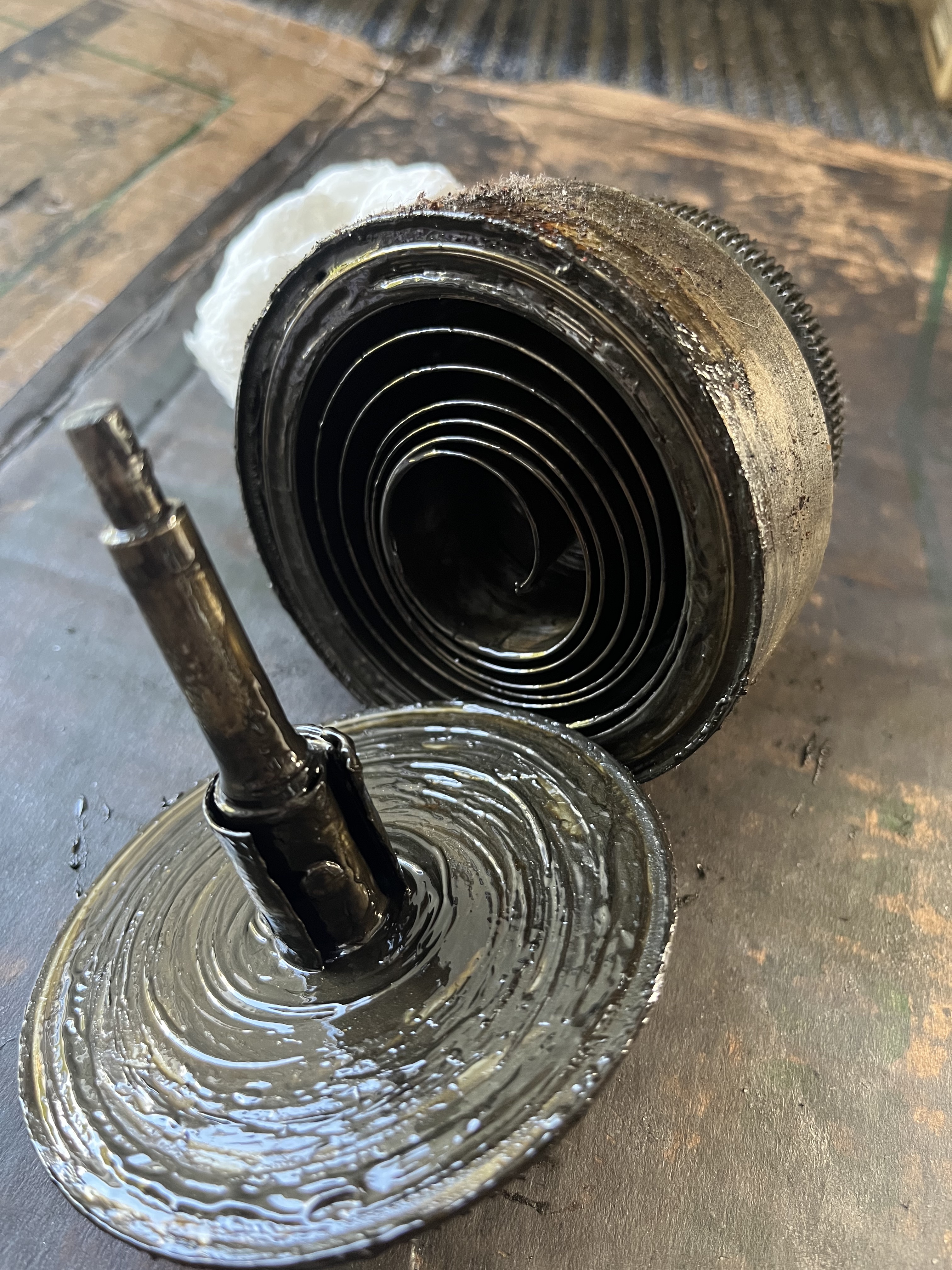 I'm a bit skeptical about how this will perform but I'd really like to get it running. I'm assuming there will be motor noise--but how much remains to be heard until I get a new spring. The paint actually cleaned up quite nicely since I took the photo, so it seems like a worthy project.