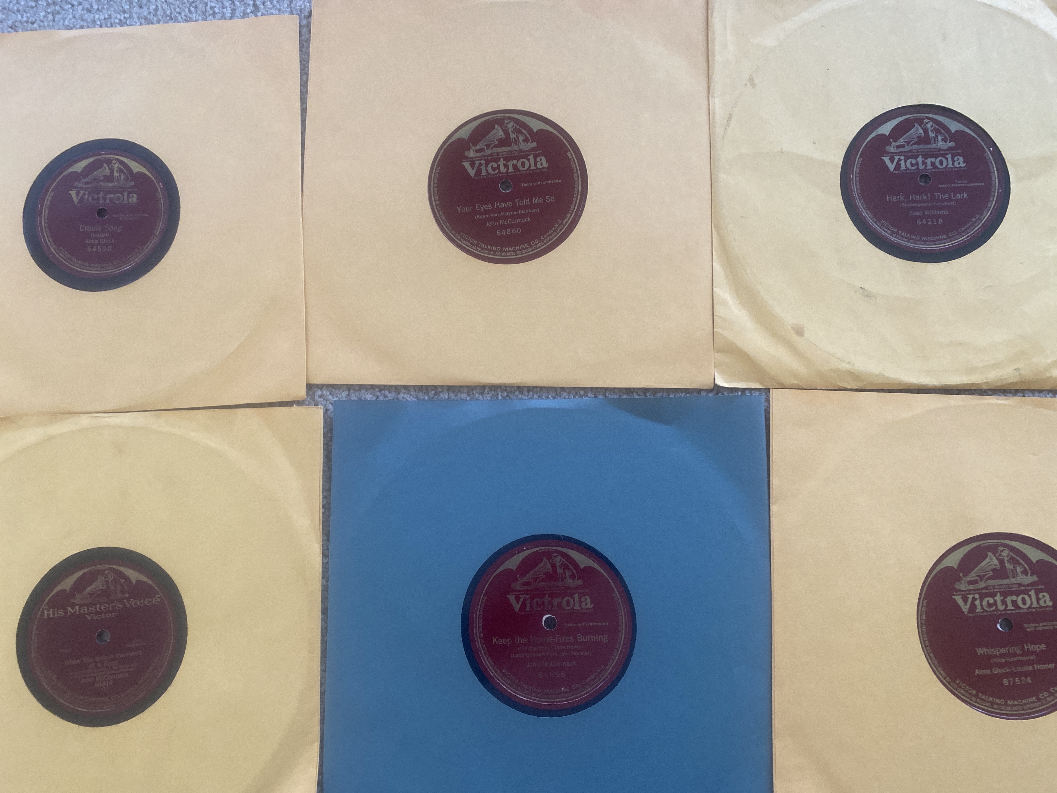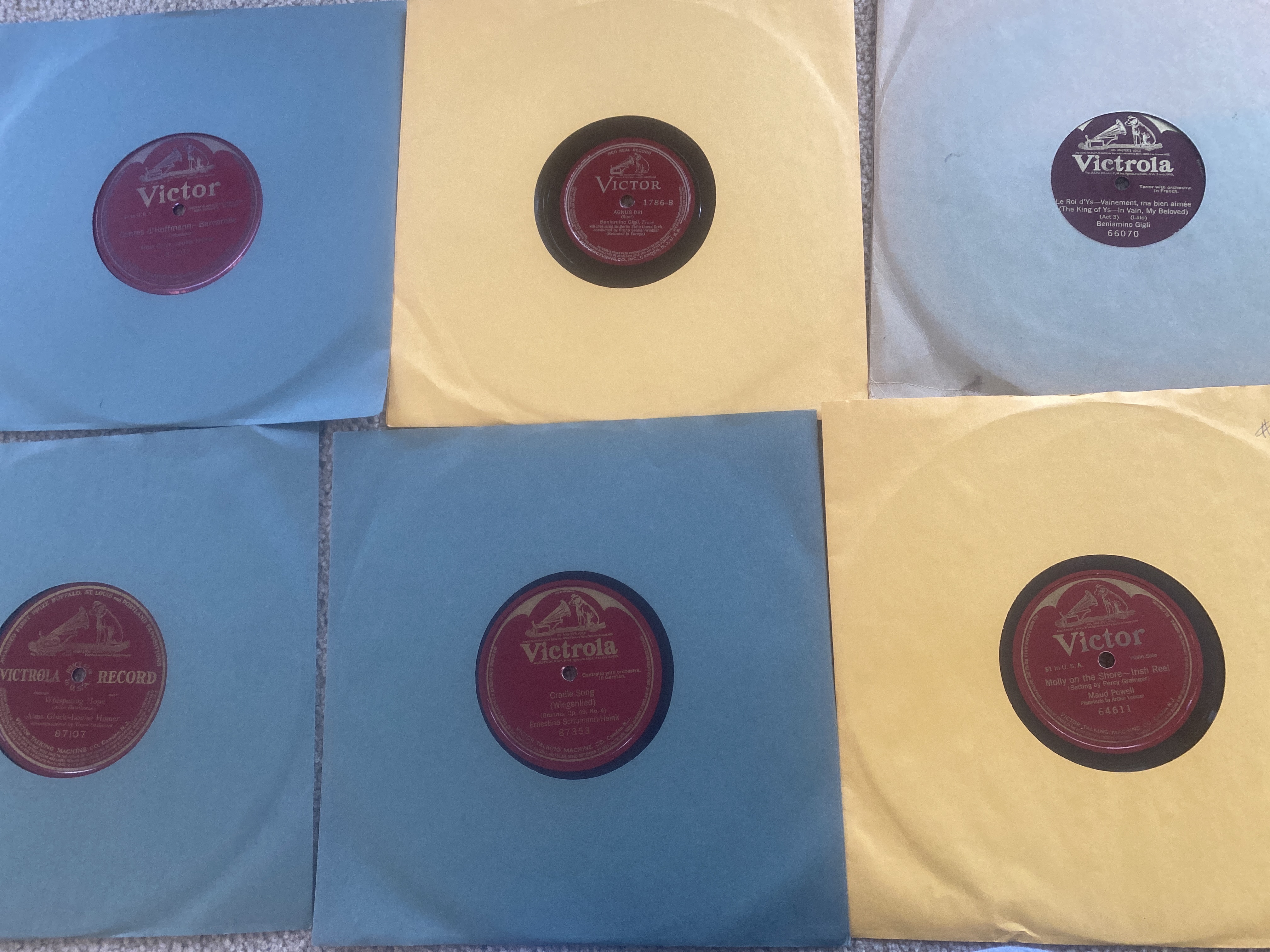 Just as a hint, you might do better with these if you treated them the same way as you did your popular records, posting (legible, please!) photos showing the labels, at least in groups. I can see the top one in your stack actually is of interest, but I'm not about to plunk down $65 for that plus what might be, or likely is, 24 duplicates of things I already have--or 24 more John McCormack records that are all of Irish ballads. I imagine our other classical collector members feel much the same.