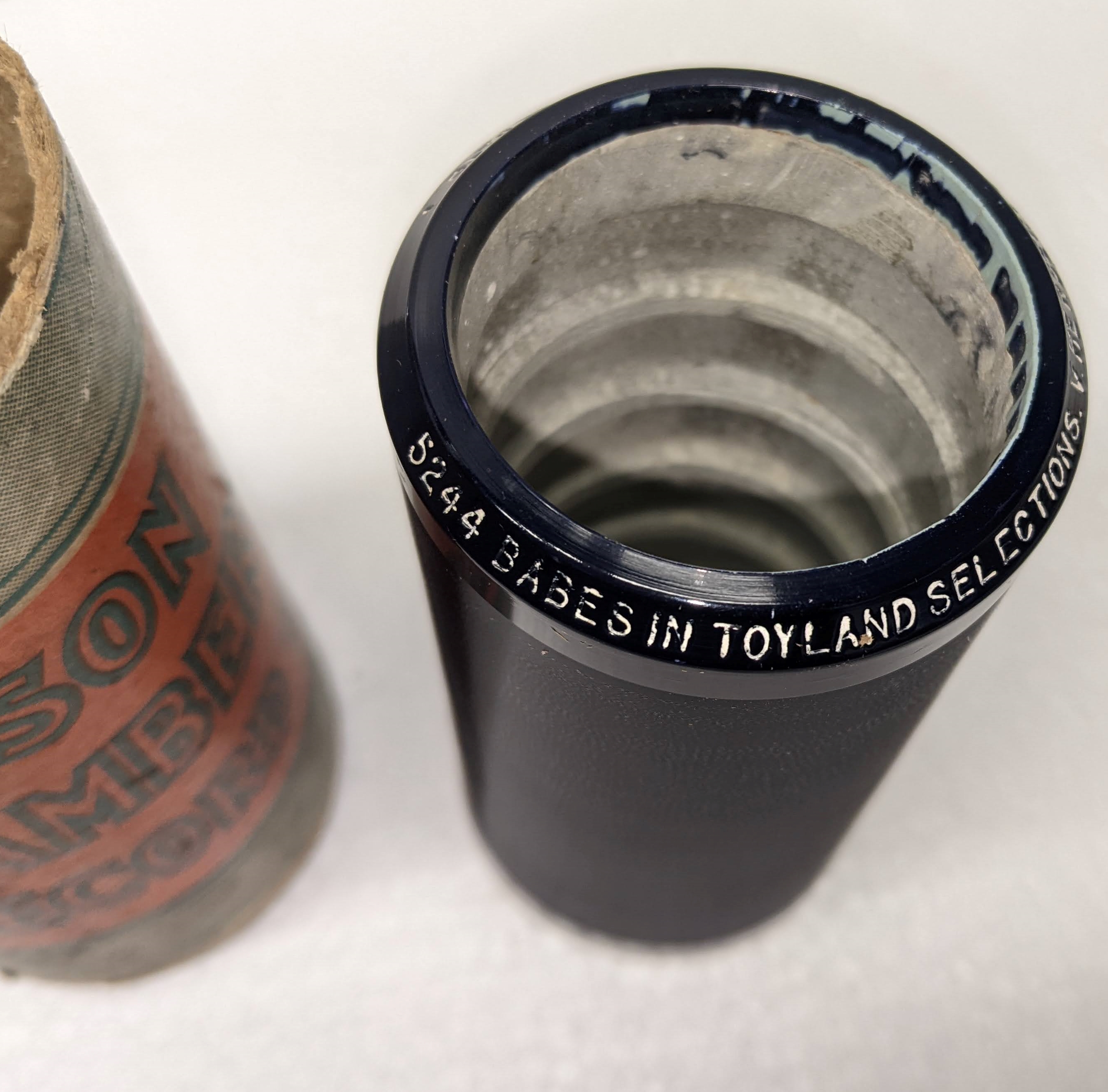 5244 Babes In Toyland – Victor Hebert. One of the iconic Christmas pageant songs. Babes in Toyland is an amazing piece. You recognize it as soon as you hear it. It is a very seldom found 5000 cylinder, desirable for its content and rarity. This one is in amazing condition, plays well. There is one small spit on the bottom, not to the playing groove. It does play really well with minimal noise.
