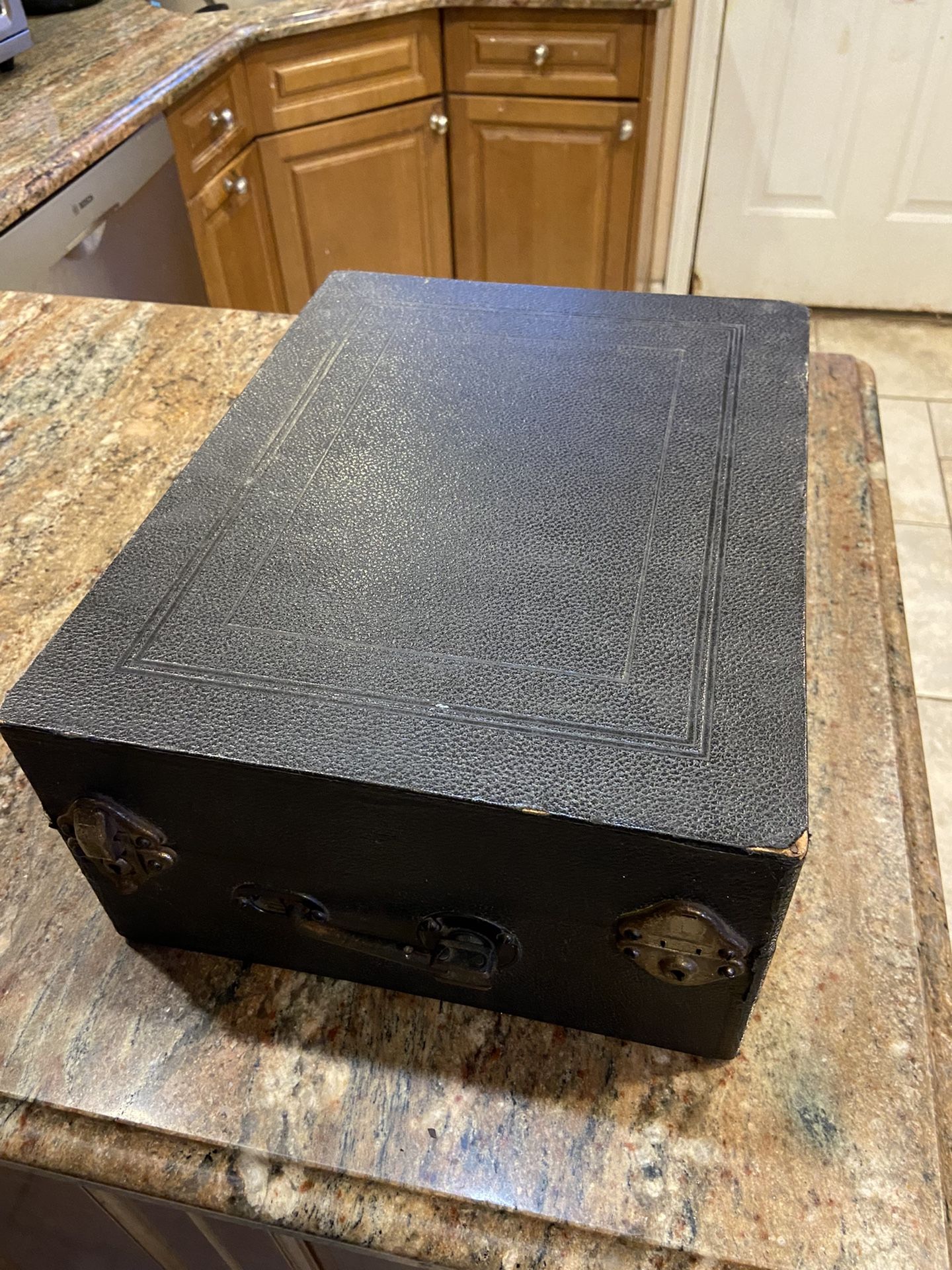 Here is a Columbia 109 portable of the earlier variety with the straight tonearm instead of the plano-reflex variety found on the later versions of this model. I have sent the reproducer out to Wyatt before but the machine is still a little rattly for some reason or another. The metal piece attached to the lid which would cover the needle pot when the lid was closed as well as the leather handle are missing, but other than that it is in good shape. Some of the leatherette on the rear has been re-glued, and the motor hasn't had any issues for me. It is located on Long Island in New York, and I would prefer not to ship it.