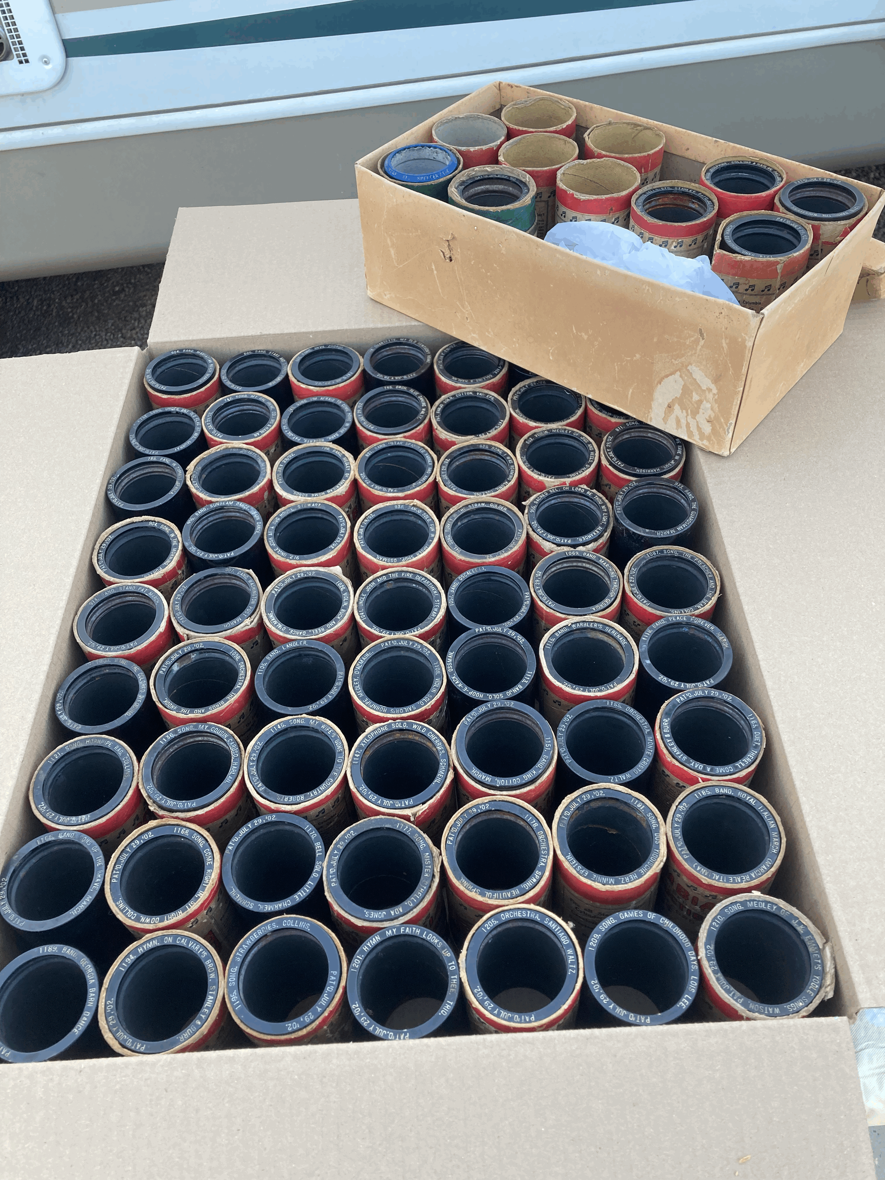 I bought a machine that included 67 two minute Indestructible Columbia cylinders. Most are in correct boxes but many of those lack bottoms. I looked but did not play the cylinders. Some have a bit of shrinkage but all appear to be in good condition. There is a good assortment of comedy, band, banjo, but only a few sacred titles. If you call I am happy to read titles. I prefer to deliver to the APS Expo in June or the one in August and hope to avoid shipping. I drive from Oregon to Chicago and am happy to meet along my route.