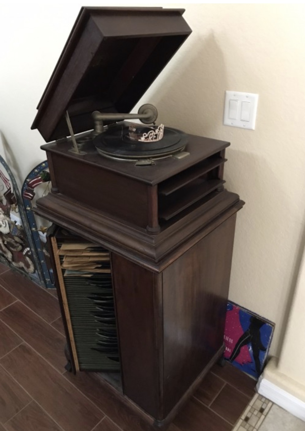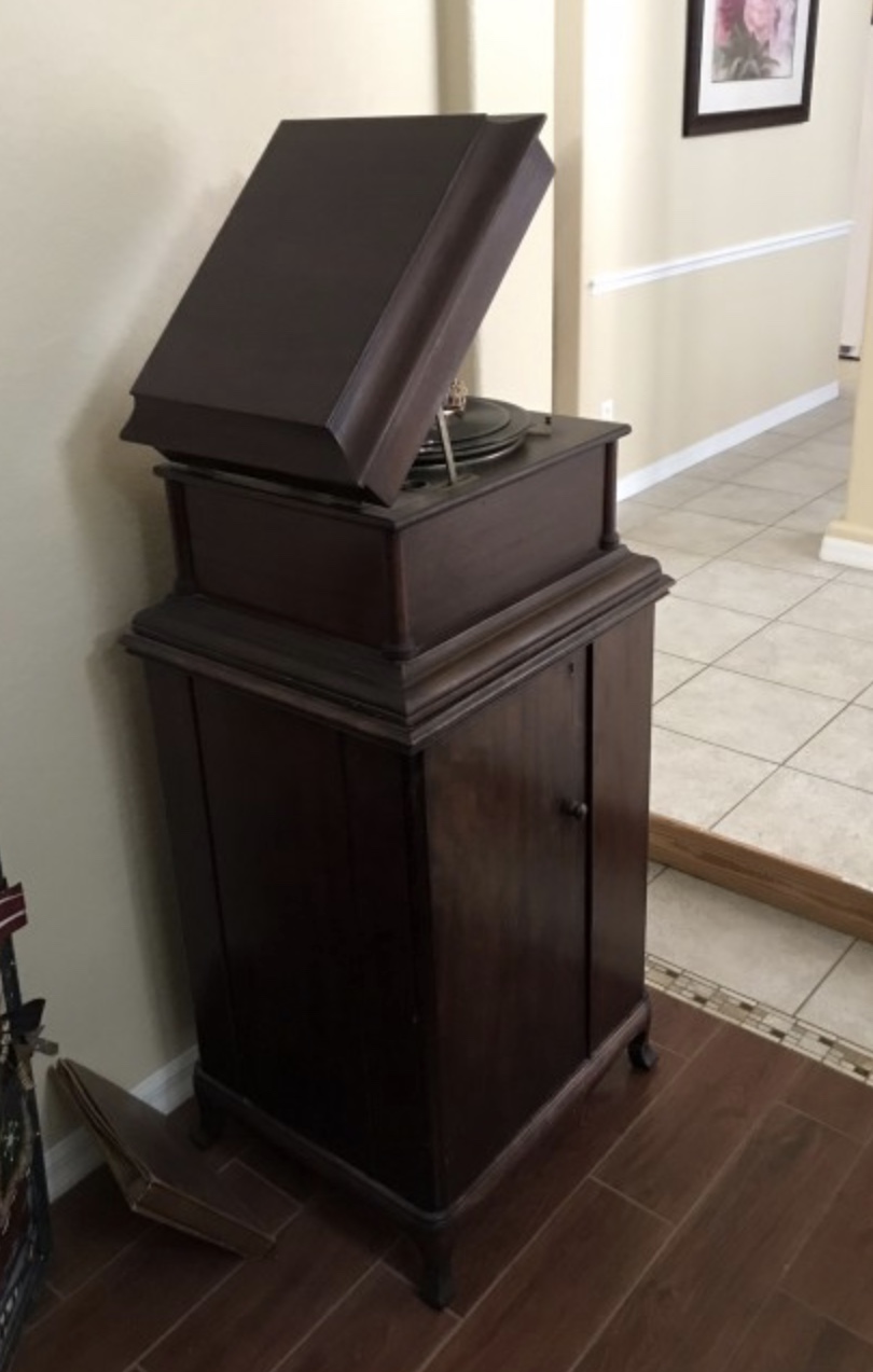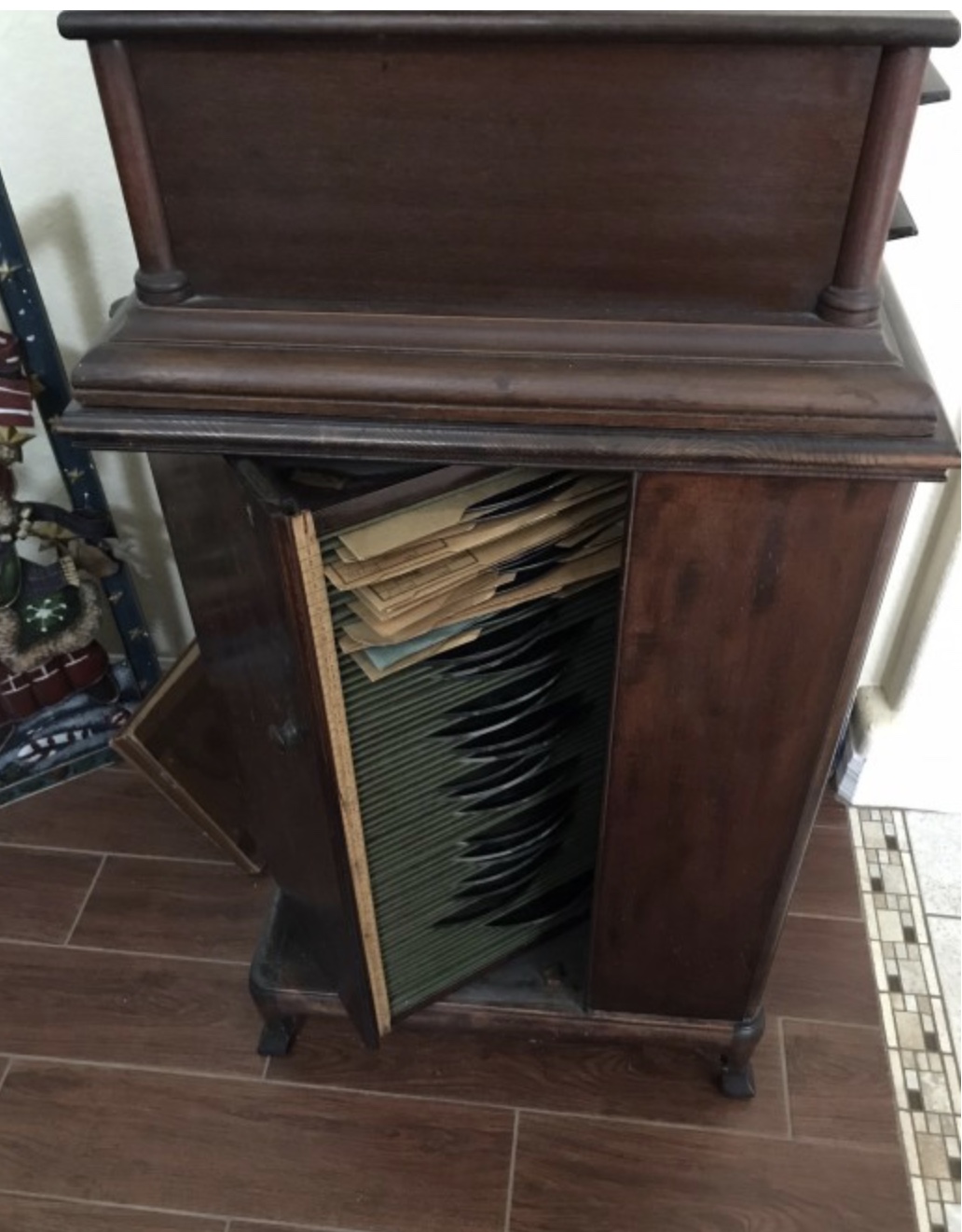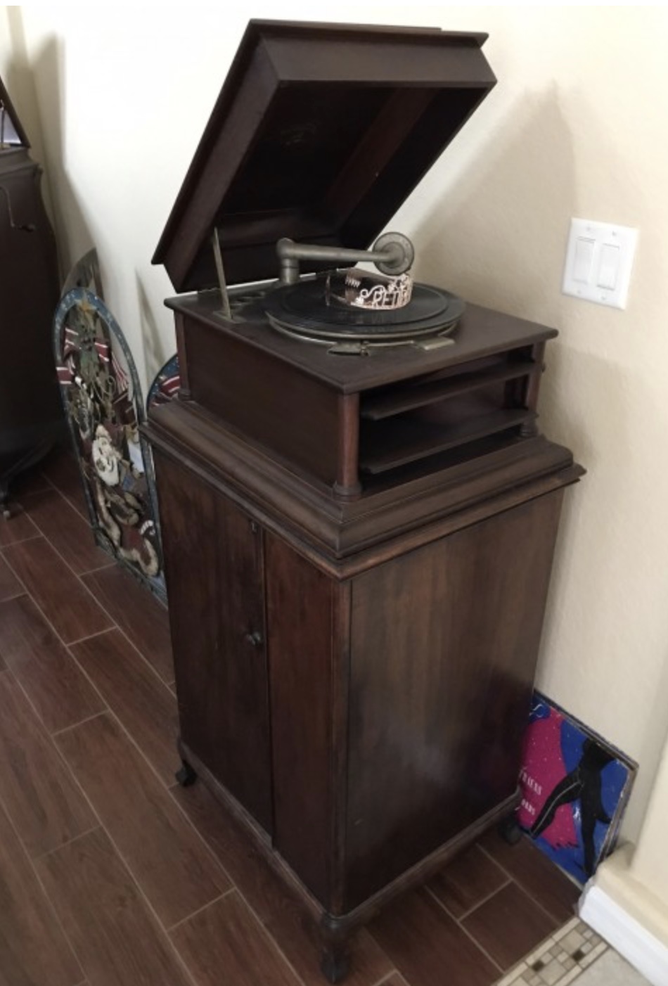 This combo, Columbia Favorite and Salter cabinet has been together since new. It was available new in this set up. The original add is included. The phonograph plays and sounds nice. The cabinet spins to reveal record storage. They both have there original finish. Very Heavy. I personally bought this from the original owners family in the early 80’s and have had it ever since.