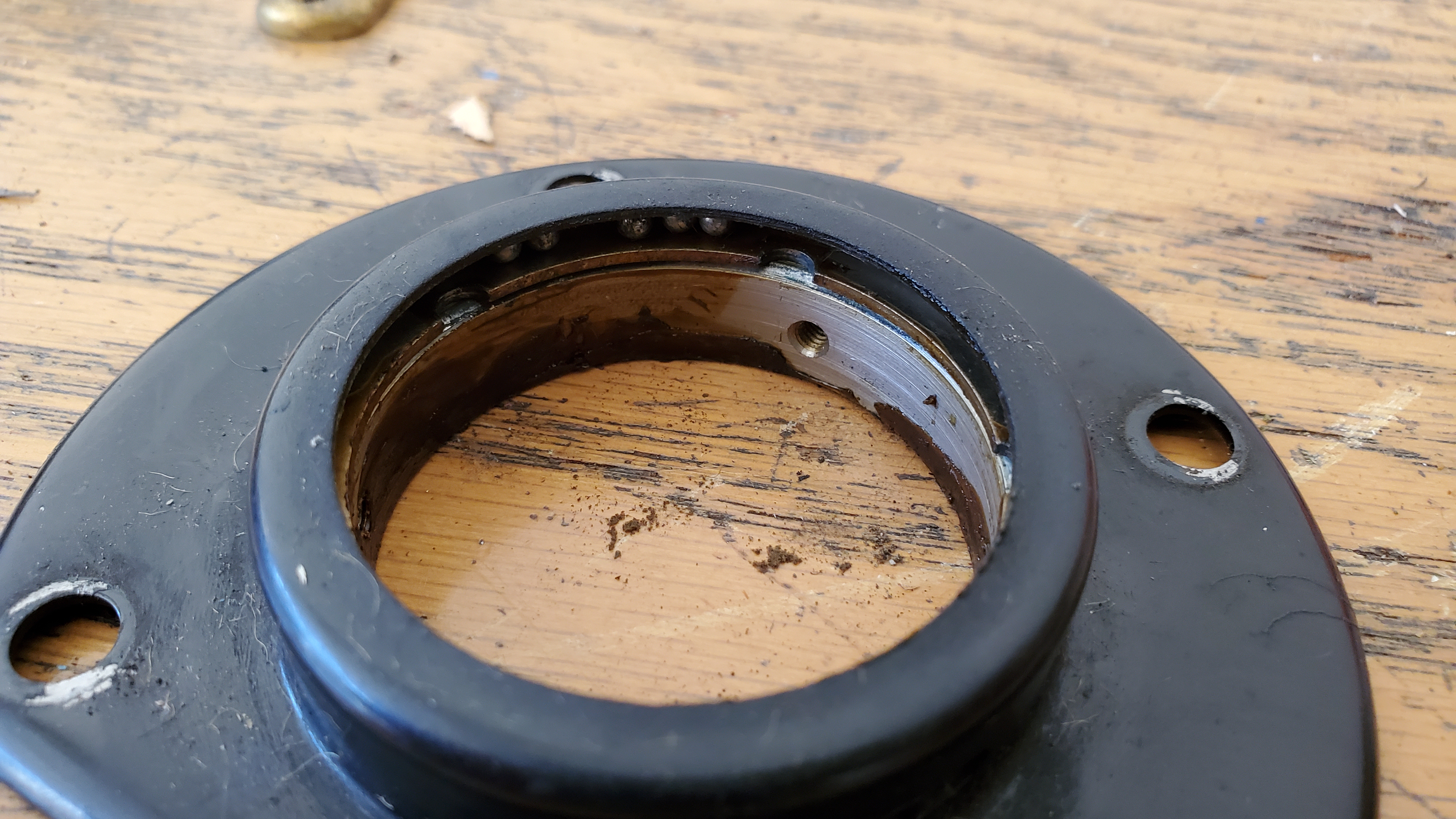 I should also mention that it is a good idea to make orient the screw holes on the collar so that they align with the holes on the bracket when you go to install it. I drew pencil lines on my bracket to help me. This will reduce the risk of the bearings escaping their home in the race.