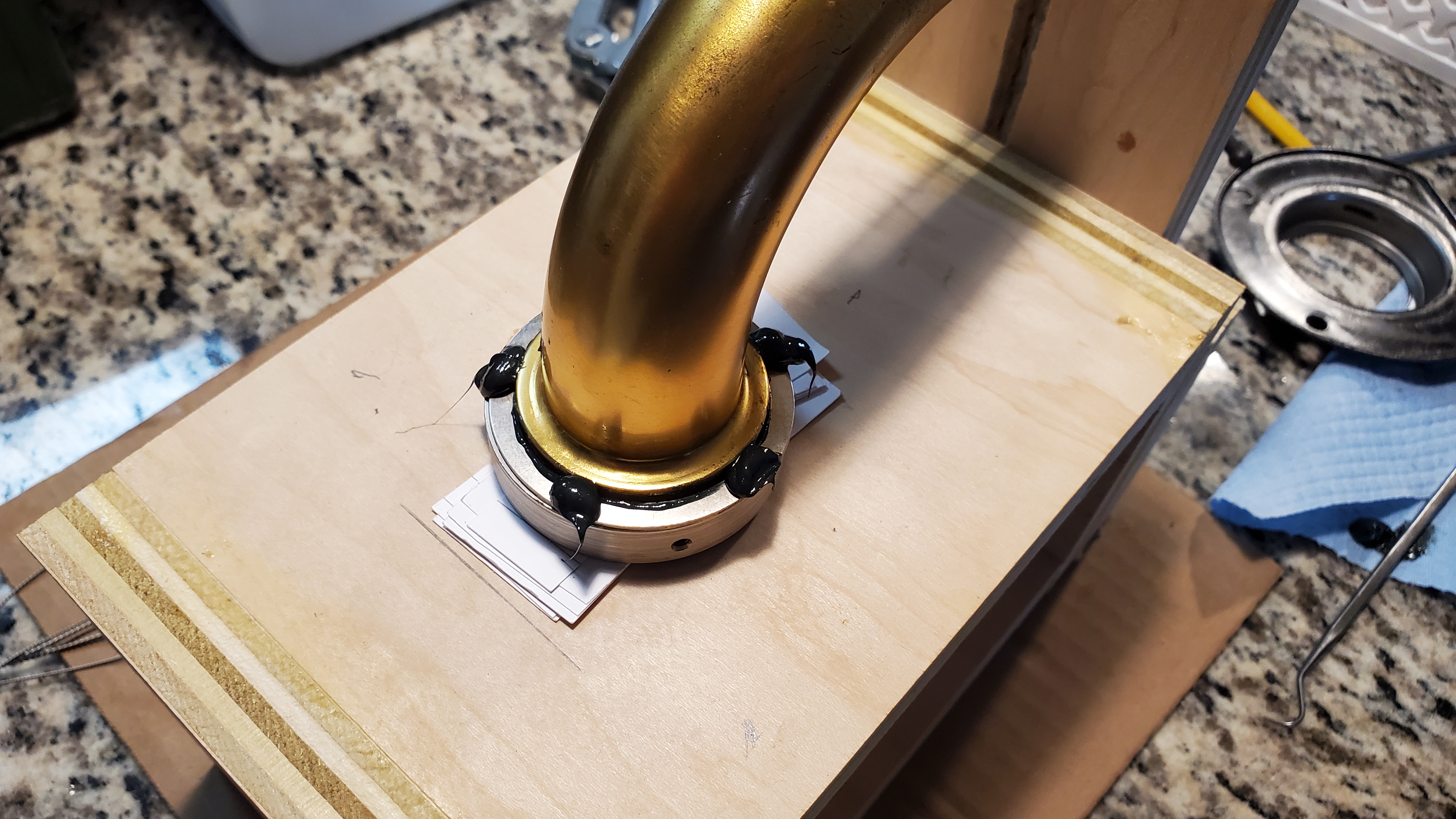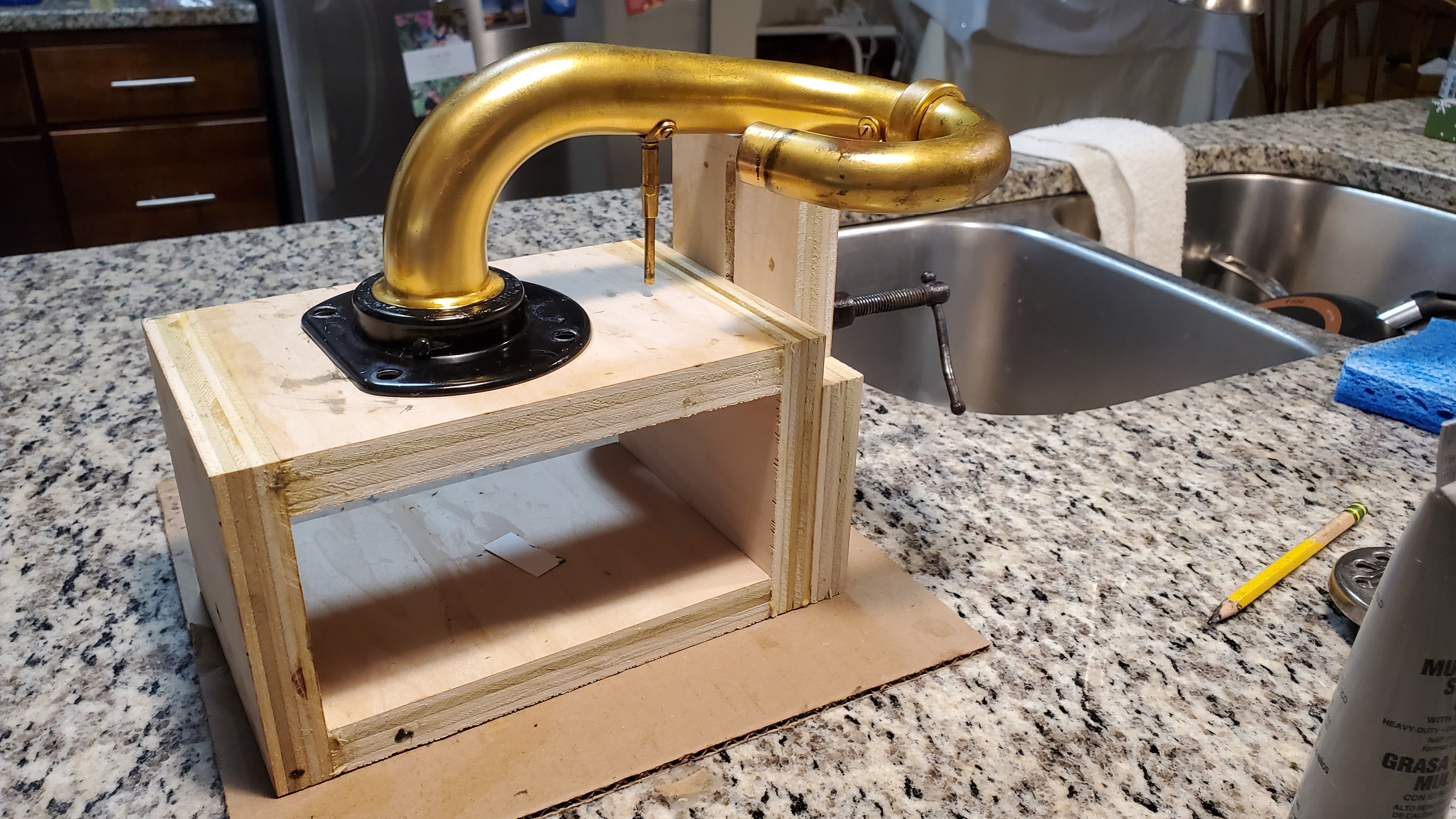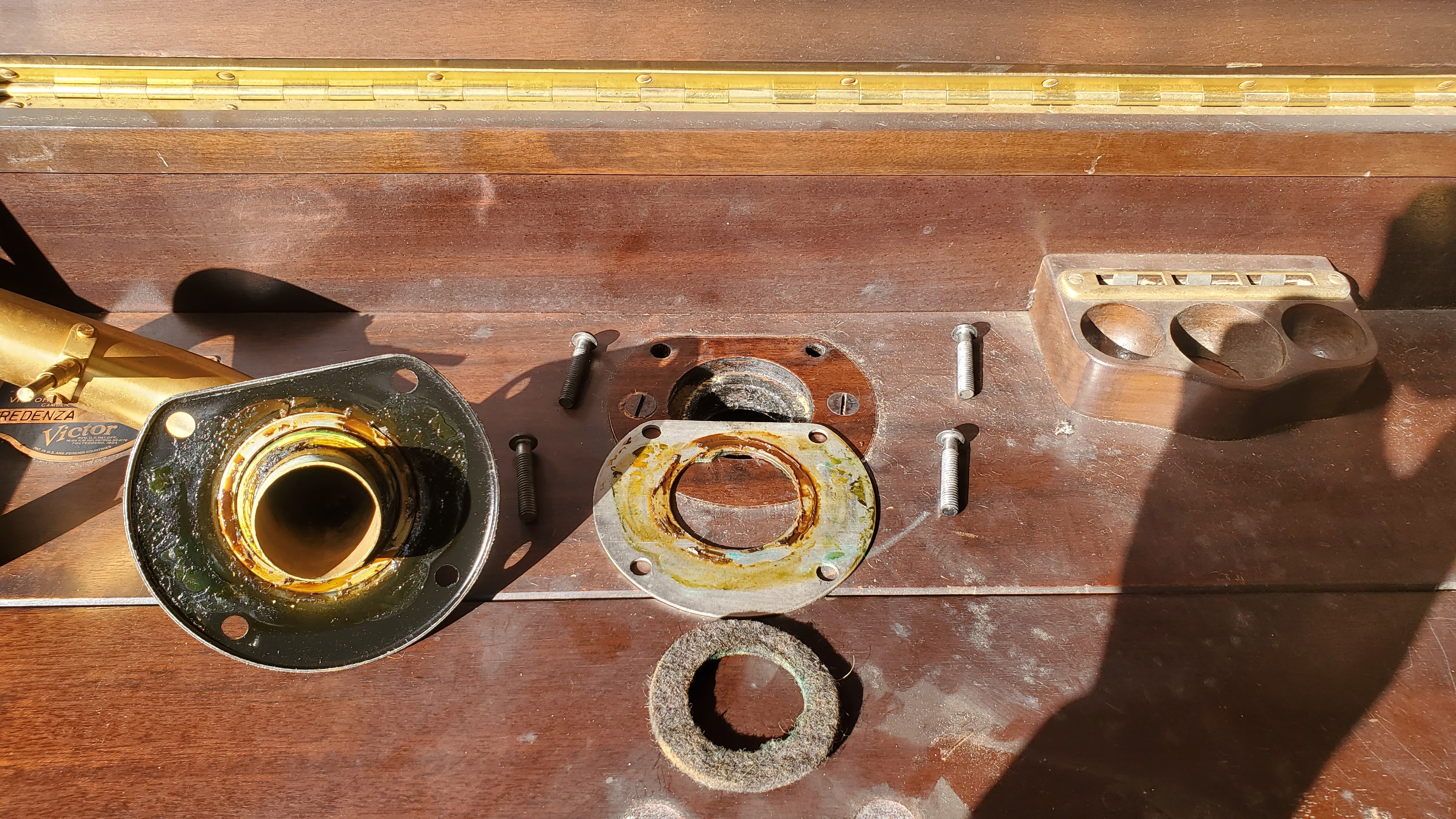 My biggest fear in this process was loosing a bearing or having them drop into the horn as I was trying to put this all together with the tone arm upside down.