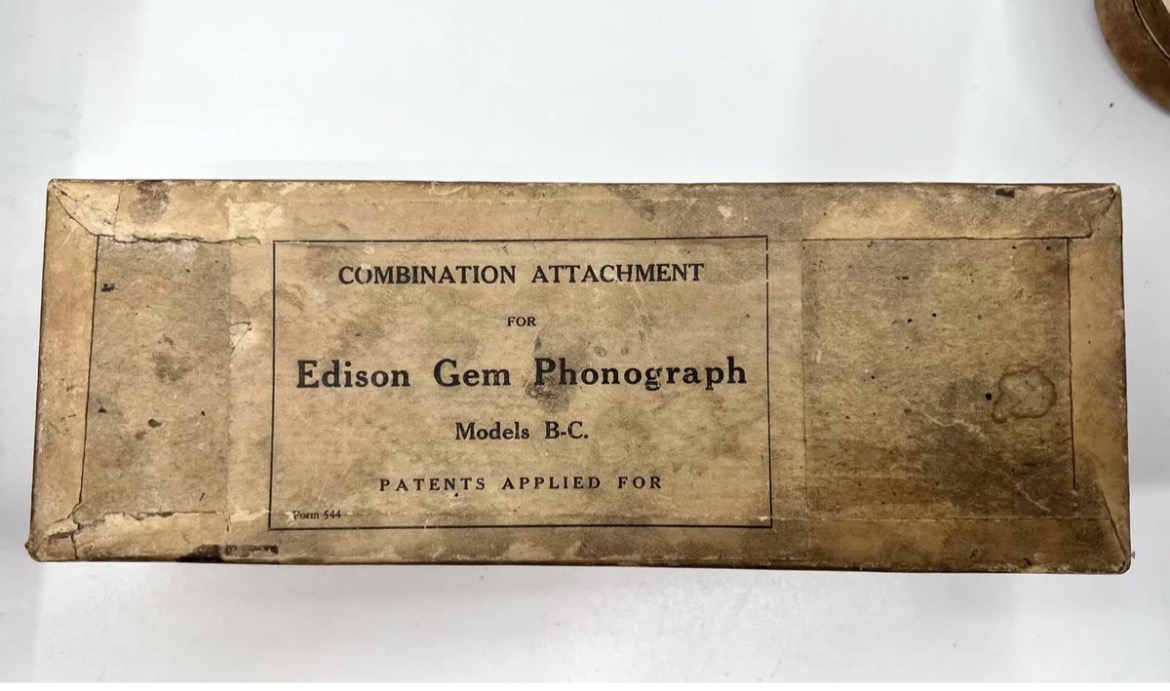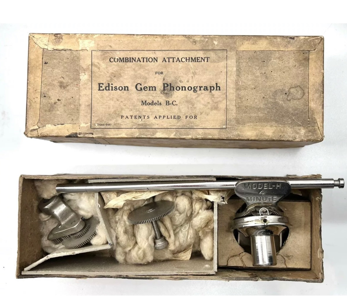 For Sale is a Edison Gem Combination Attachment Kit for a Model-B or Model-C in it original box. This is a complete kit including the Model-H reproducer. This kit appears to be in as new condition and never used. It is still in its original box that is in great condition. This is a very hard to find complete Gem Combination Attachment Kit especially in this condition.