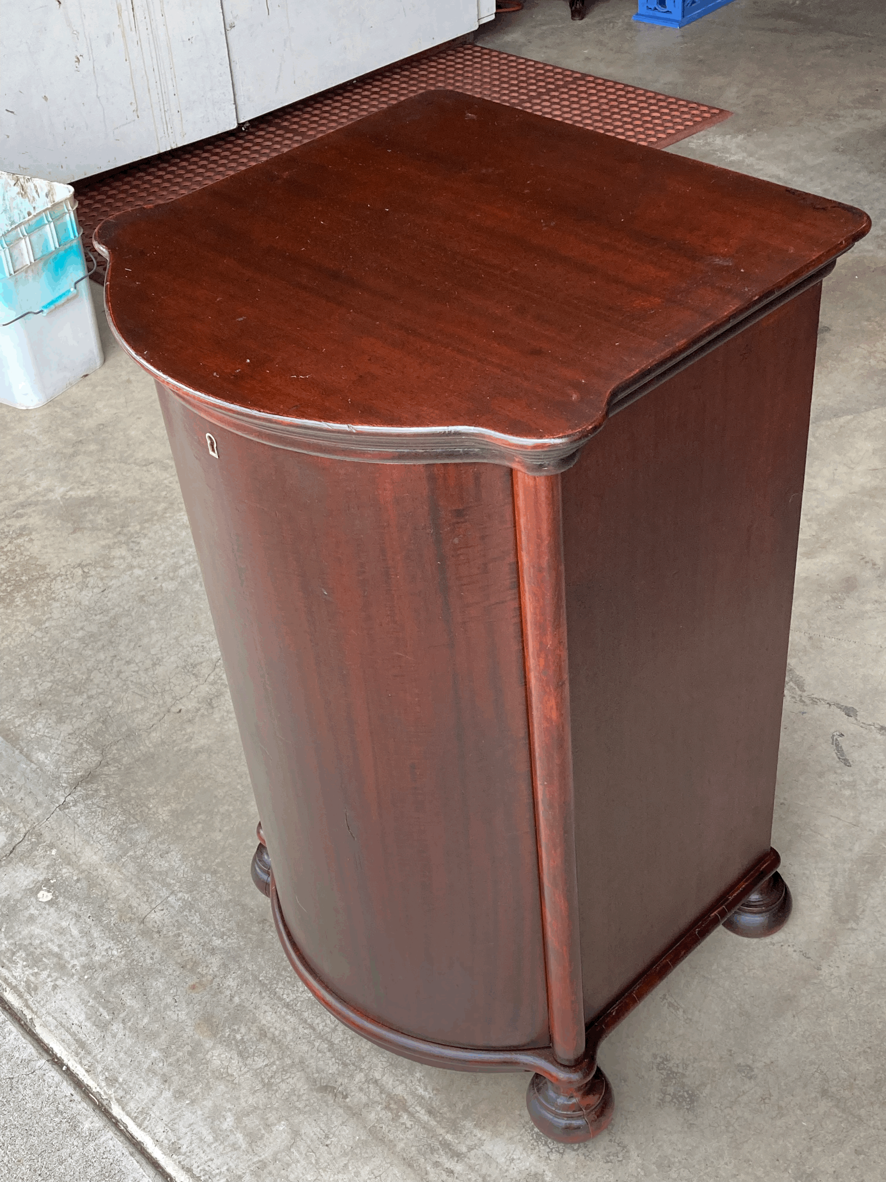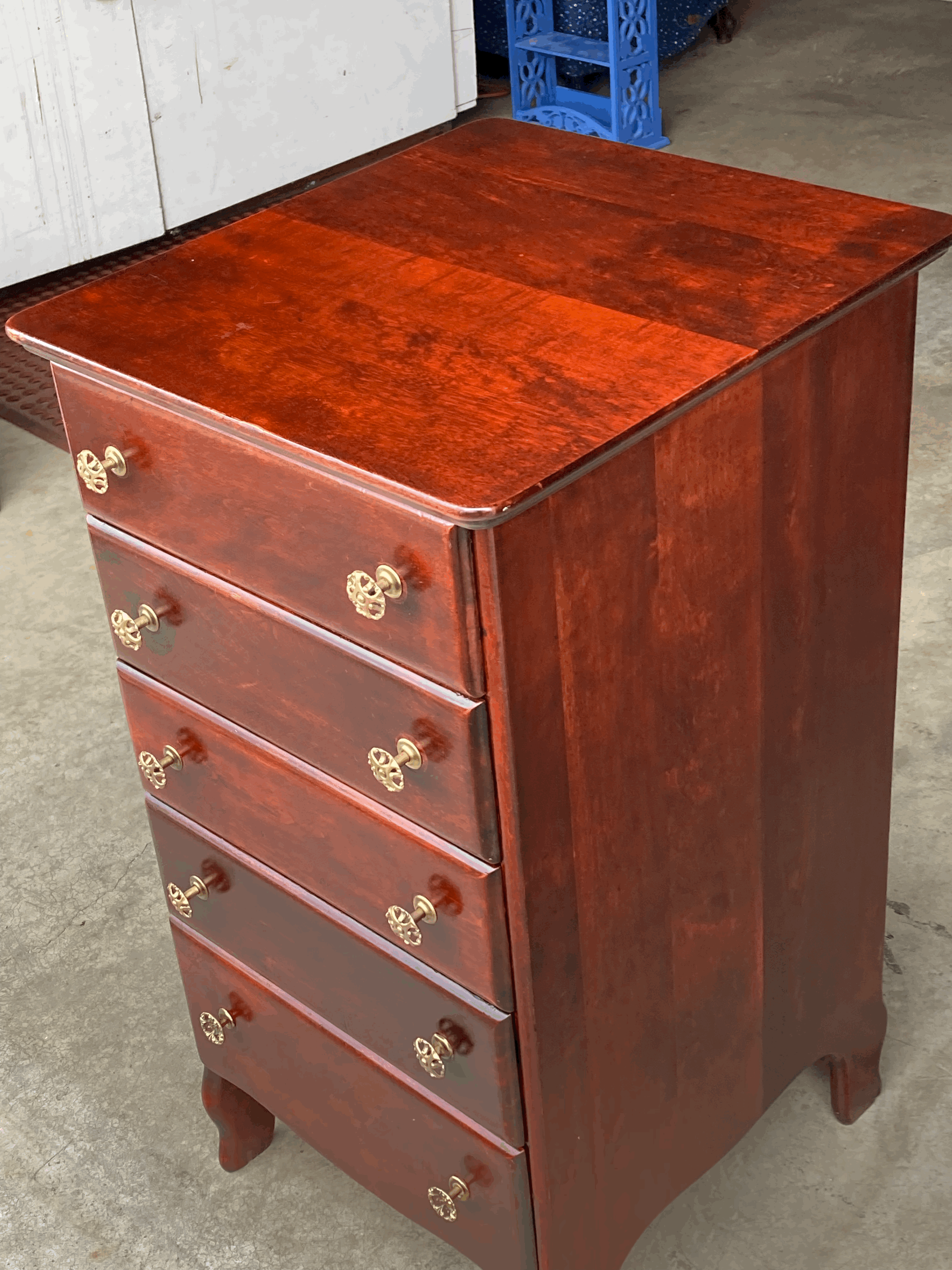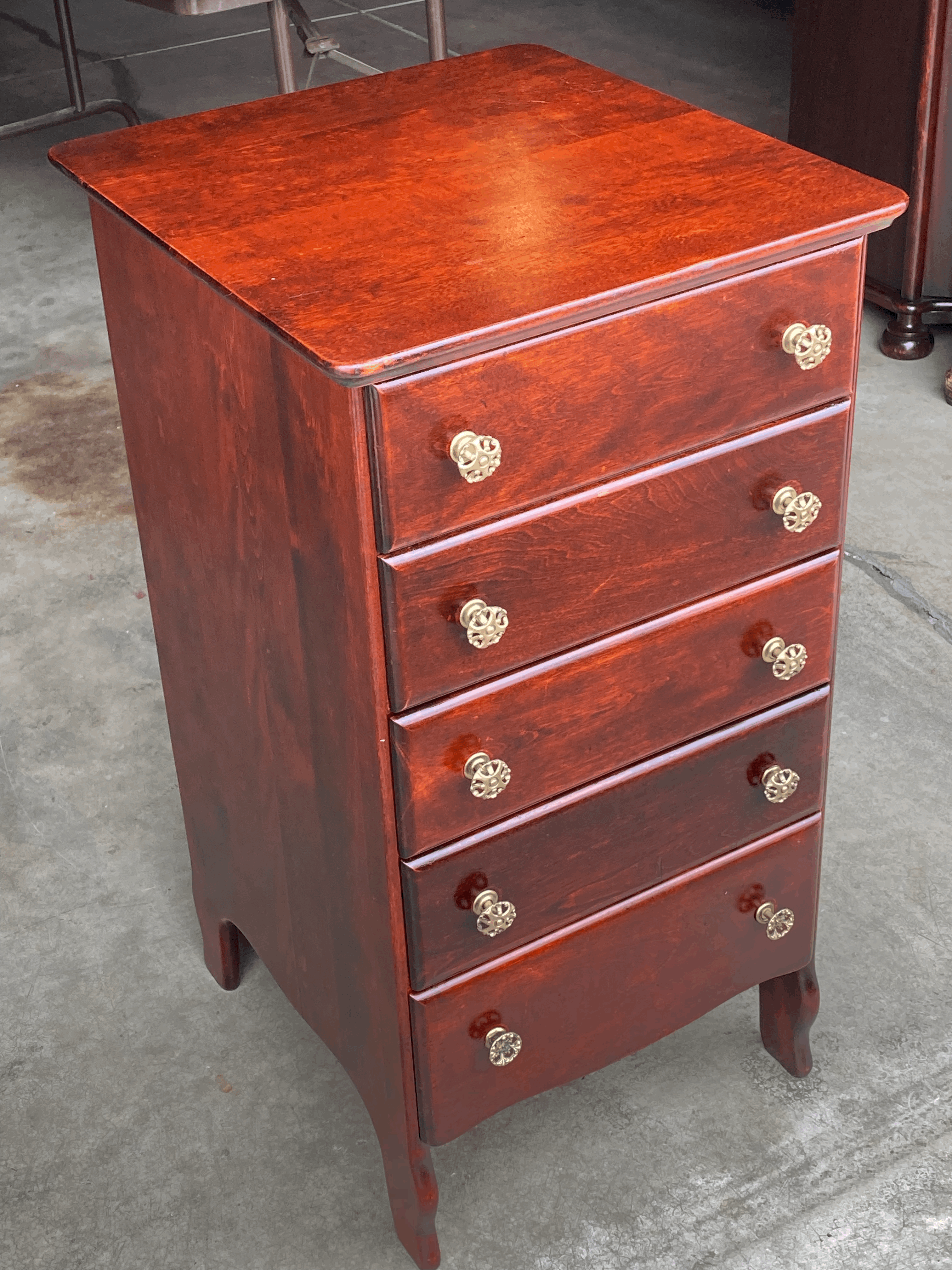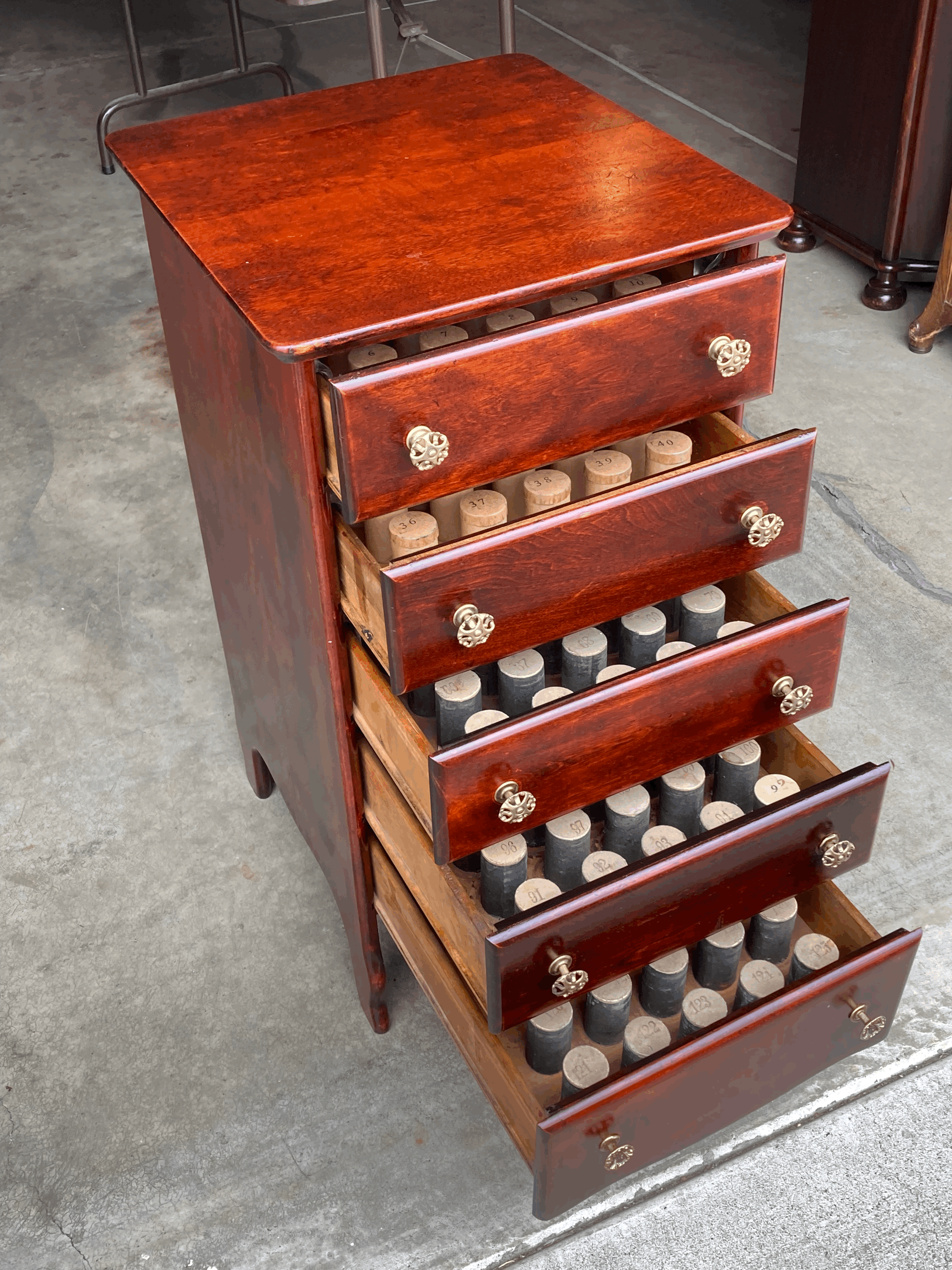 Just cleaned and polished this five drawer cylinder record cabinet. It has all its pegs with about 40% being replacements. The two bottom pulls do not exactly match but your eye is not drawn to them. It's $500 delivered to the Expo. Any questions?
