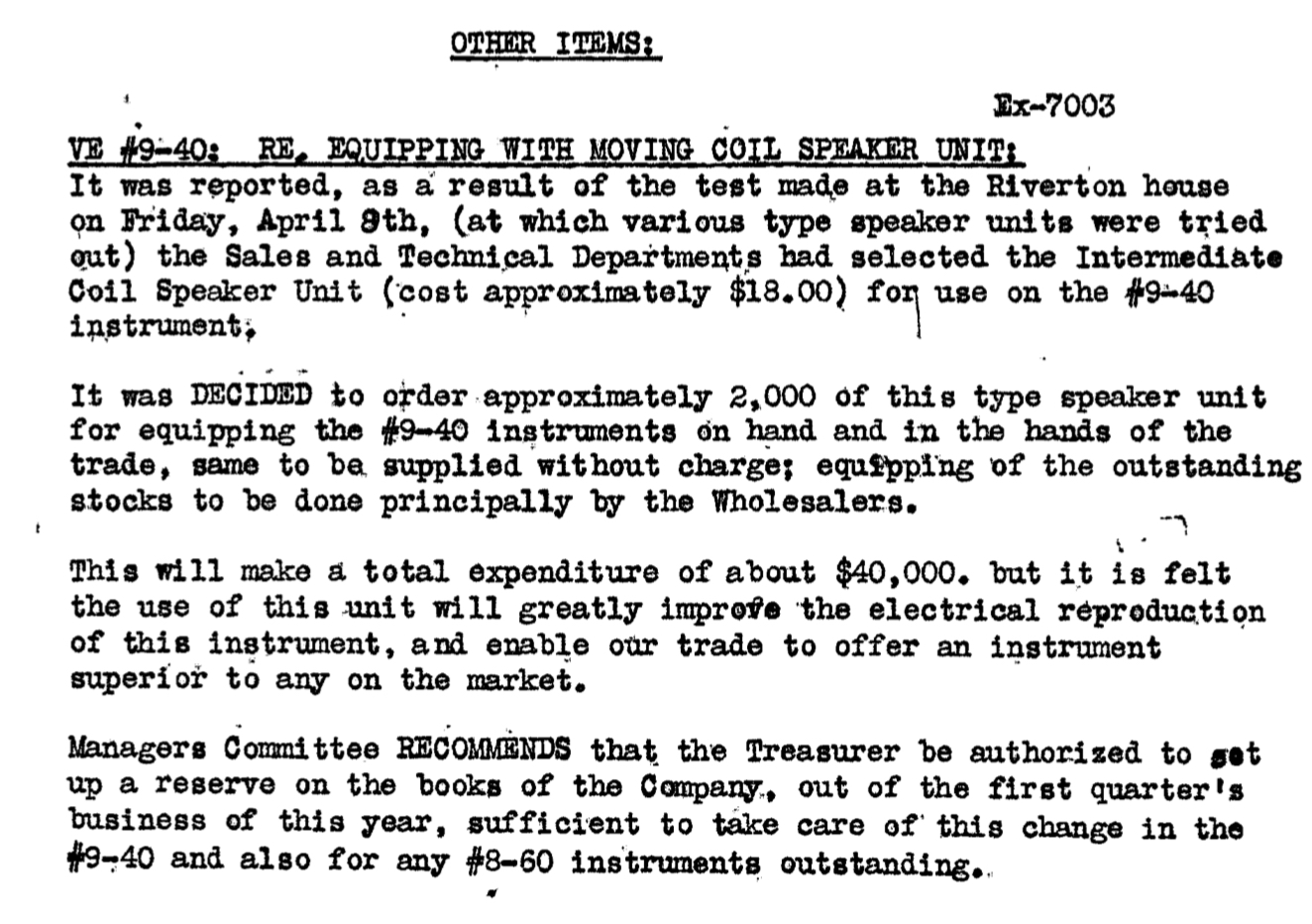 The meeting minutes are fascinating and tell me I had a mistaken idea when I assumed Victor simply had a large left-over stock of moving coil drivers as a result of the 10-51's poor sales. To order 2000 more shows a real commitment to the moving-coil principle; makes me all the more curious about what it actually sounded like. I wonder, too, how significant is the rather off-hand mention of the 8-60. I've heard of the existence of a number of the "revised" 9-40's but I can't remember anyone's reporting a moving-coil 8-60. Their use of words is odd too... "Intermediate unit" . Intermediate between what I wonder?