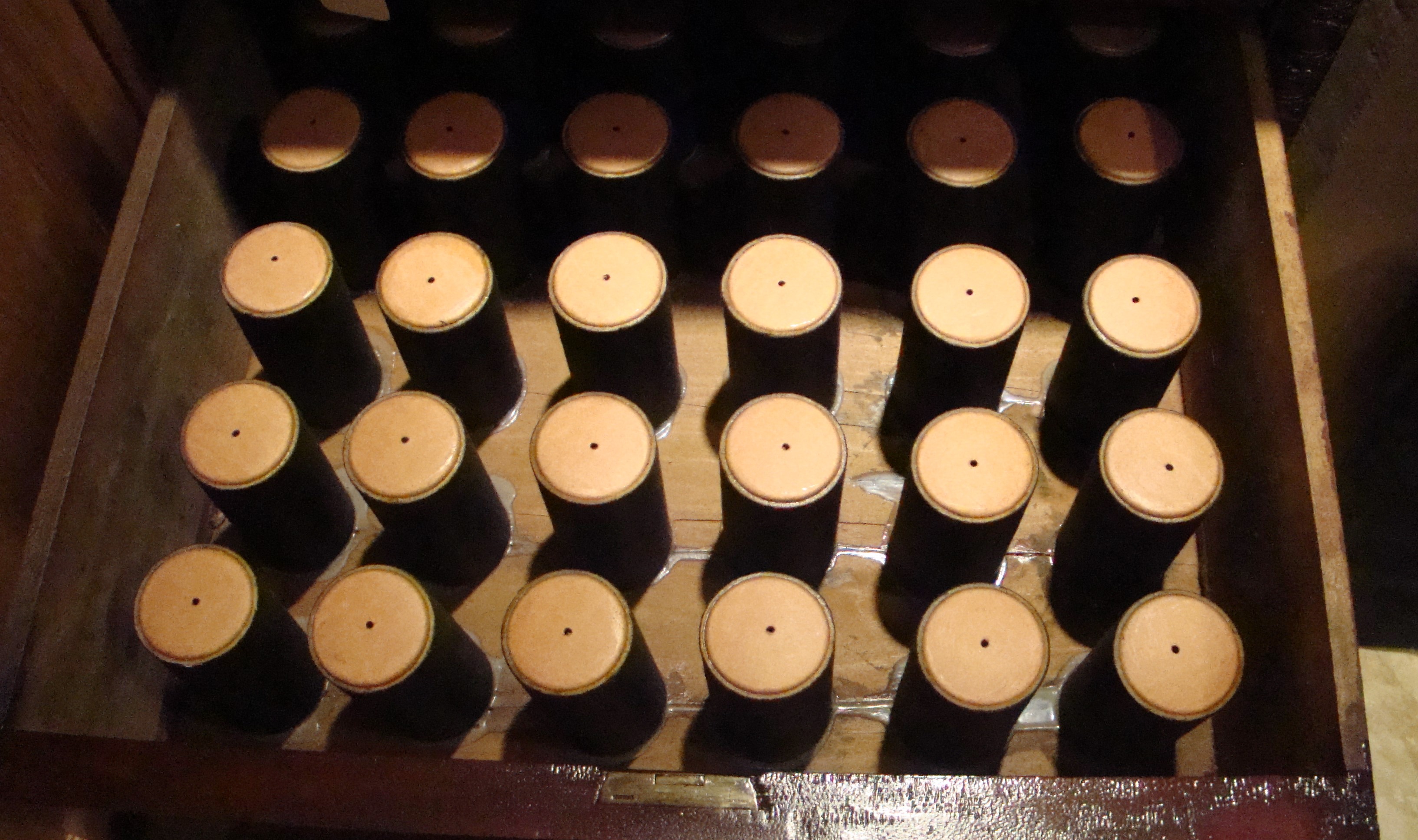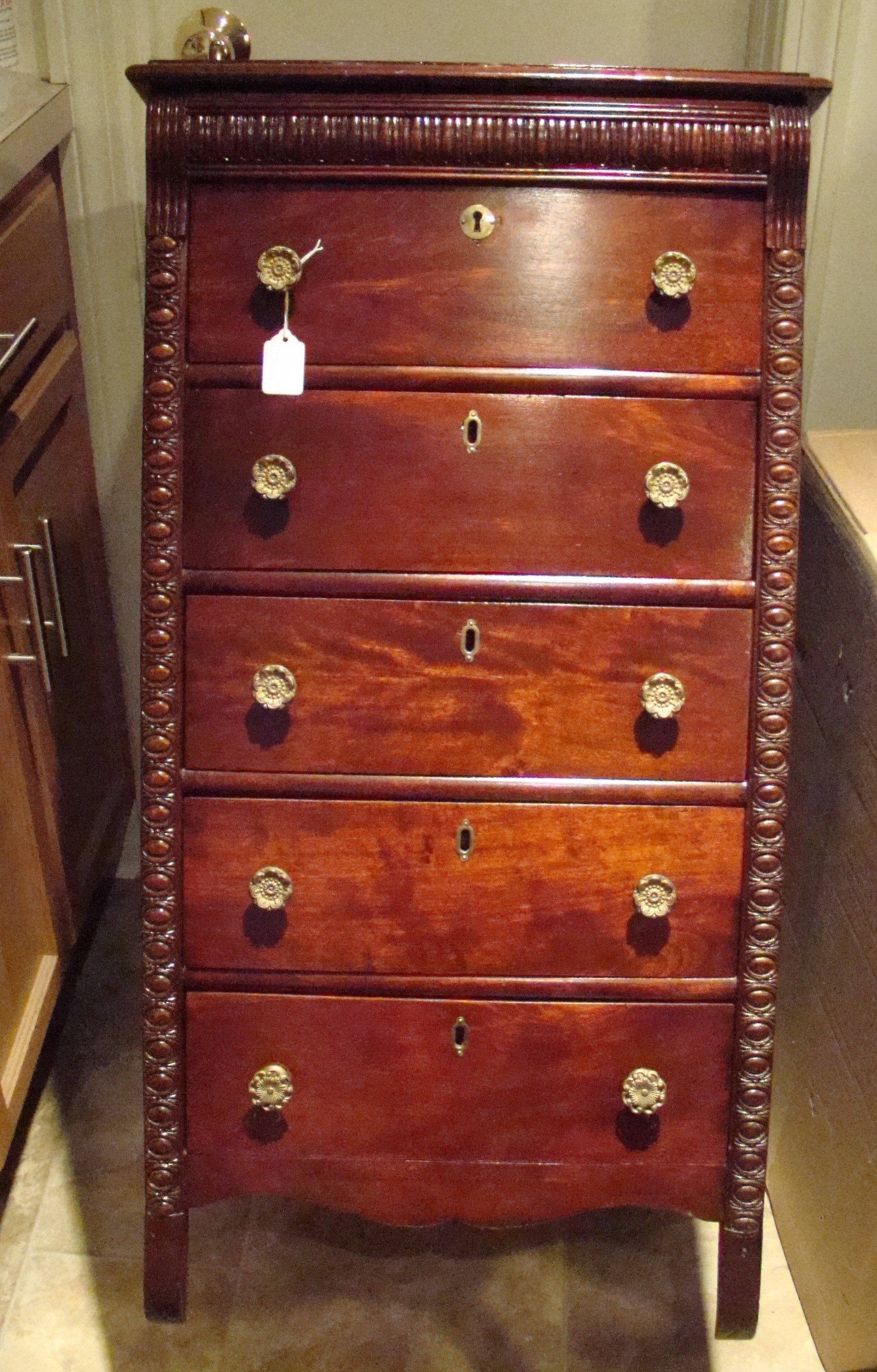 This is an early five drawer cylinder record cabinet in mahogany for 100 cylinders. It has been refinished and has replacement pegs. There is a veneer repair at the back corner of the top. This cabinet can be delivered to the Wayne show.