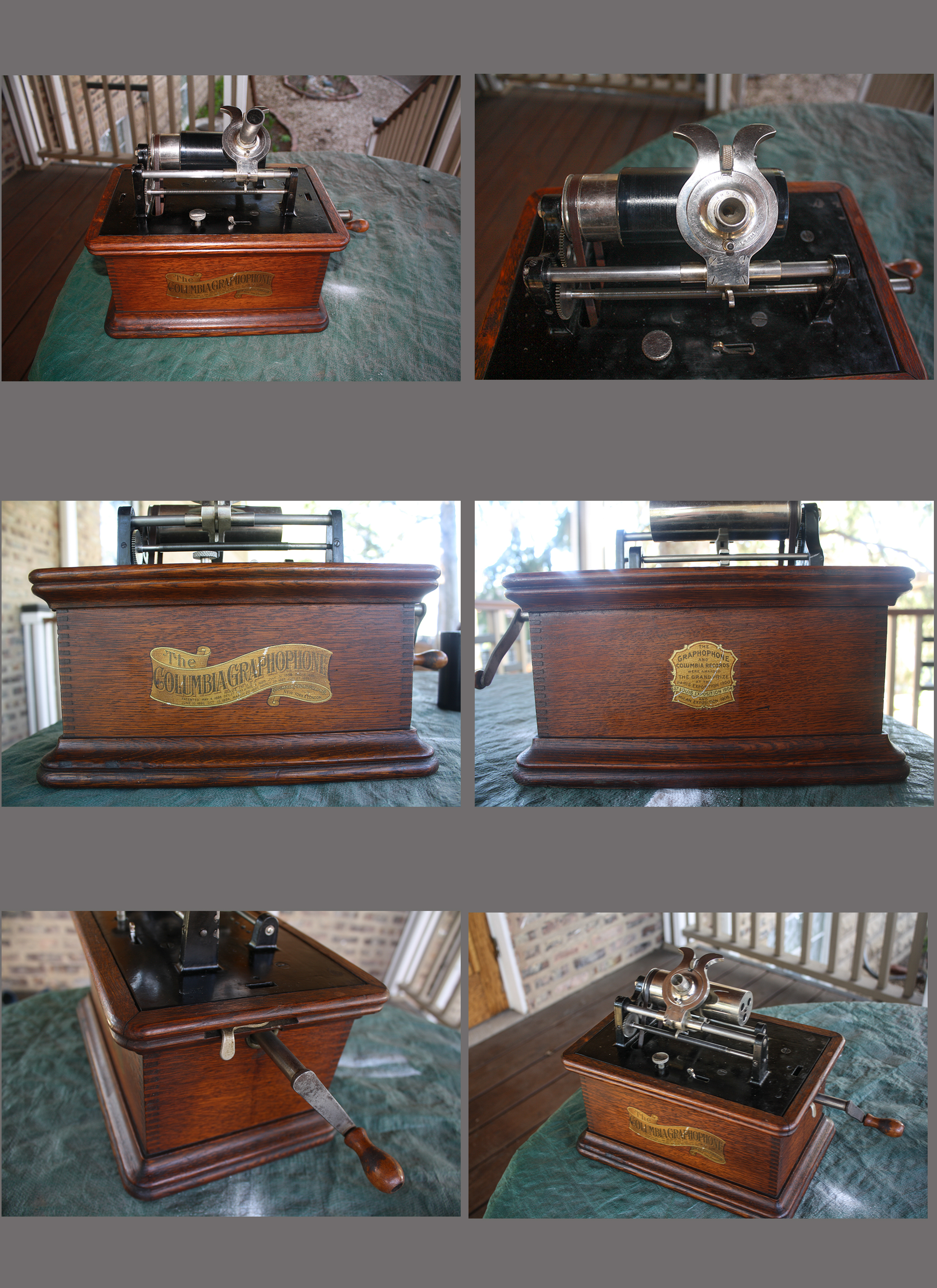 This is my first foray into the world of cylinder photographs. It was very dirty when I received it and it needed a new belt. After a good cleaning and oiling, it worked fine. The lid is slightly smashed in on top and I doubt that anything can be done to repair it. The horn that came with it is very large and missing most of its paint. I don't have a crane for it, so I used a rope and a hook in the celling to hear it play. The crank is from an Edison, but it works fine. I only have one 2-minute cylinder to play, (a march) which I'm not particularly fond of. Hopefully, I will come across one I enjoy this summer. Regardless of its short comings, the price was right and I thought it would be fun to add it to my collection. Thanks go out to my good friend Roger Merenkov who has guided me through the antique phonograph world and suppled the leather belt for this BK.