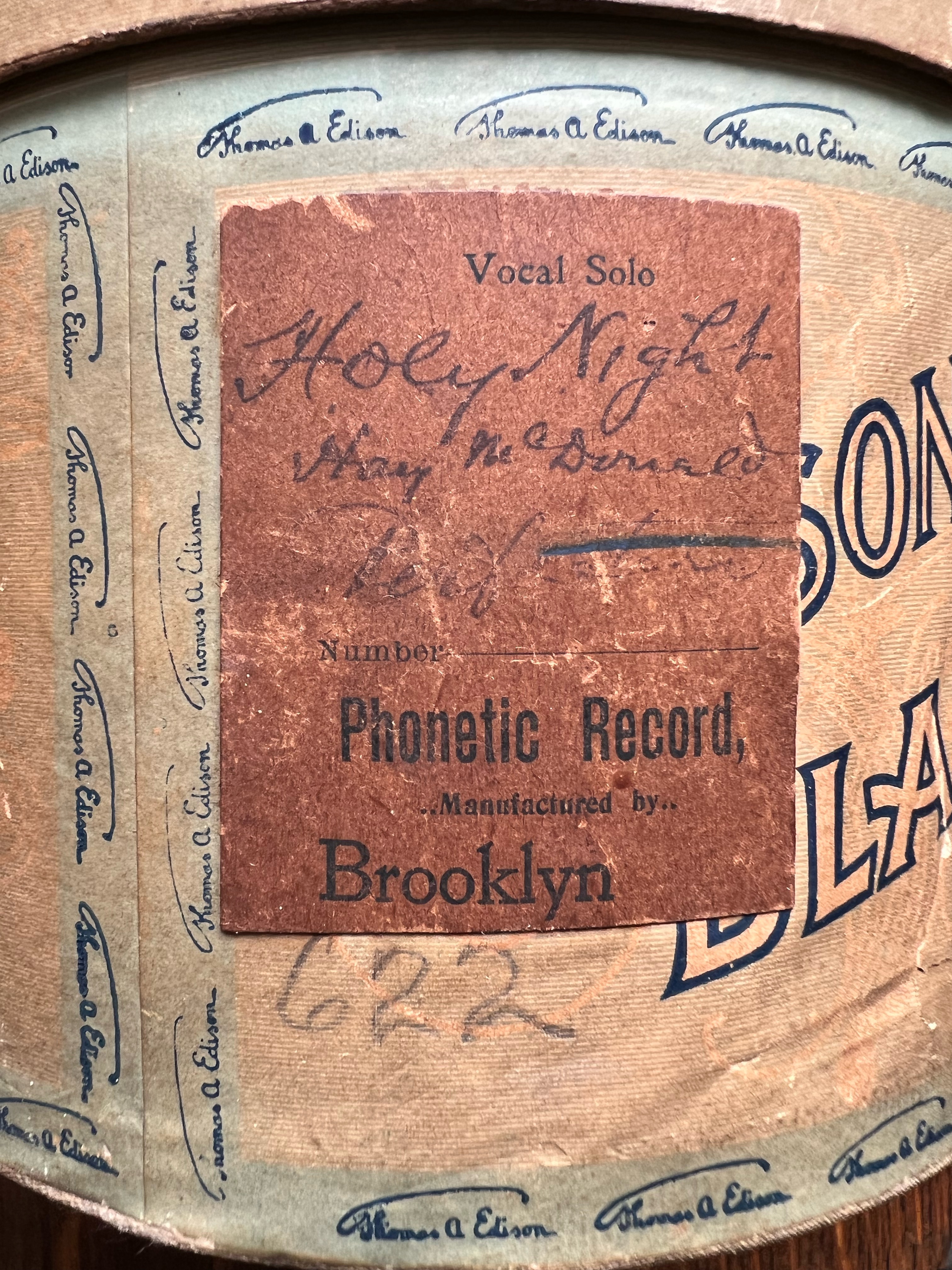 Here is a very interesting Concert cylinder. It is announced “Holy Night” by Harry MacDonough by the Perfection Company (Brooklyn). The cylinder is in an Edison Blank box with a Perfection label glued on the side. Here are a couple pictures of the cylinder and a short video of it playing. I’m interested to hear your comments.