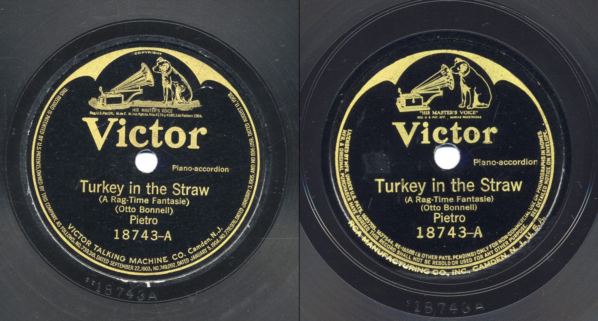 To further confuse things... this isn't the 1923-mid 31 eccentric groove, it's the mid- 1931- 40 design with a lead in to the double eccentric. No lead in groove at the rim... no VE stamp, either- it's acoustic! Let me update that- A side DOES have a very faint outer rim lead-in groove... and it's NOT an "add-on" lead in groove like some of the 1940s repressings of 1920s Orthophonics that abruptly scoops the needle into an existing groove... it leads in like a later Victor record of te late 30s.