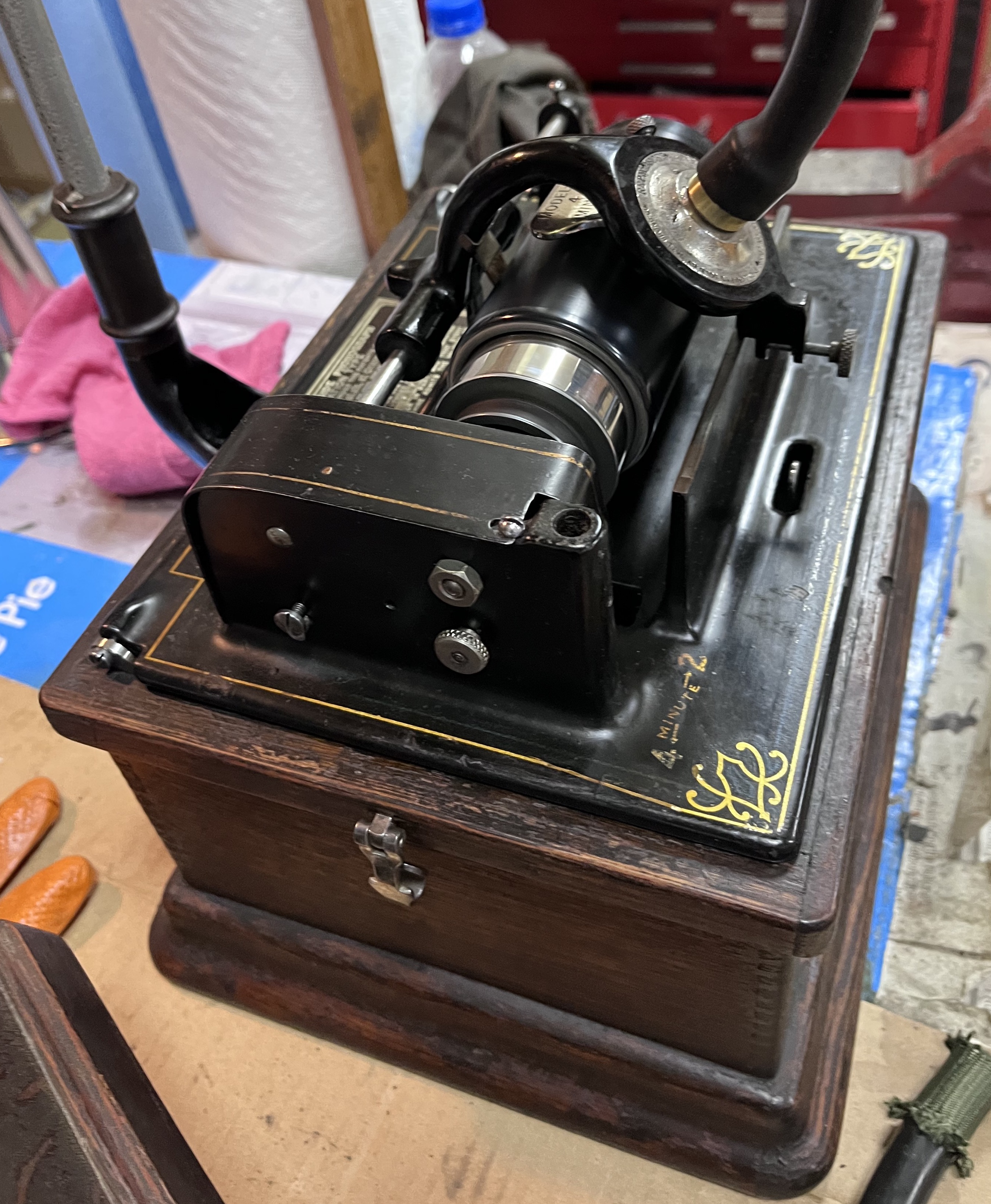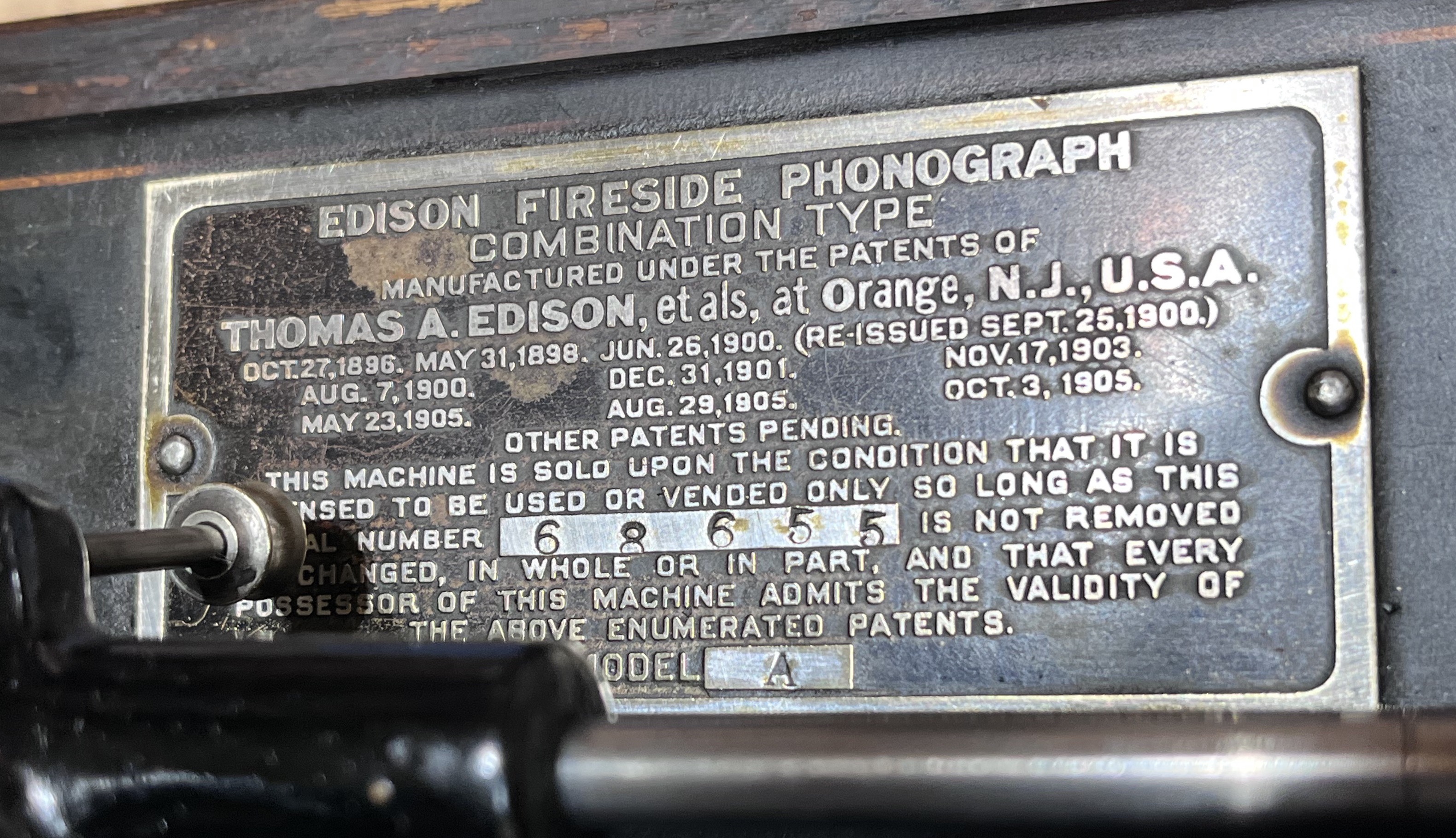 This is an Edison Fireside Phonograph, Model A, Combination. It was first marketed in July 1909. It has an Oak case and lid, both of which are in excellent condition. The Edison decal on the front of the case is there but is missing some of the letters. Some of the finish has come off but the case coloring has been blended so that you must look hard to know it is missing. The bedplate striping is 95% there. It has a No. 10 Edison Cygnet horn that is also in very good condition. It is supported by the crane mounted on the Back of the case. The bottom portion of the crane has been painted silver. The phonograph plays both 2 and 4 minute cylinders and has a Model H reproducer with a good stylus. The phonograph comes with 12 cylinders.