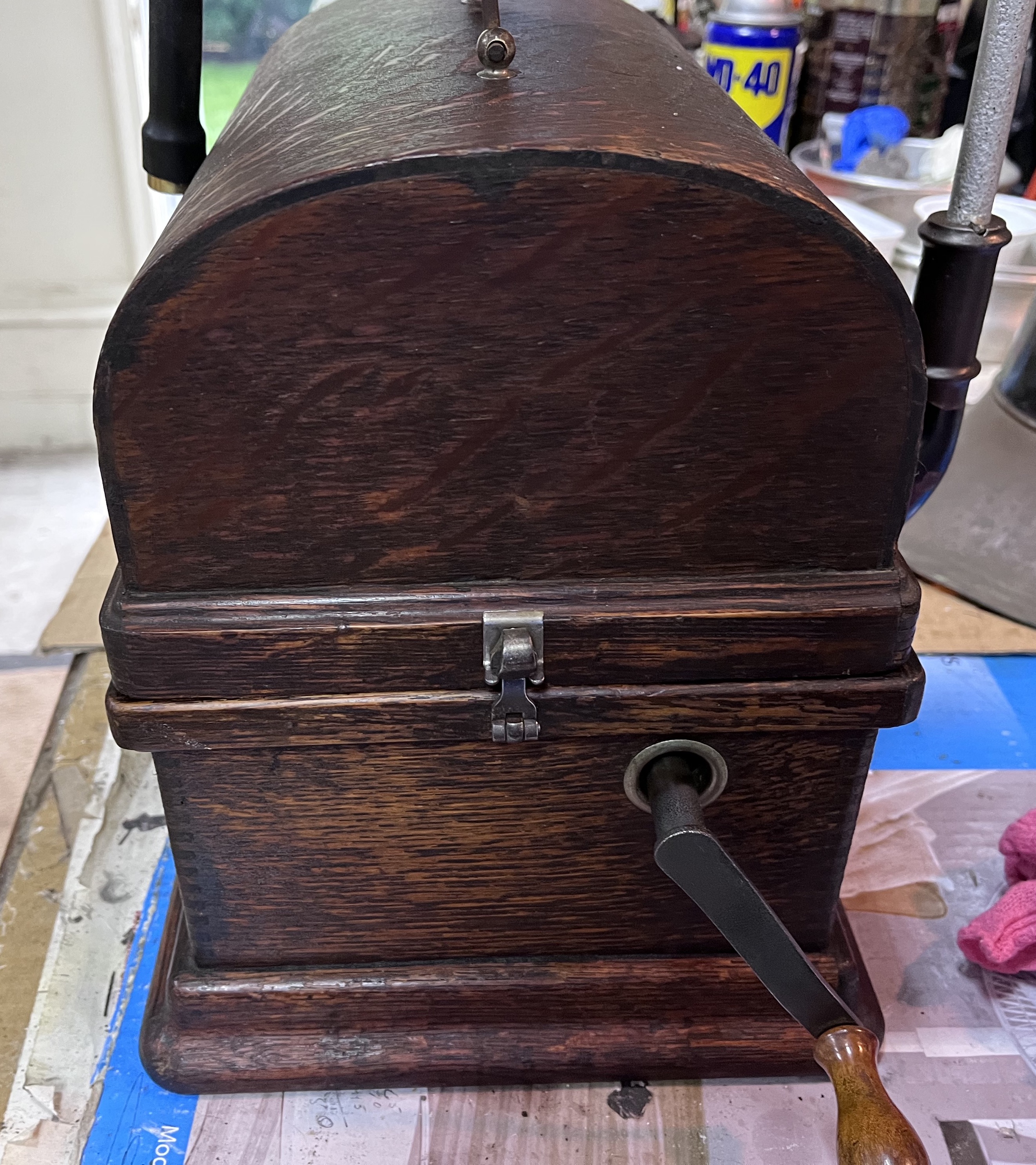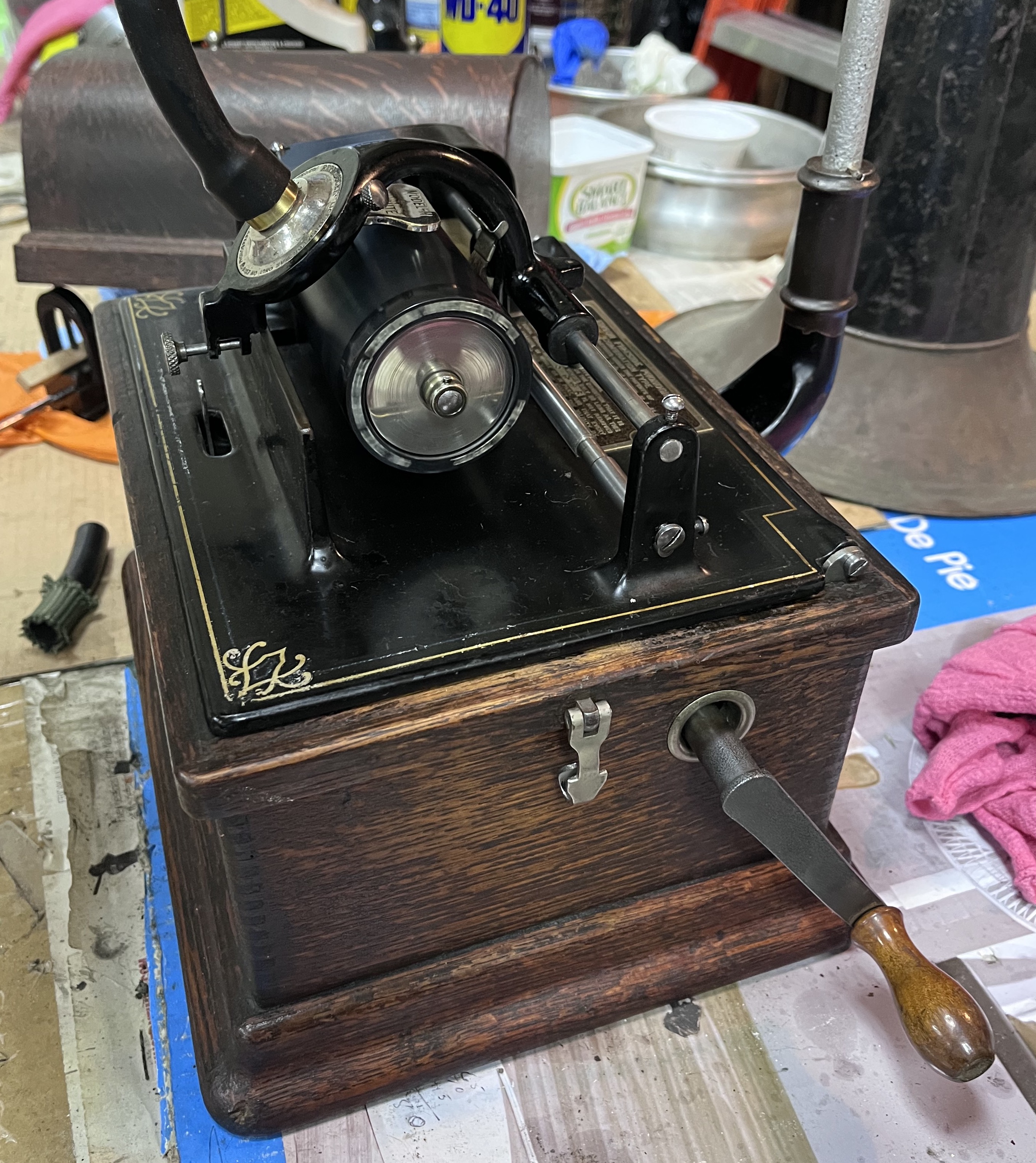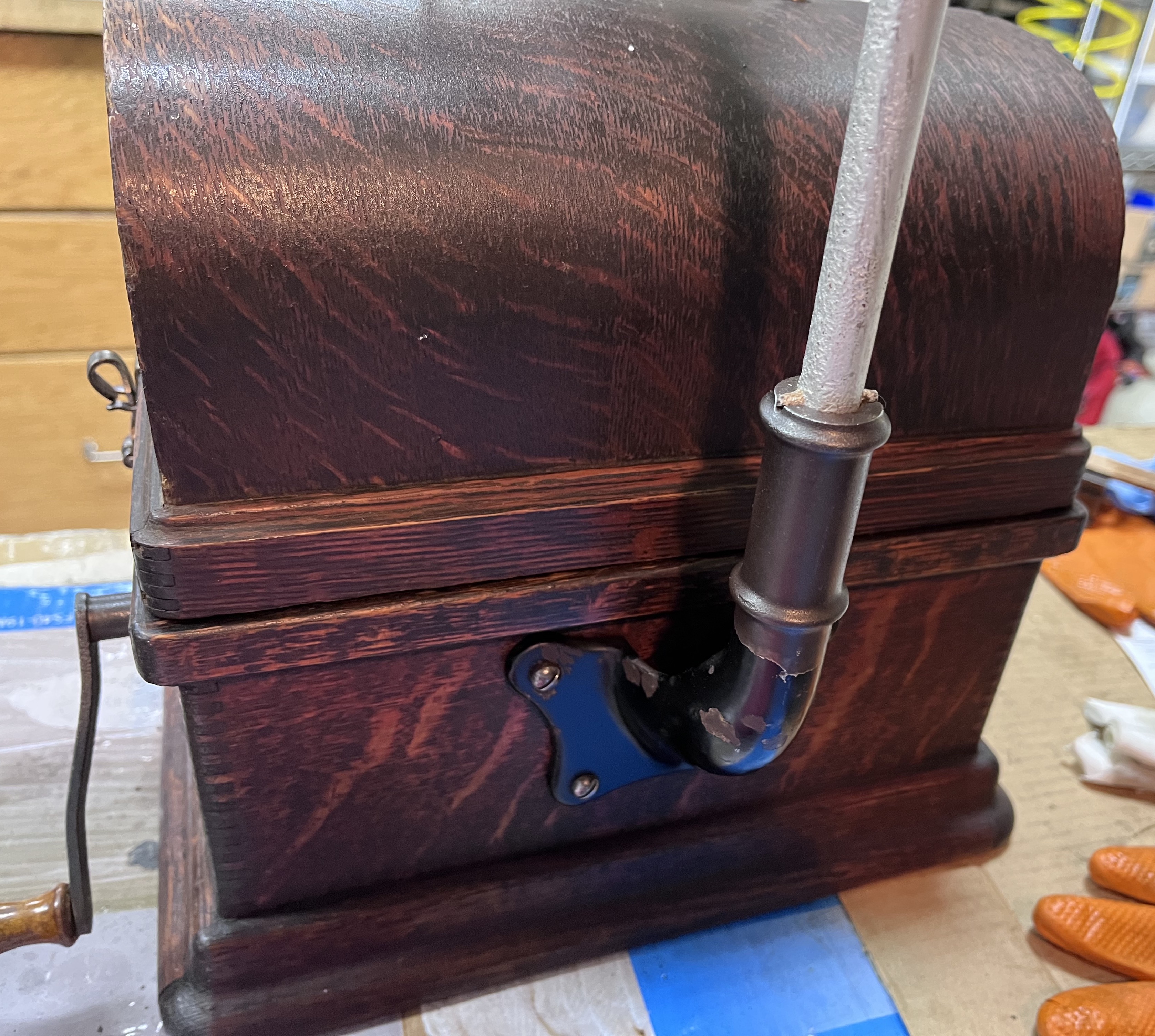 The phonograph has been restored, as appropriate. The motor has been taken apart, cleaned, and sparingly lubricated. The top mechanism has been taken apart, cleaned, polished, and lubricated. The reproducer has been rebuilt. The entire mechanism has been adjusted and plays perfectly.