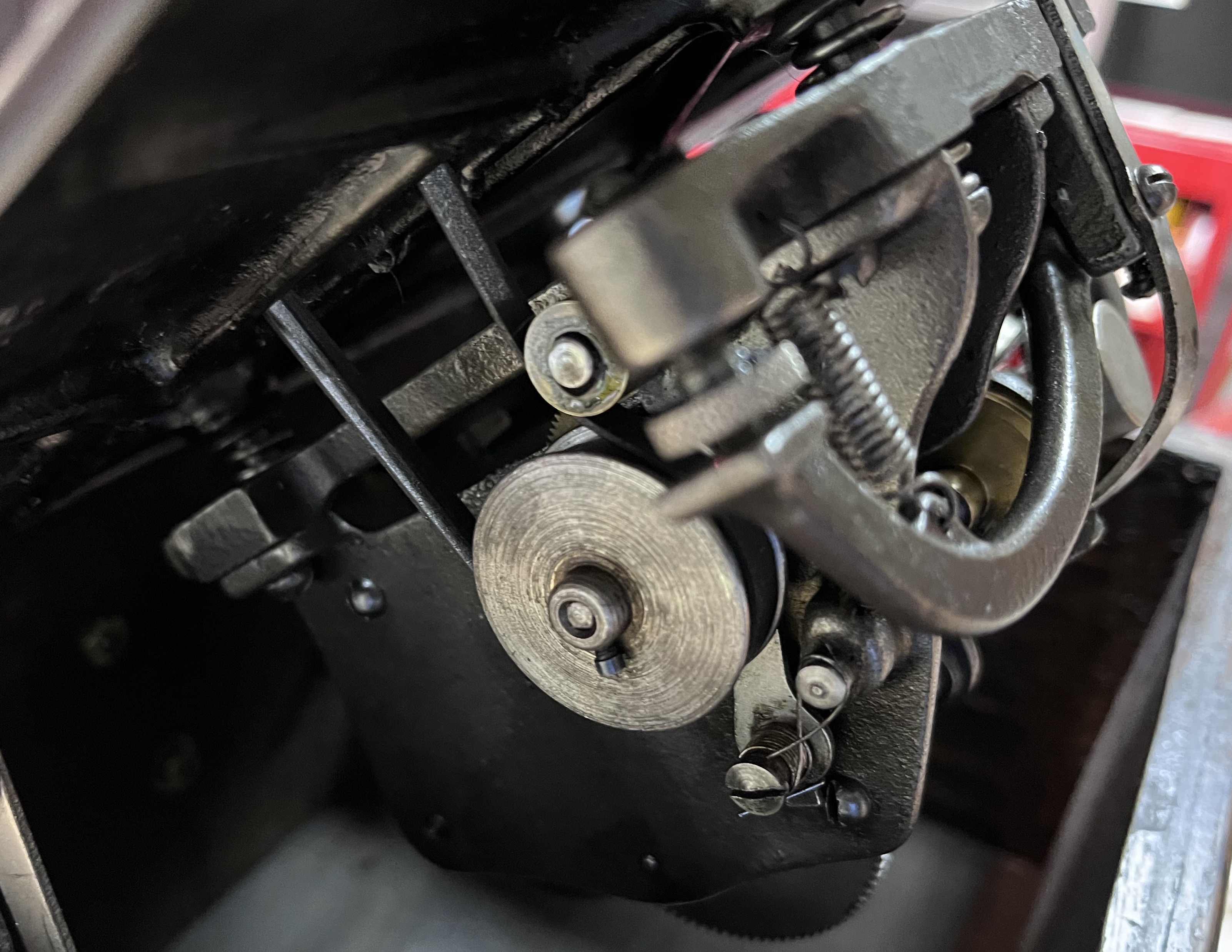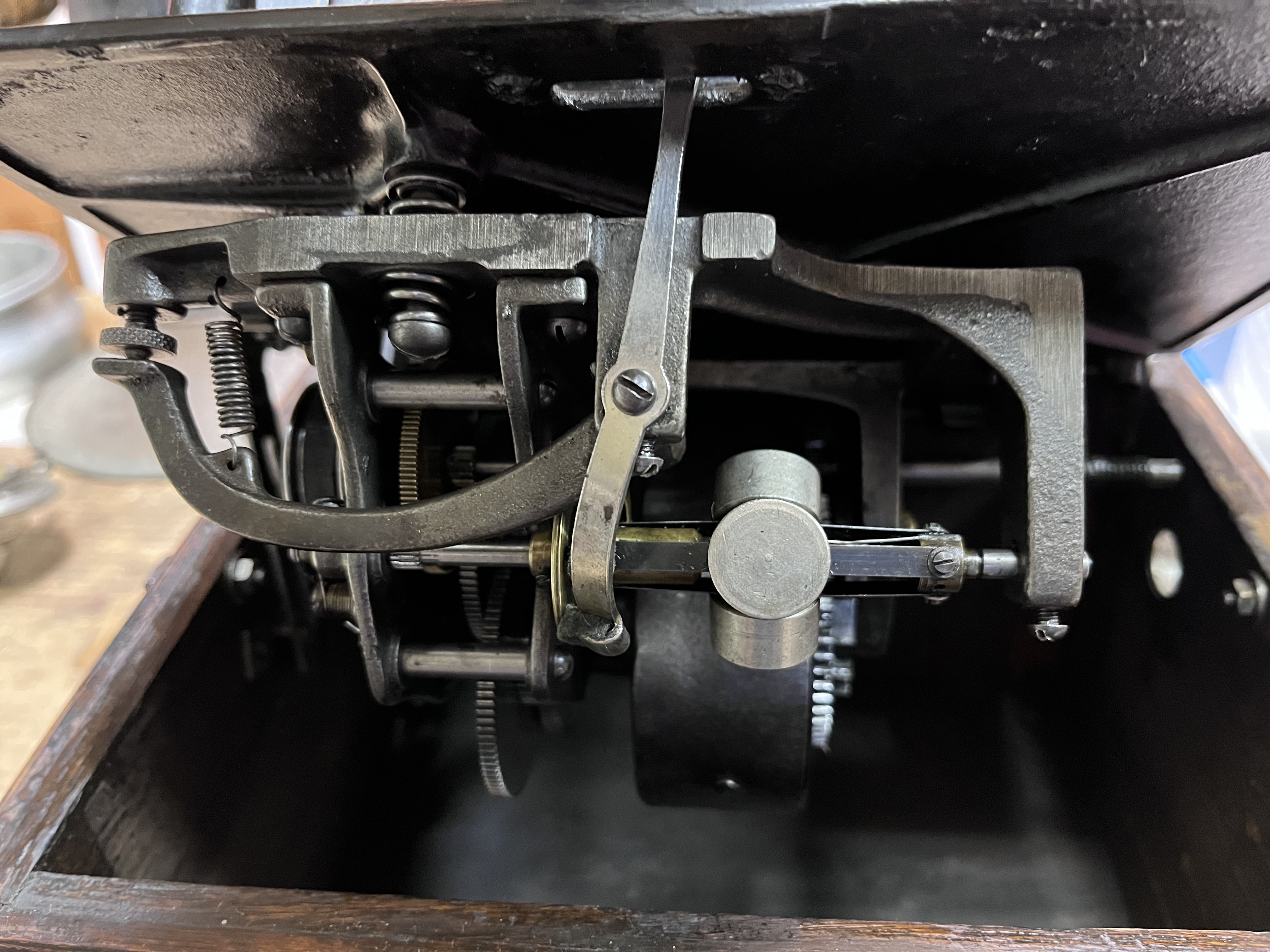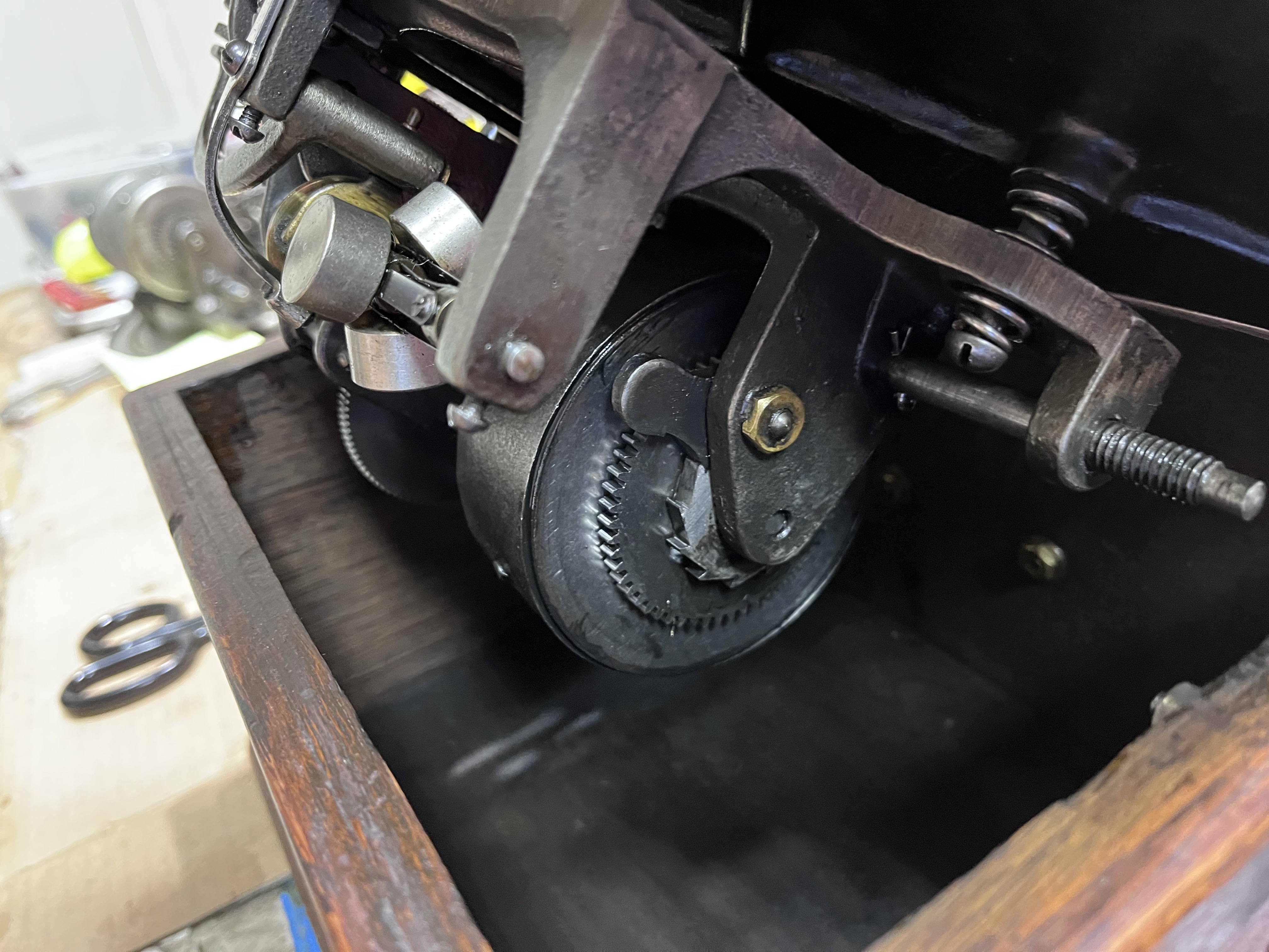 The phonograph has been restored, as appropriate. The motor has been taken apart, cleaned, and sparingly lubricated. The top mechanism has been taken apart, cleaned, polished, and lubricated. The reproducer has been rebuilt. The entire mechanism has been adjusted and plays perfectly.