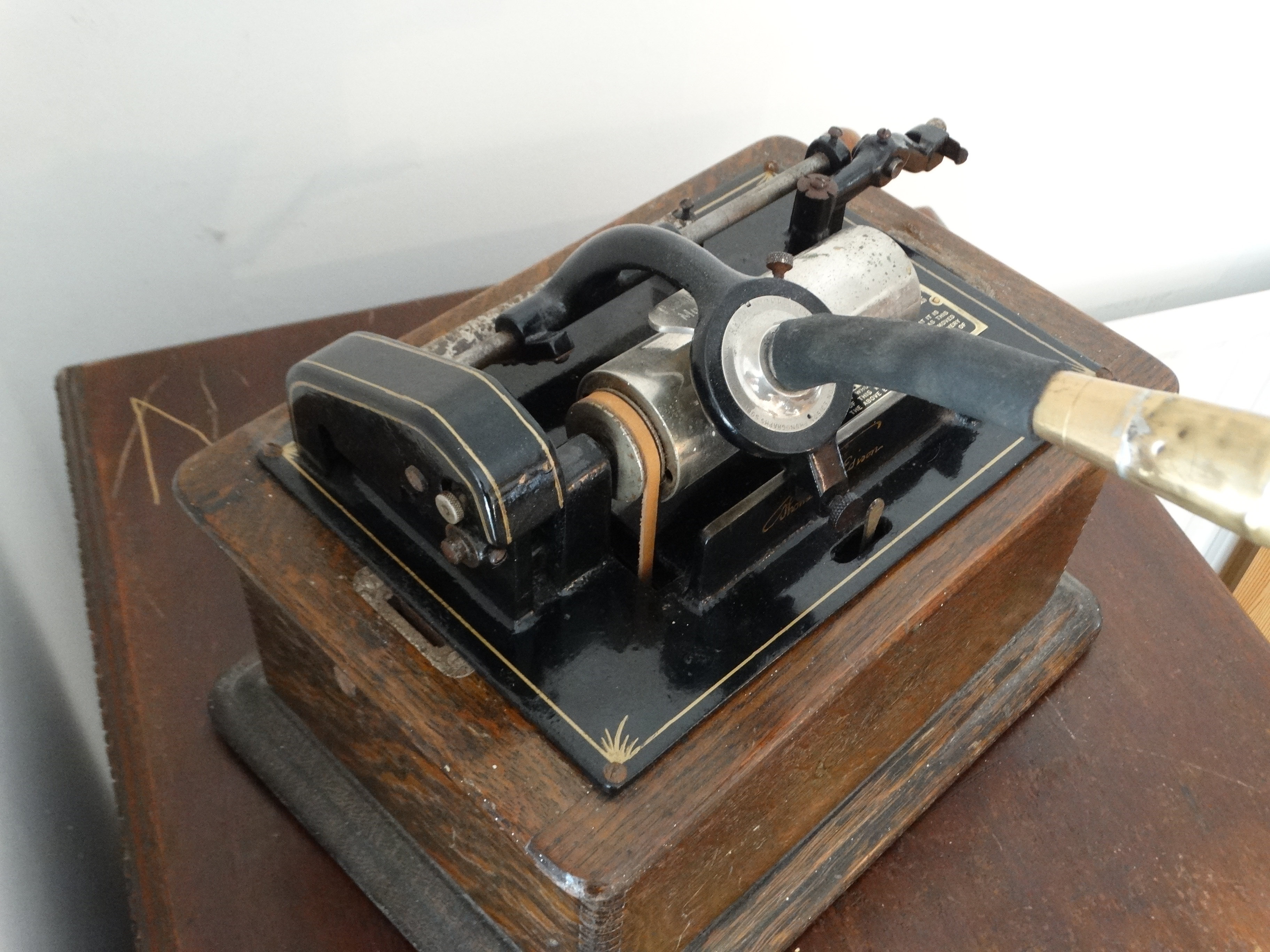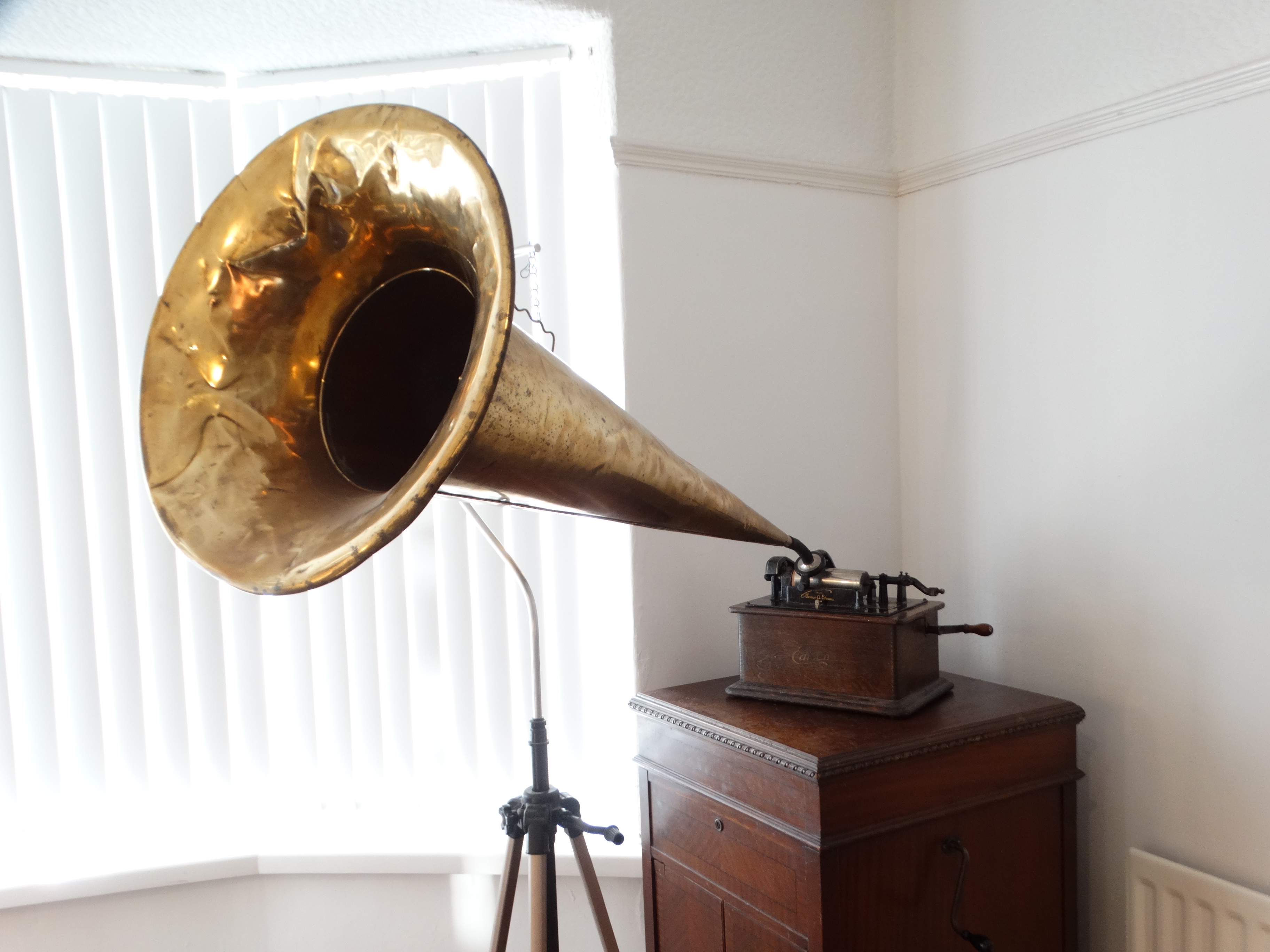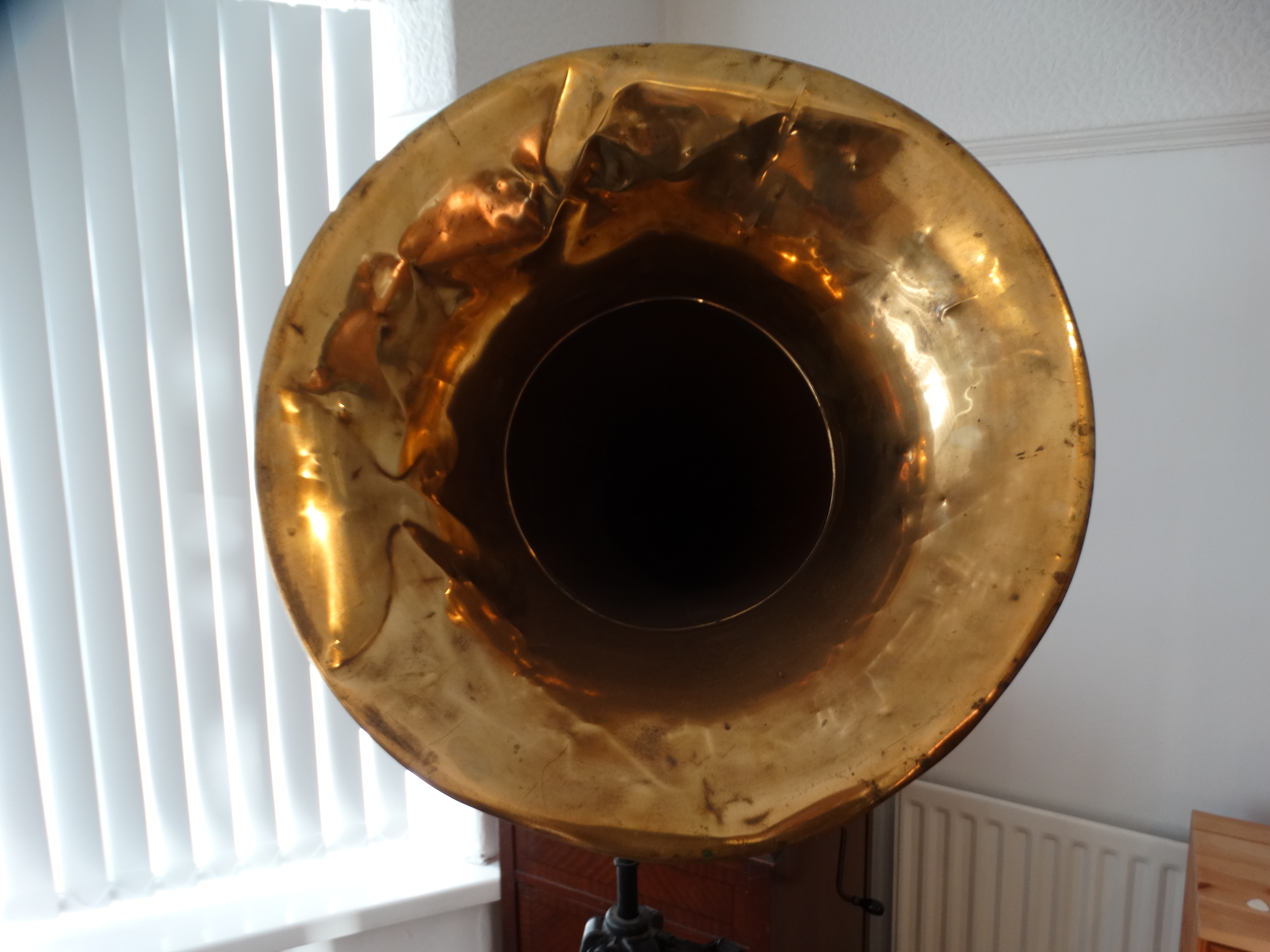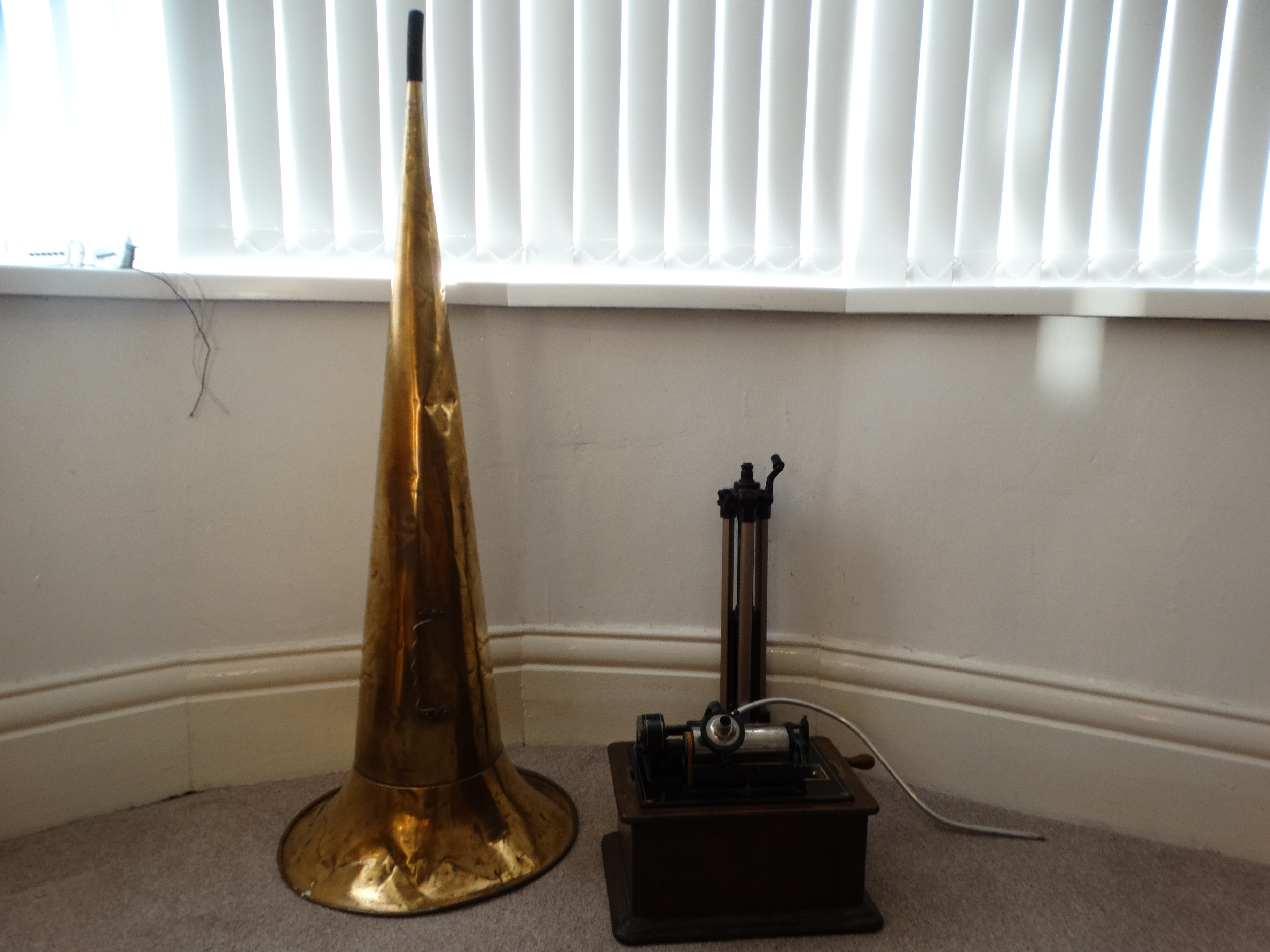 This is an interesting phonograph, it was found locally to me (North Shields, UK) as you see it here with a 42" concert horn, believed to have been with this phonograph from the start, it is assumed this phonograph could have been used for giving smaller local phonograph concerts, this is largely speculation though.