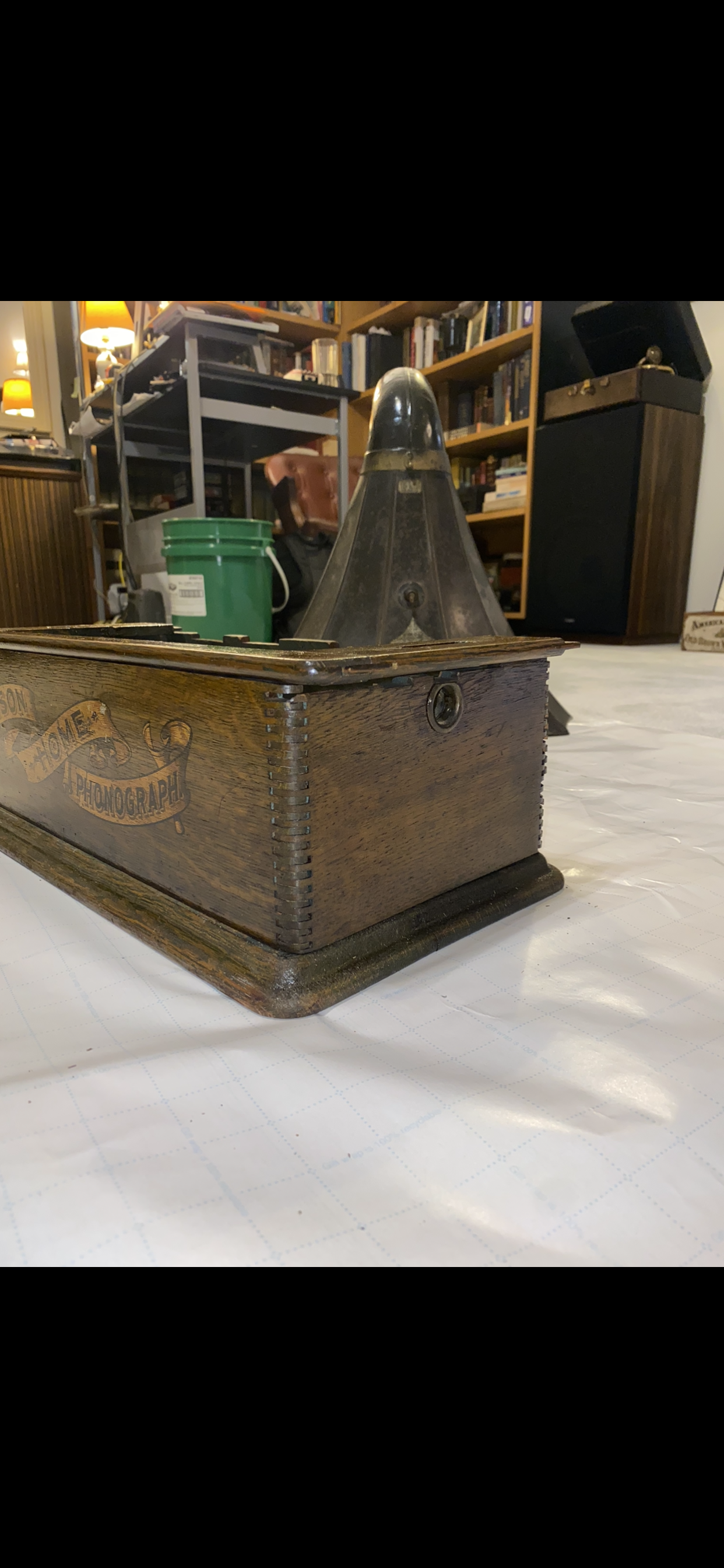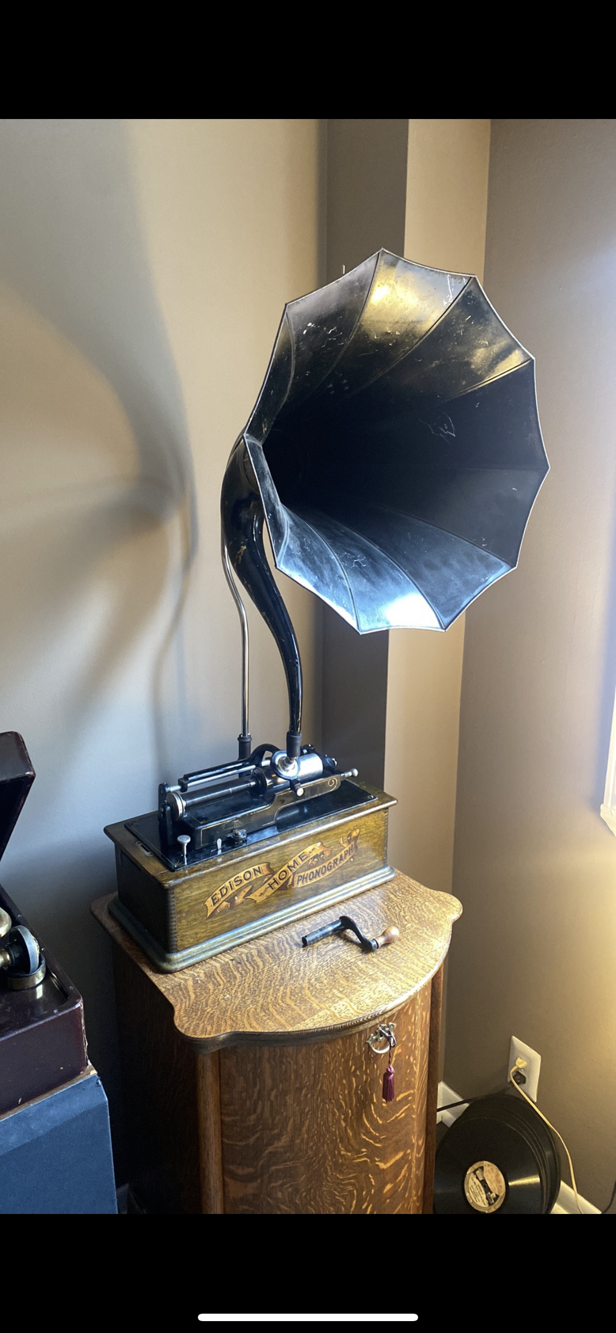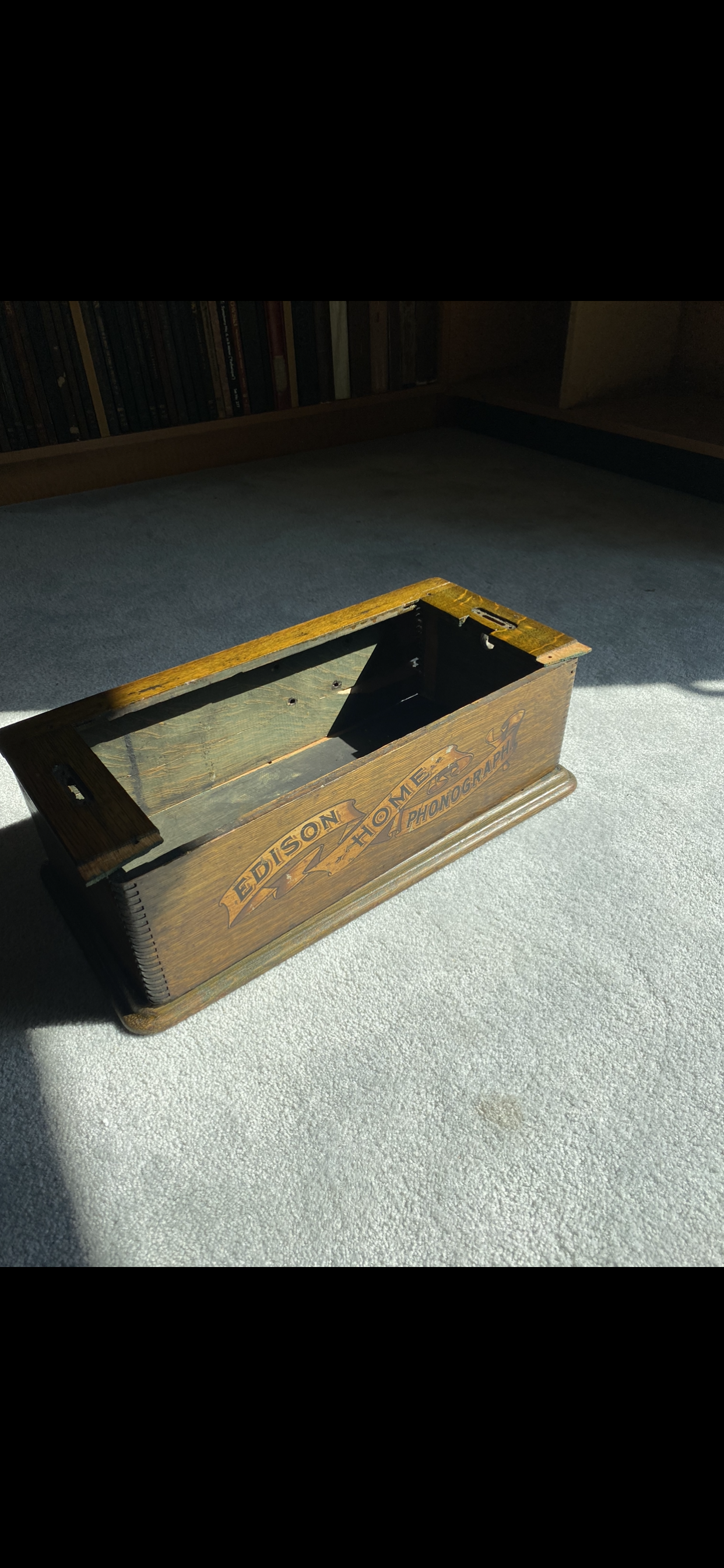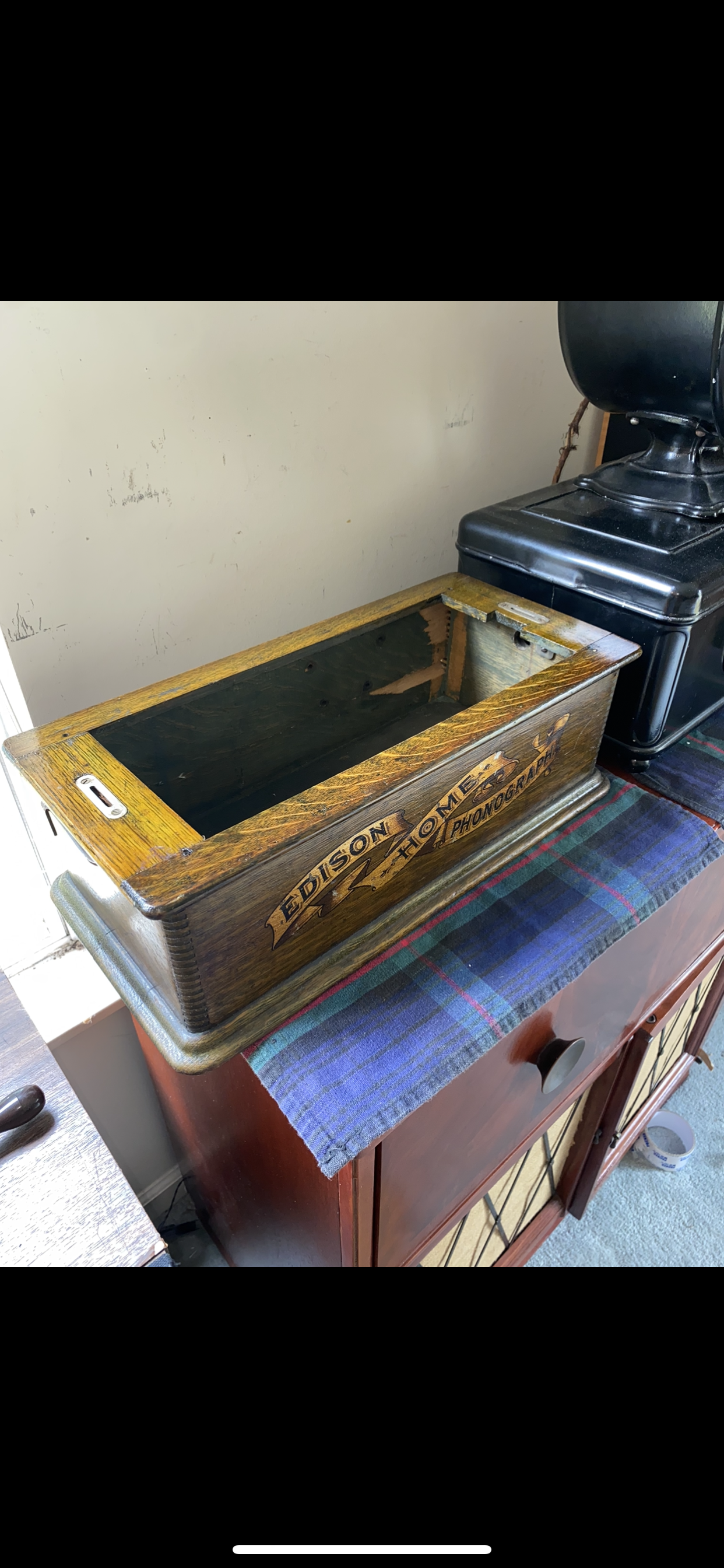 I suspect your machine is a Model A Home. I worked on a 1904 Home A that looked like it had come out of a time mchine and needed very little to put back in service for recording and playing back 2-minute cylinders. The nice thing is, you'll have an external speed control; the not-so-great thing is that there's a complete Home bedplate on eBay right now with 2/4 gearing--and it is the Model B. The top frame on yours is the big one that'll need to fit the long iron frame of the old type Model A bedplate. I would have suggested putting an early B mechanism in it if there were Home B's with the bottom of an A case fitted, but that's not something I'm sure would be authentic-looking. A lot of work to show off that great banner decal but it should be worth it. Will be looking around to see if a bed plate comes up. Unfortunately I don't have one; my bedplate is for my own Model B Home which will be completed when I get back up to it and pull all the nickel off and take it to the plater's.