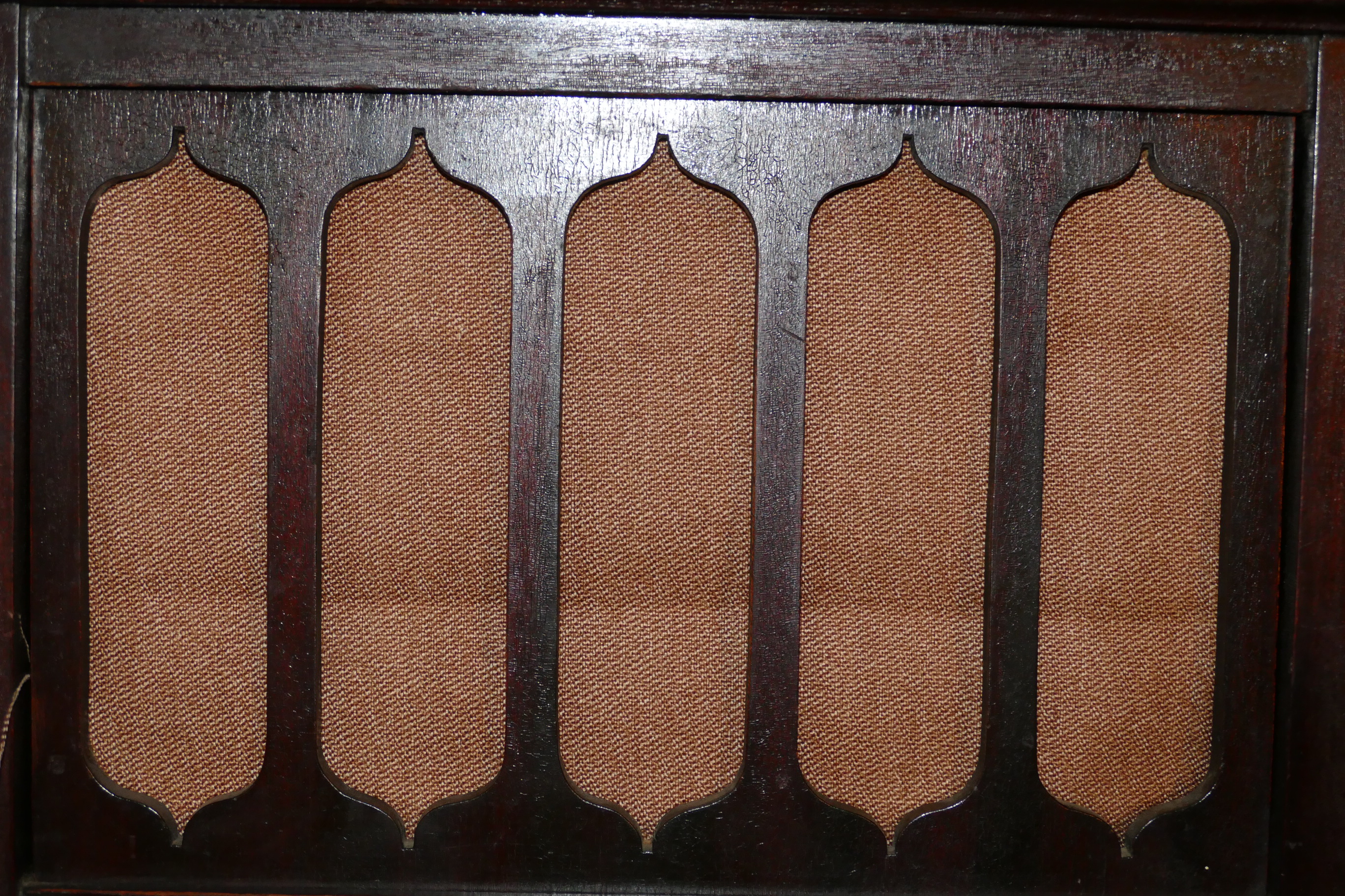 Here is an all original mahogany Amberola 50 with original grilled cloth louvers as a reference. This phonograph stood the test of time as the mahogany finish still shines beautifully, with minor hint of crazing. Nothing was done to the finish.