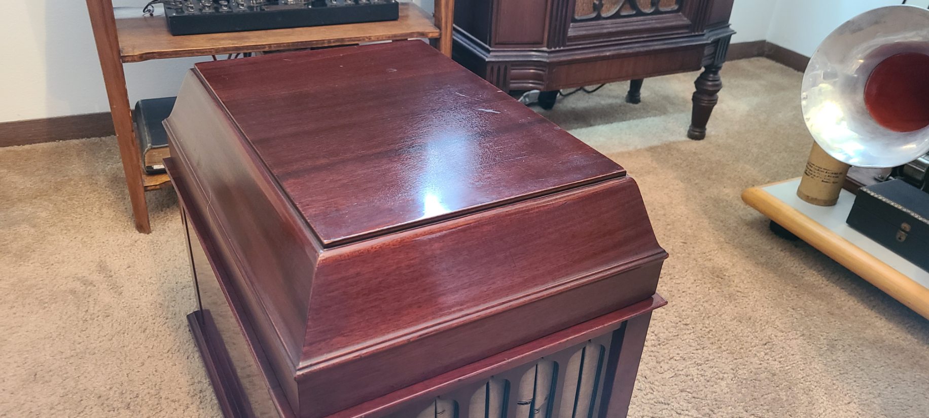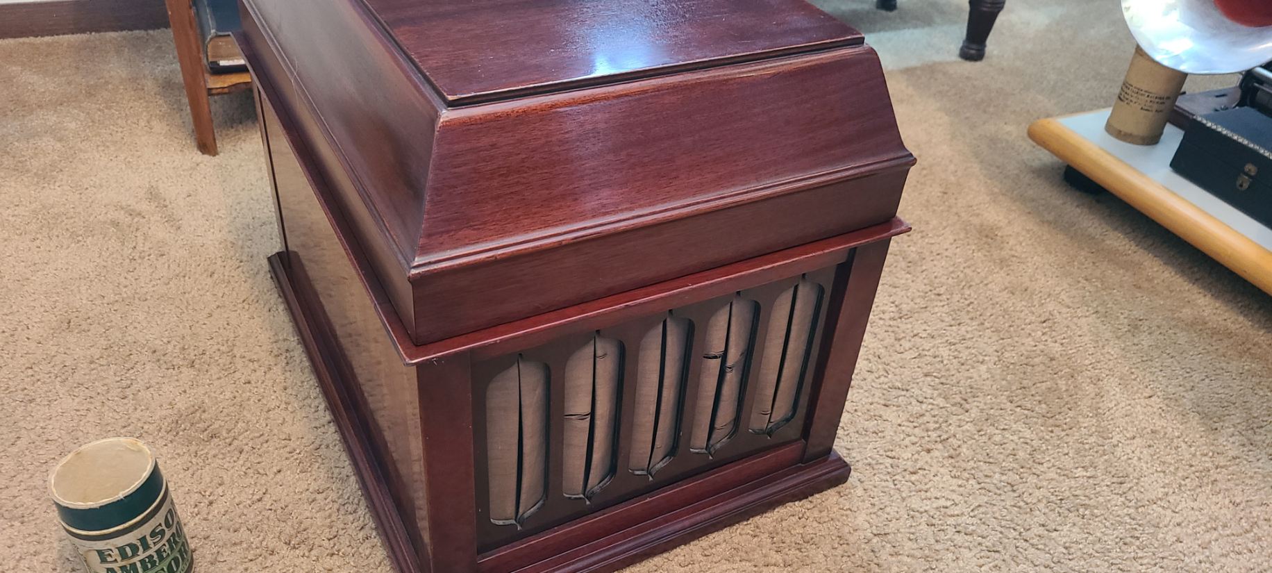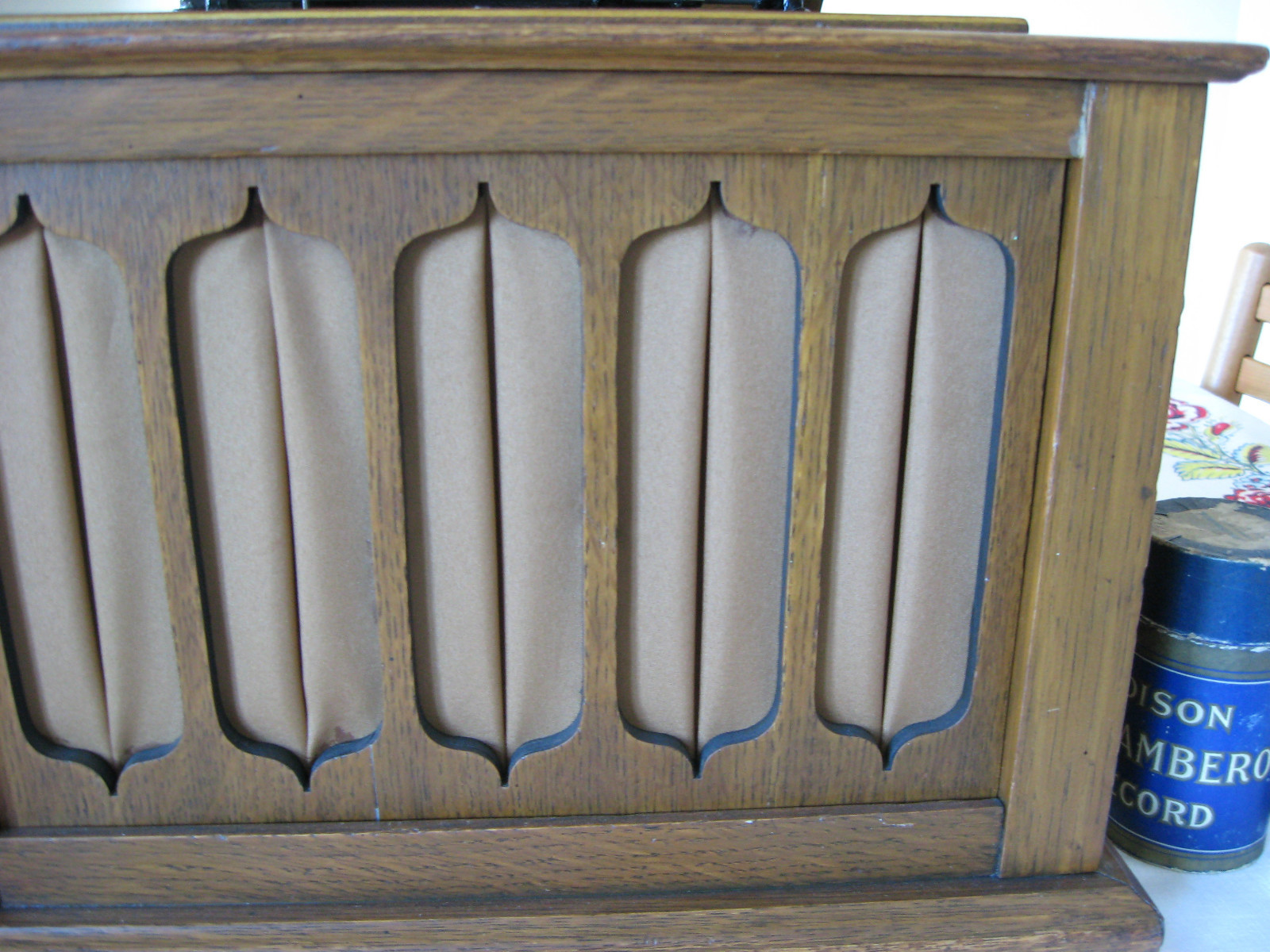 Hi, everyone. I recently picked up a lovely Edison Amberola 50 that had been in the same family since new. It's in wonderful condition, although somewhere along the line, someone replaced the grille cloth. (They didn't bother ironing it first, as you can see!) Does someone out there have a 50 with its original grille cloth? If so, would you be so kind as to post pictures of it? And if anyone has any leads as to where I can get a reasonable facsimile, I would be grateful for them. Thank you!