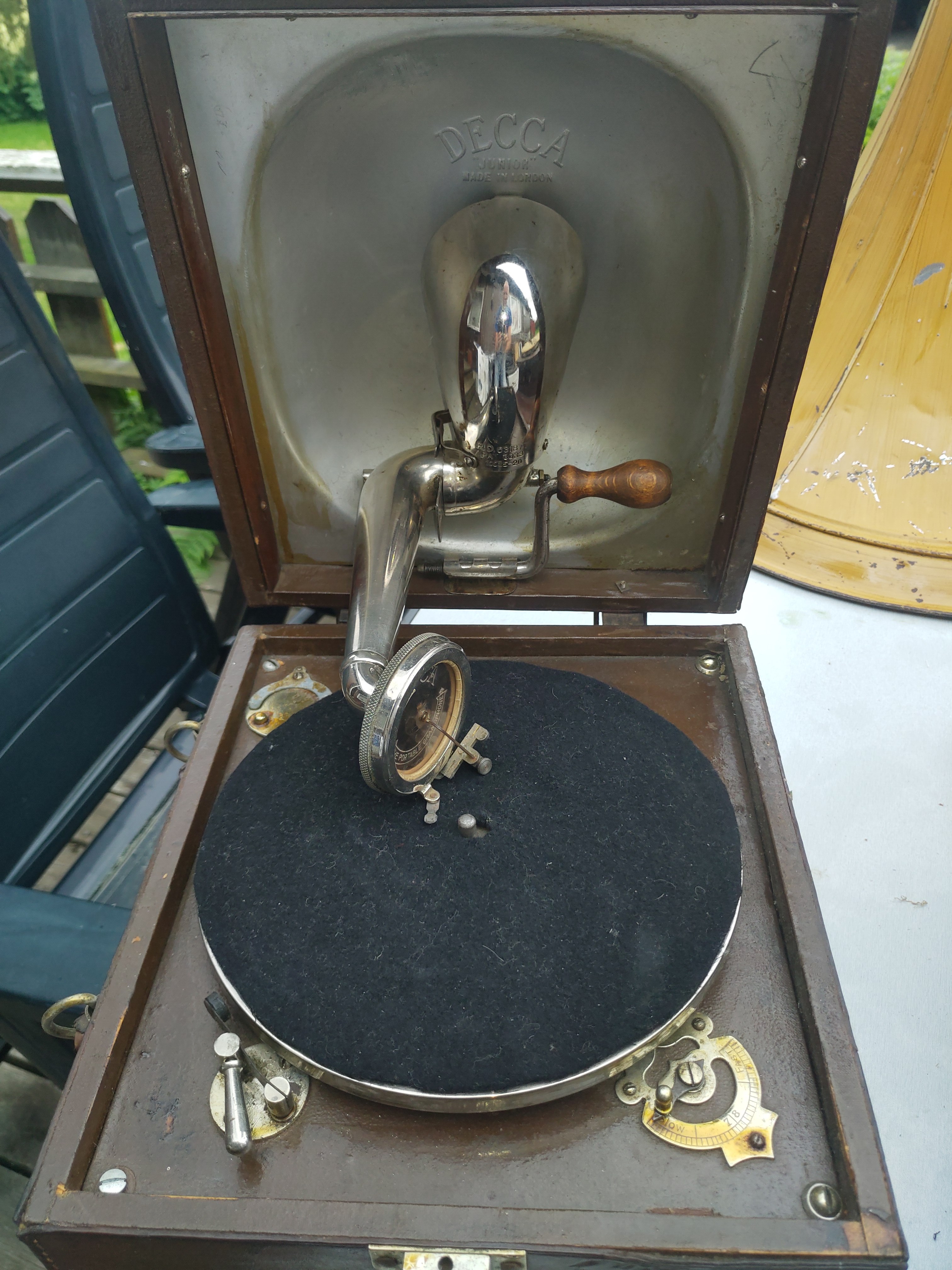 I was out today, getting home a horn for the HMV school model shown in another thread some weeks back. I was lucky to find a German DGAG horn that I can use for this purpose some weeks back, and collected it today. At the same time, I was offered a leather covered Decca trench model at a very good price, and could not resist it. I don't own any Deccas, and I believe this is a pretty early model? I am showing some photos of both the Decca and the horn.