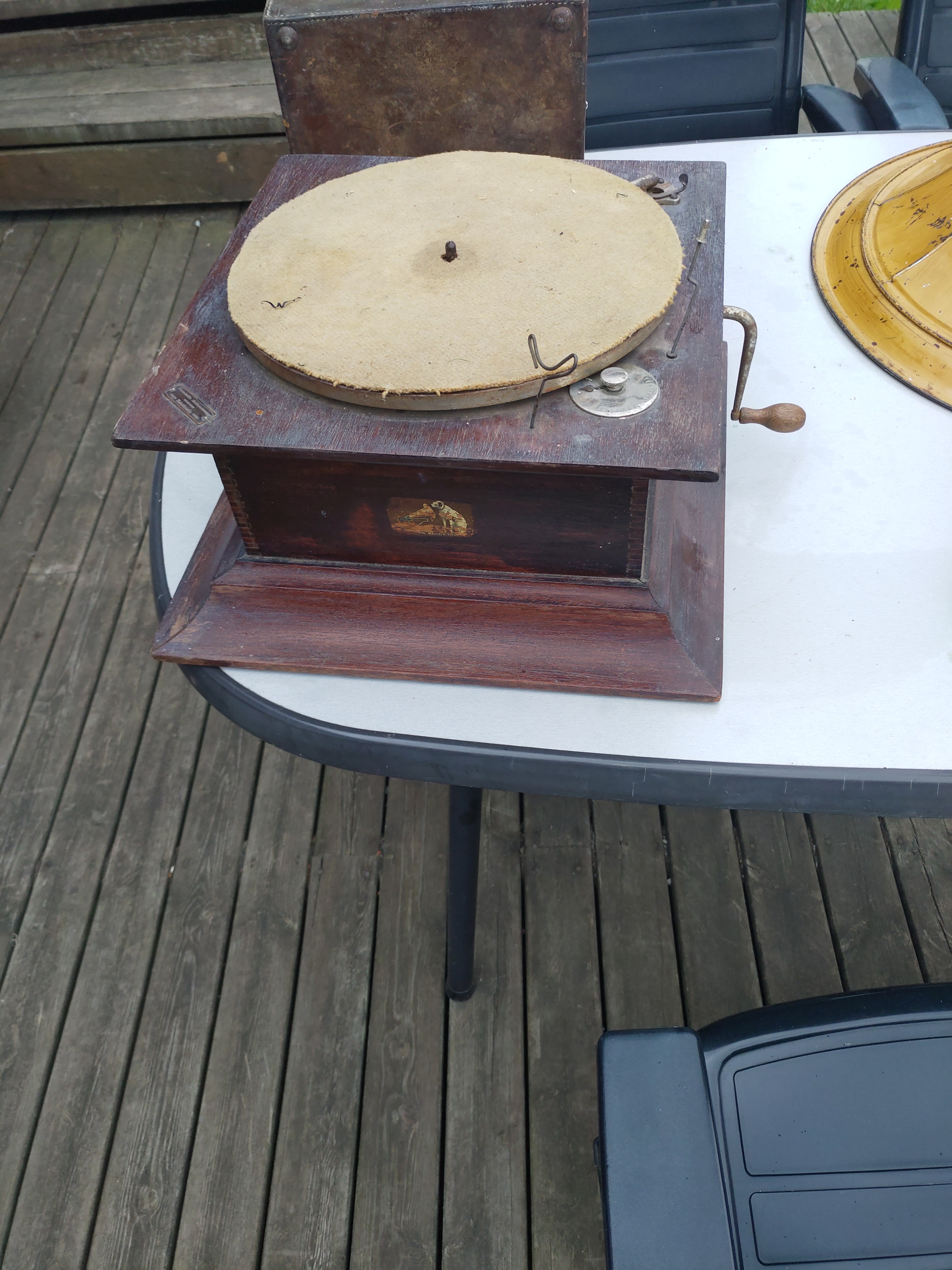 The horn on the photo, is bigger than it looks on the photo, its diameter is 58 cm, and according to the seller it has belonged to the machine shown below. As told in another thread ( I am terribly at mixing subjects lately), I bought the horn for my my HMV school model, and this seller offered me the Decca, and just when I was about to leave her premises, she asked if I wanted the rest of the gramophone that the horn had belonged to for free. She was anyway going to put it on the landfill she told me. I said yes, I would love to have it without having seen it, since maybe some parts could be salvaged and used for future repairs etc.