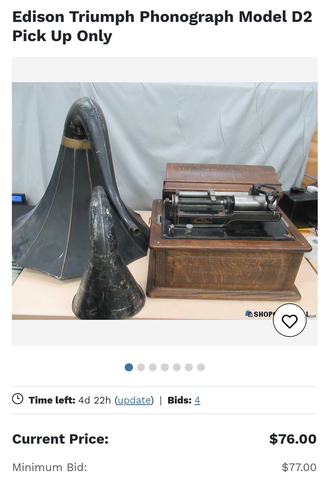 WOW what a buy. That is a nice complete phonograph with an extra horn for a Amberola . If I lived with in a couple hundred miles I would bid. It is a far trip from Calif.