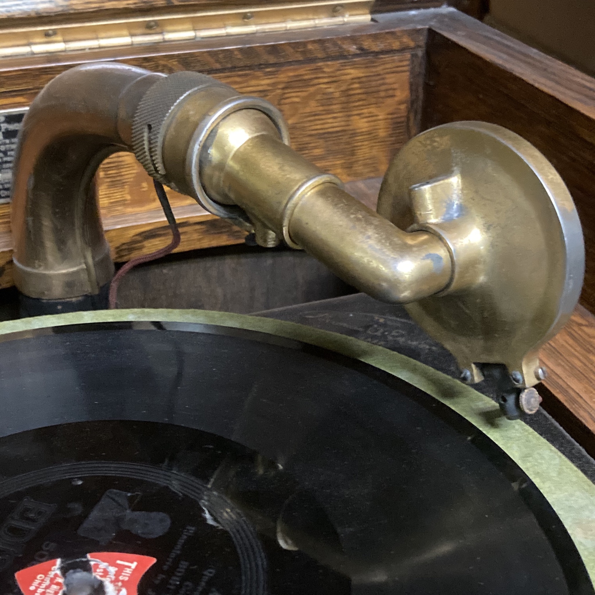 Here is an unusual convertible Edison Diamond Disc adapter in Gold wash that is capable of playing lateral cut 78’s, vertical cut 78’s, and Diamond Discs.