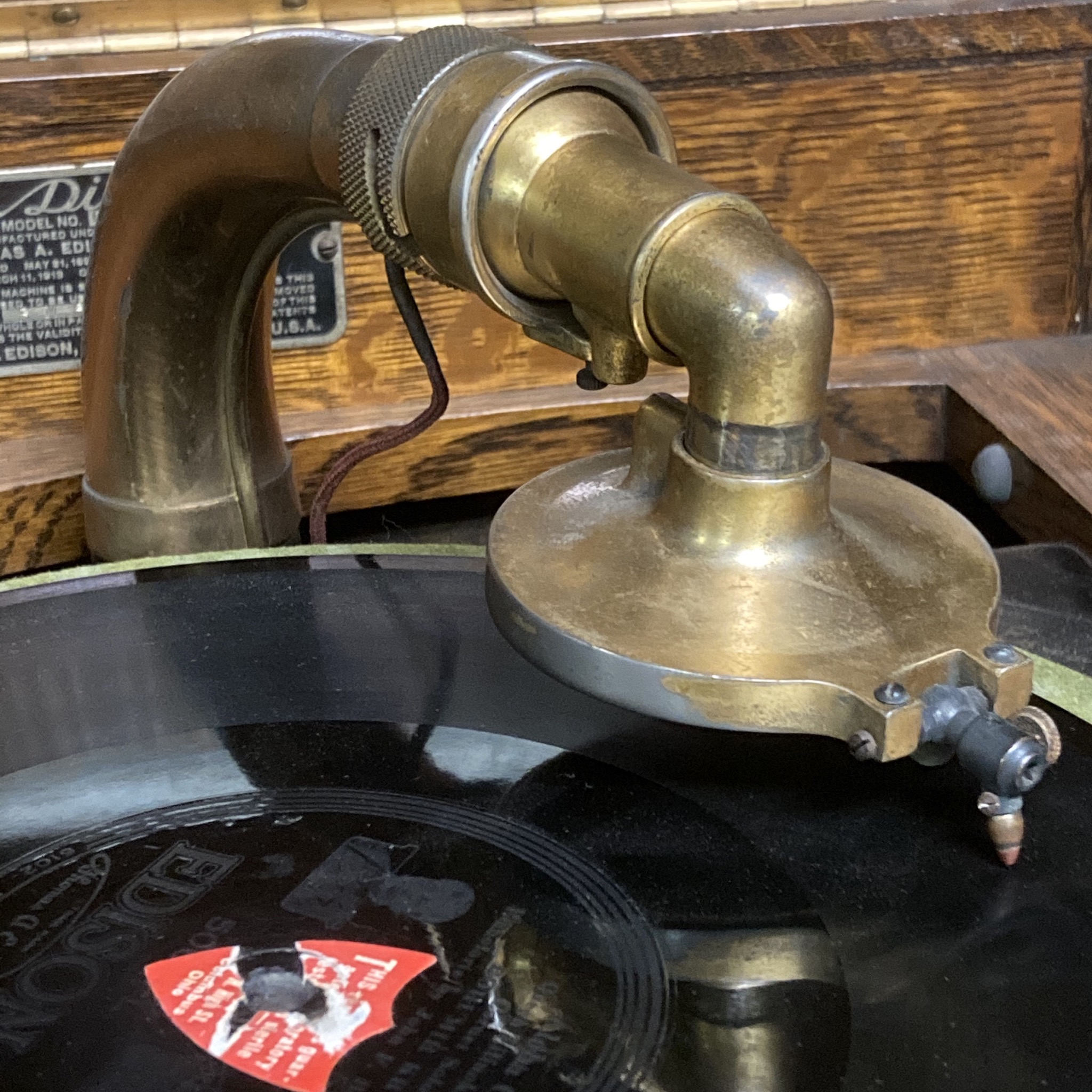 The reproducer appears to be entirely original, including still supple rubber gaskets. In the accessory needle chuck is a good stylus, set in a shank, for Diamond Disc playback. As you can see, unlike Pathé-style vertical cut reproducer attachments, this reproducer can orient its diaphragm parallel to the turntable, a la a Diamond Disc reproducer or the few aftermarket DD-only reproducers.