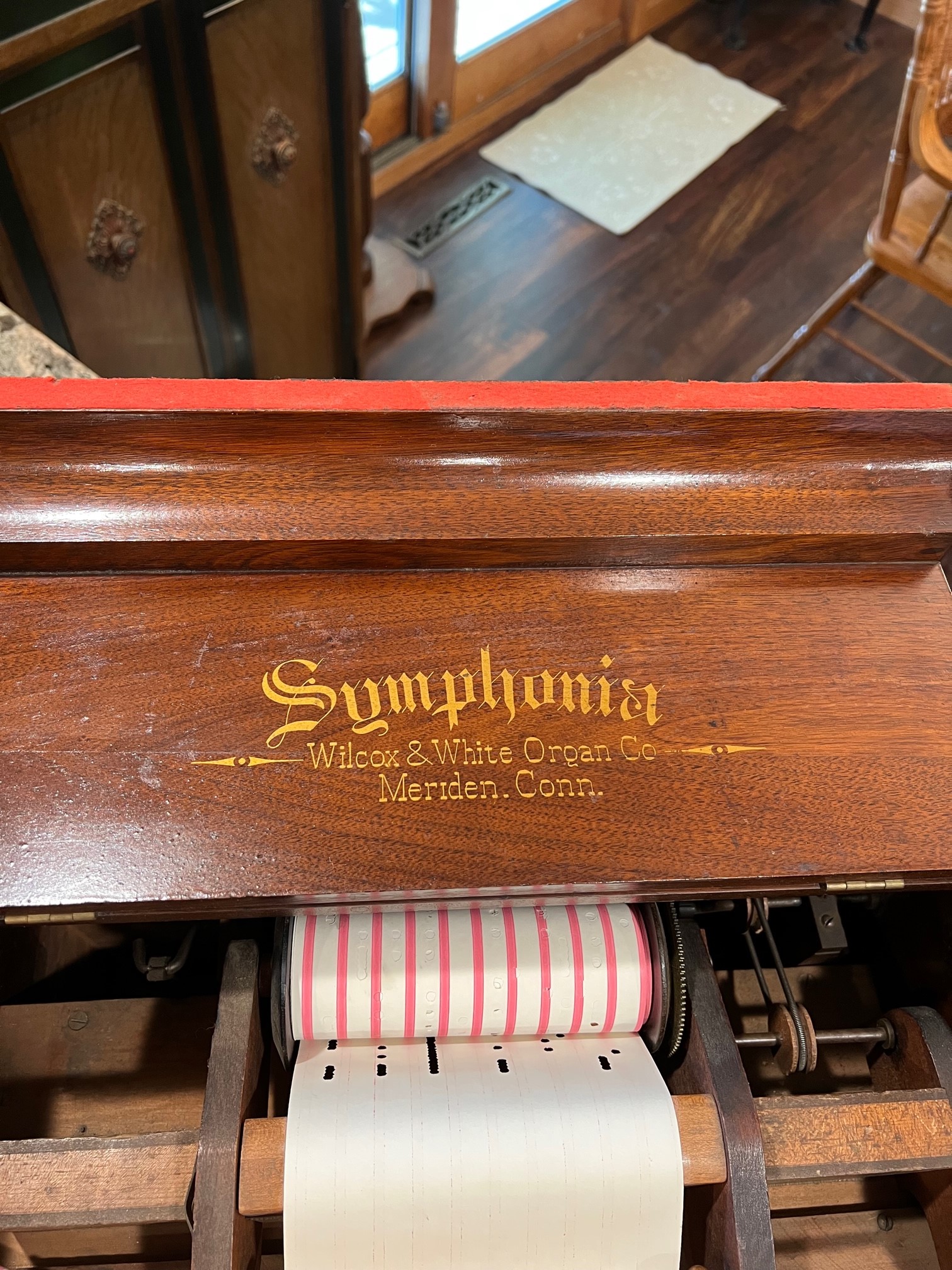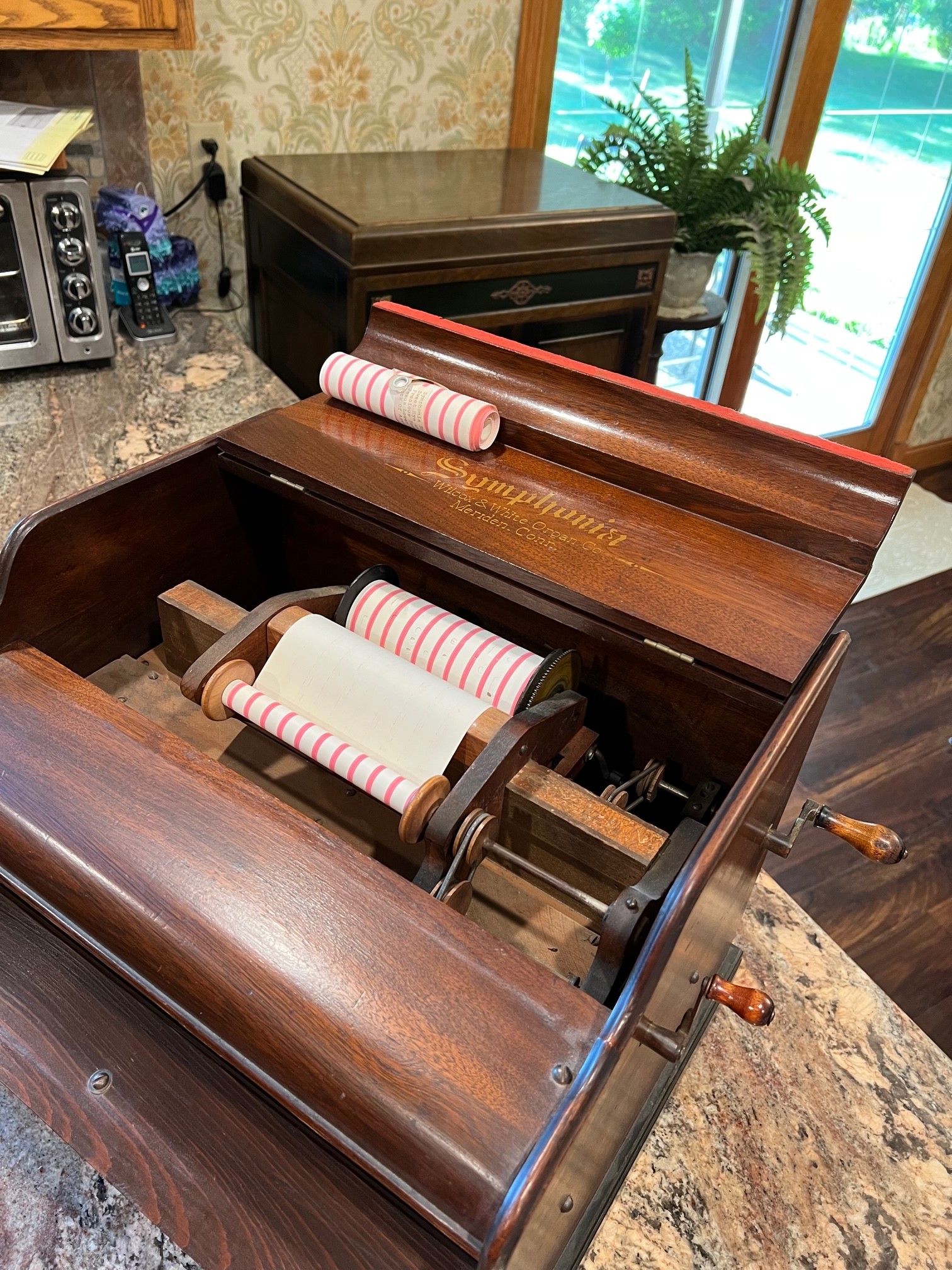 I recently purchased a Symphonia Paper Organ. I would like to find some more rolls for it. Also, I need to find out how to re-wind the rolls. I can't figure out how to release the main crank drive to allow the smaller re-wind crank to re-wind the roll. Any advice would be appreciated.